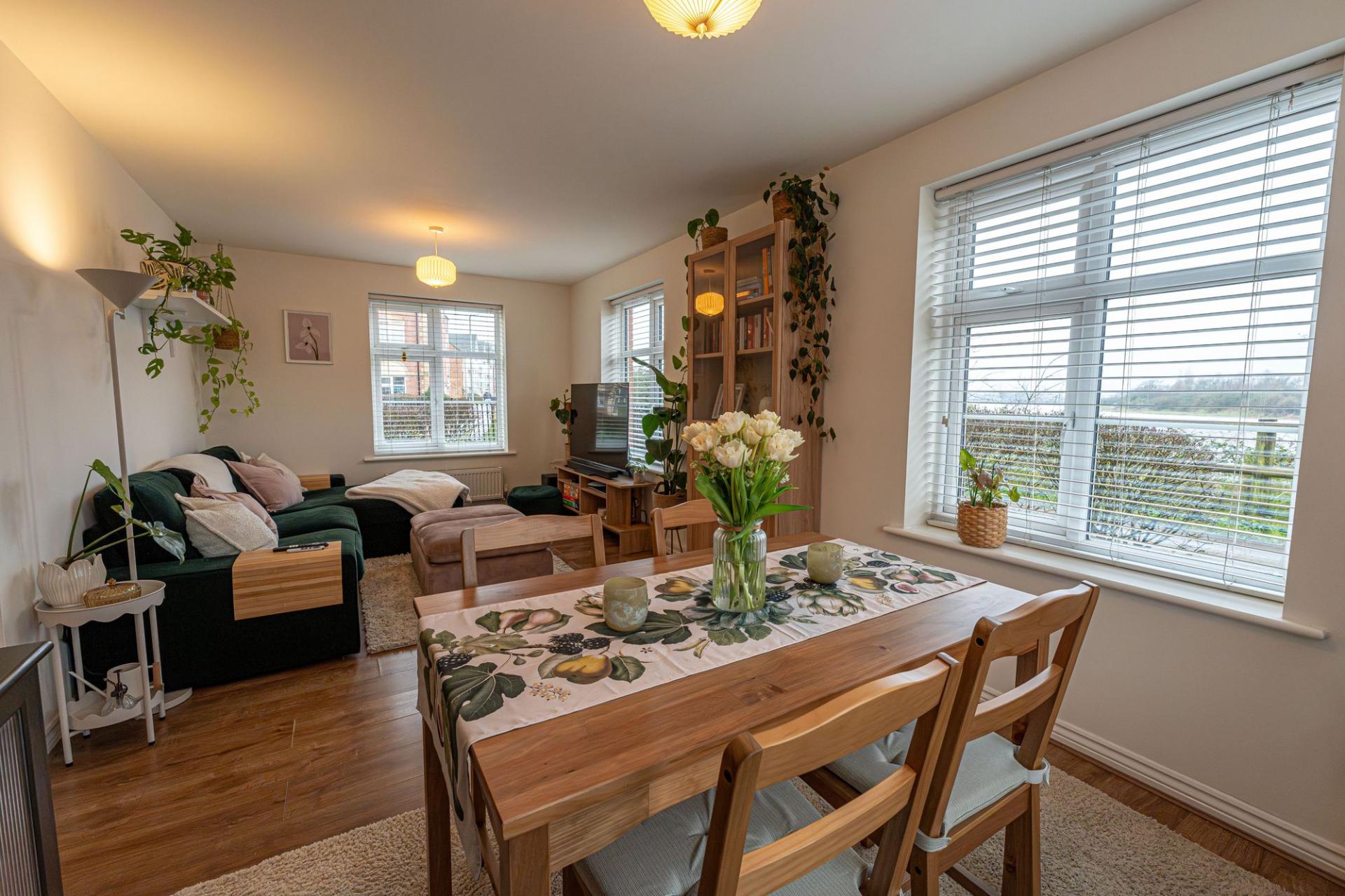 This two-bedroom flat is ideal for a first time-buyer, young couple, or anyone with a busy lifestyle after low maintenance living. The apartment comprises of an open plan living room and dining area, with several windows to allow plenty of light to flow into this sociable space, while capturing picturesque river views. The stylish kitchen features integrated appliances to name a four ring gas hob, oven and washing machine. The kitchen has also been newly fitted with ceramic wood effect tiling on the floor, and tiling on the walls. There are two bedrooms, both of which are spacious doubles, with views of the communal garden space. There is also a bathroom fitted with a bath suite and overhead shower unit. A large cupboards from the hallway allow plenty of space for storage and there is one allocated parking space directly outside, along with further visiting spaces.