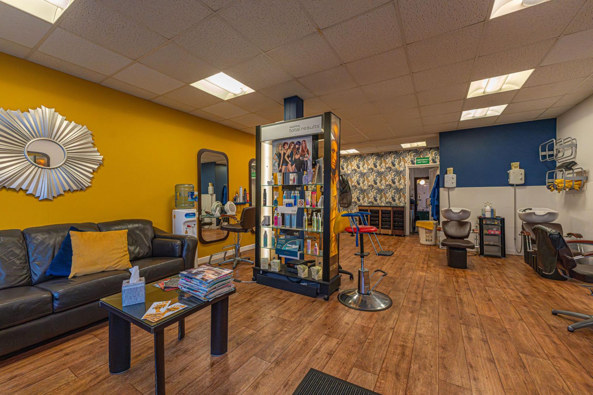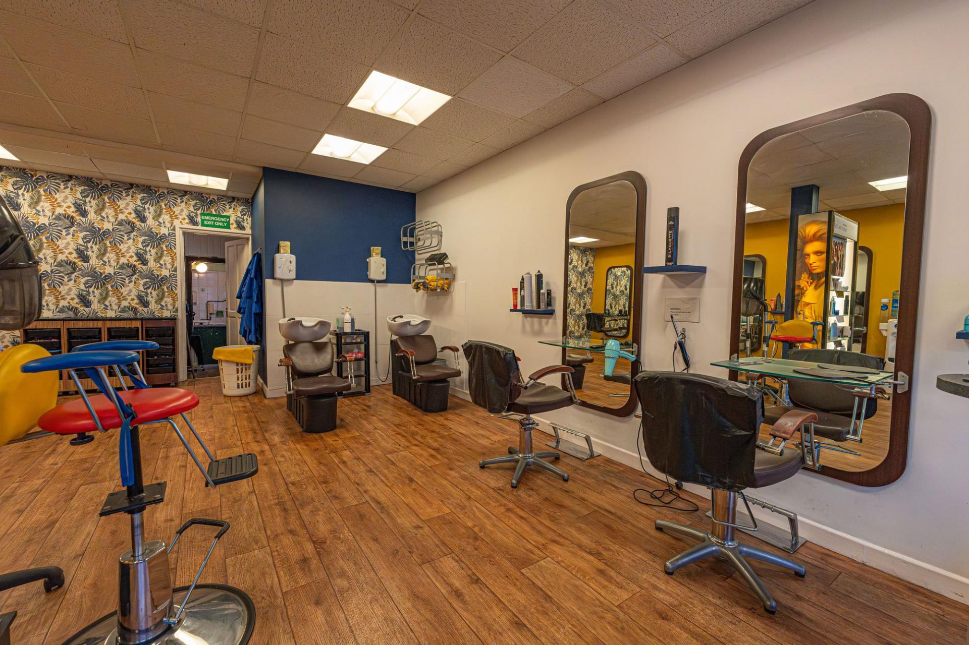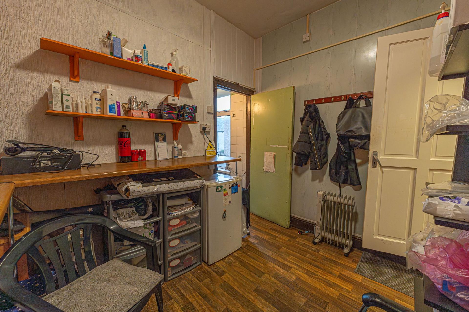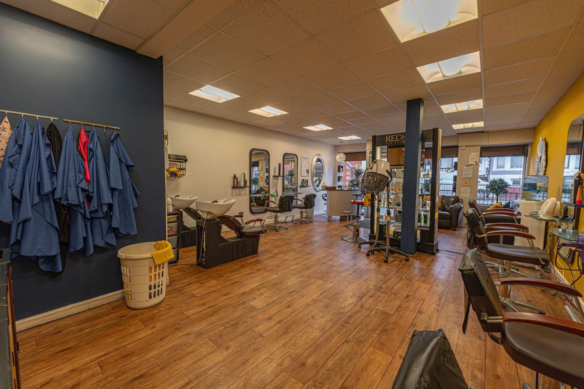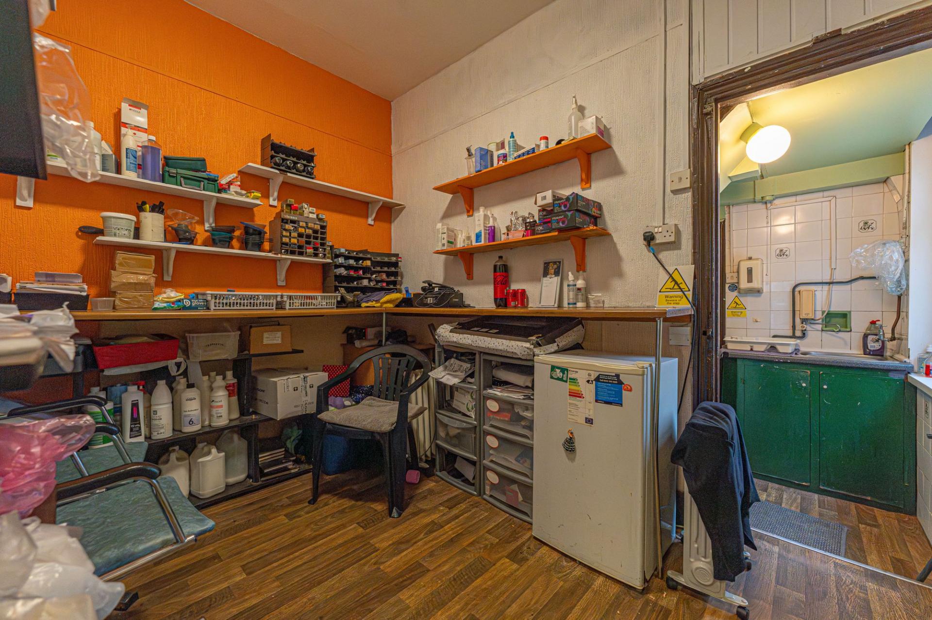 On the ground floor of the property we have the main business space, which features an extensive shop floor, complete with a waiting area, reception desk, and a large array of salon chairs, mirrors, and equipment. The shop floor features large windows at the front of the house to flood the room with light, as well as several overhead light fixtures. Continuing through the premises we have a well sized store room, and a practical kitchen, before taking a staircase down to the sizeable basement, offering a huge amount of versatile storage space to make use of, as well as a W.C and a doorway to the rear of the property.
