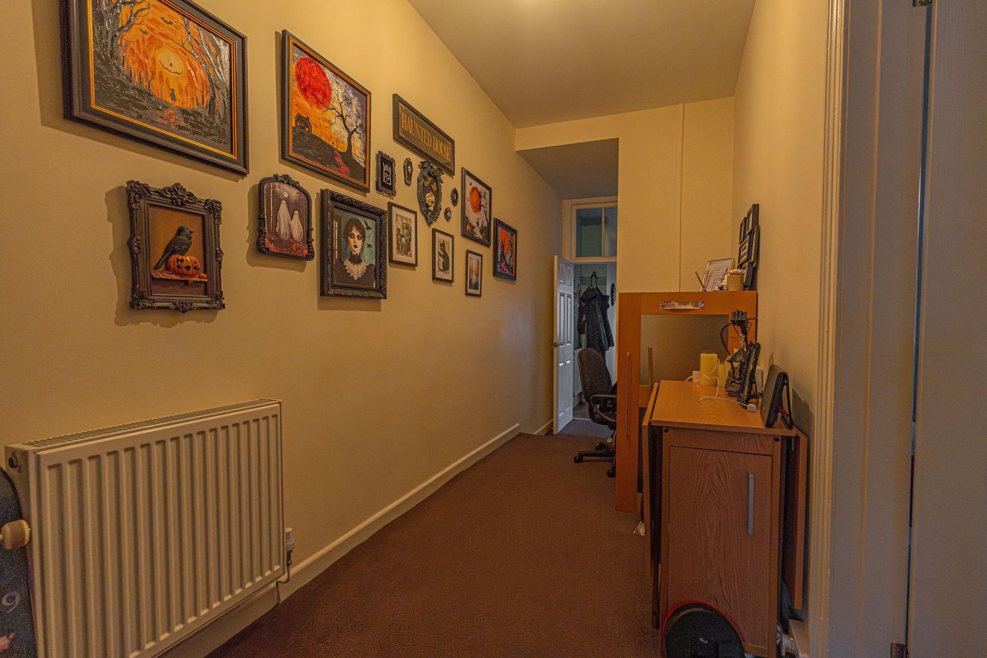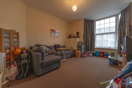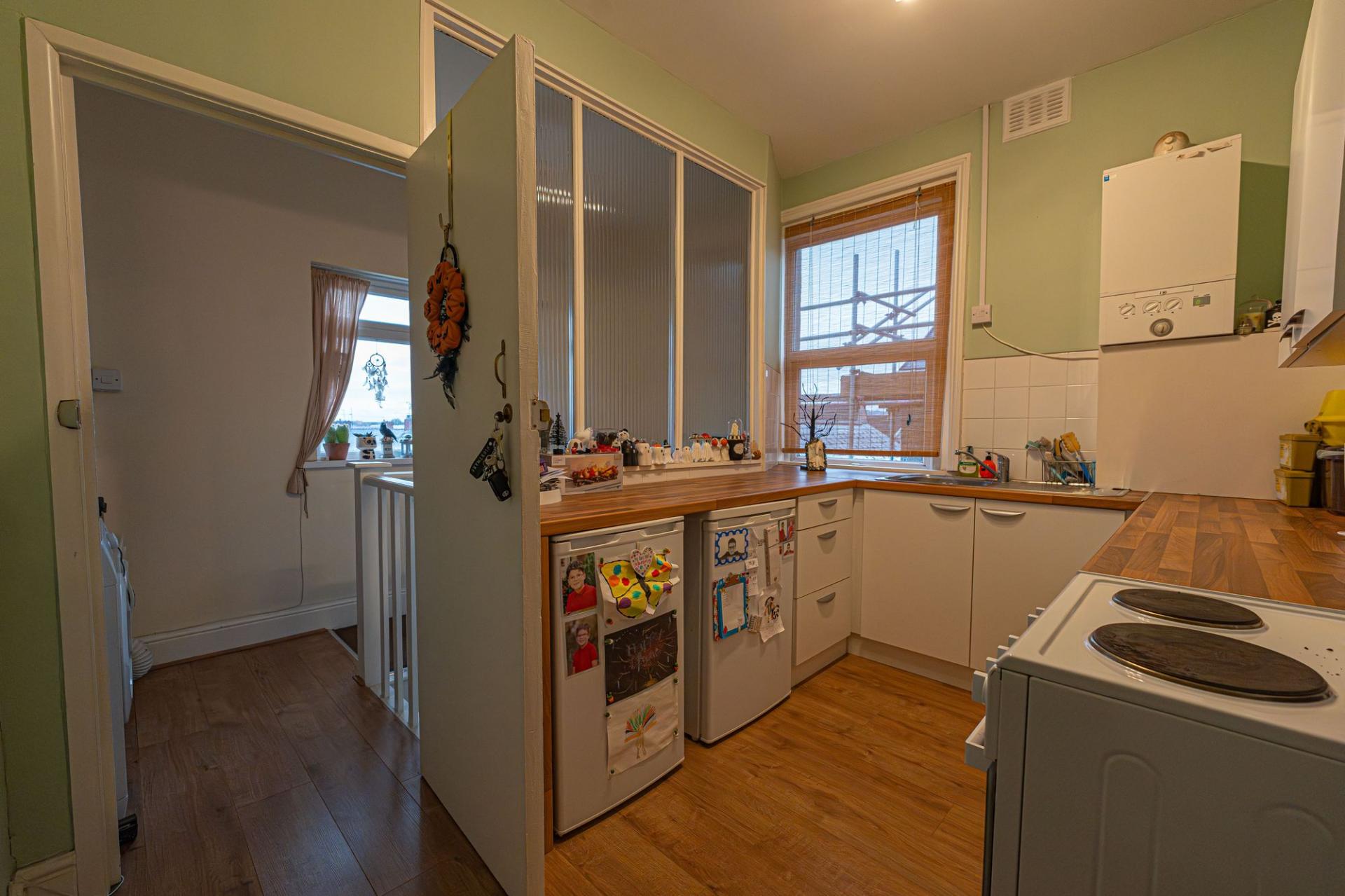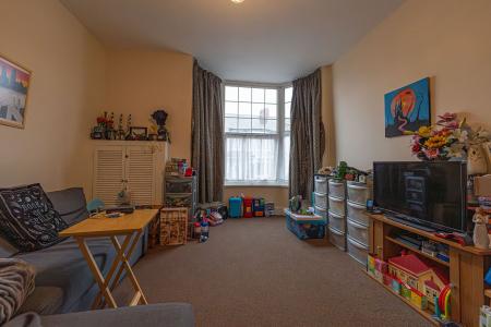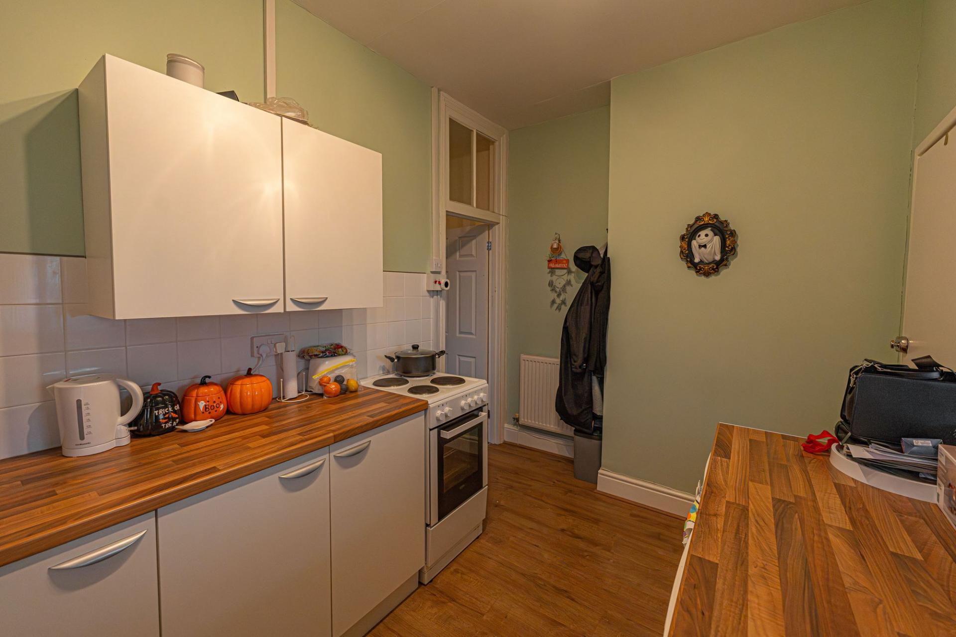 From here we can find a dedicated entry point to the apartment above, with a staircase taking us up into the well equipped kitchen, which features ample storage, counter space, and room for numerous appliances. Continuing through the apartment hallway we arrive at living room which is lit up by a bay fronted window, while we can find two bedrooms either side of this reception space, one of which being a generous double, and the other a cosy single. The apartment also features a bathroom with a shower over bath suite.