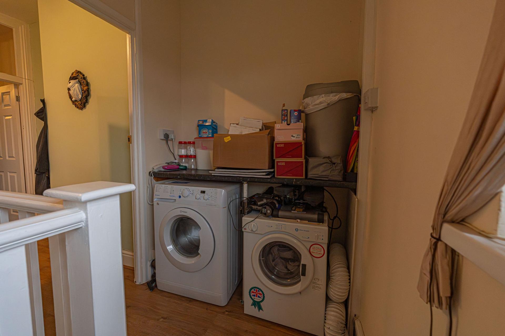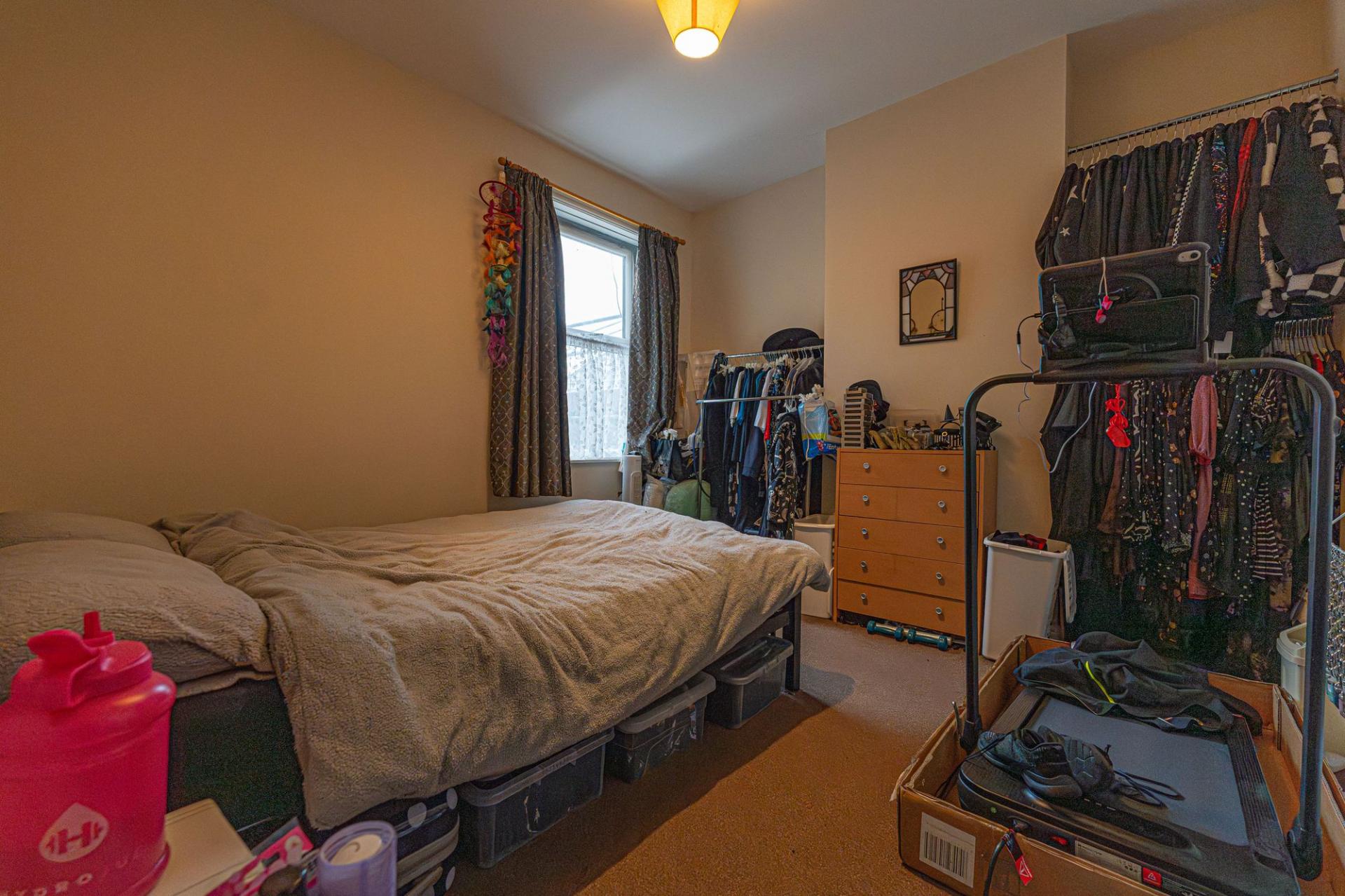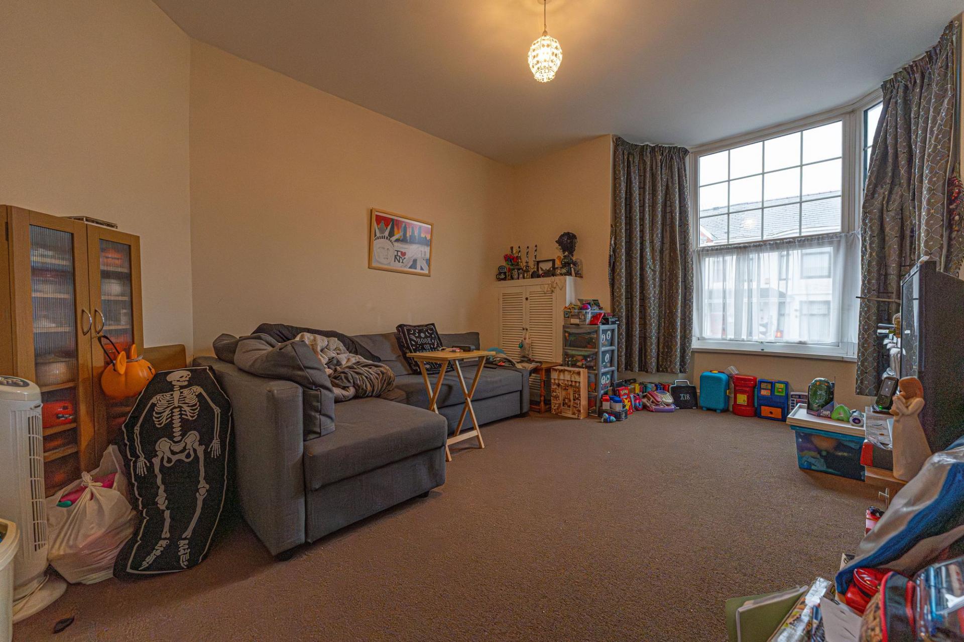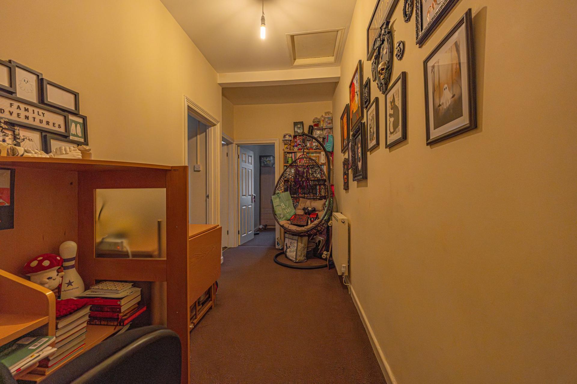 From here we can find a dedicated entry point to the apartment above, with a staircase taking us up into the well equipped kitchen, which features ample storage, counter space, and room for numerous appliances. Continuing through the apartment hallway we arrive at living room which is lit up by a bay fronted window, while we can find two bedrooms either side of this reception space, one of which being a generous double, and the other a cosy single. The apartment also features a bathroom with a shower over bath suite.