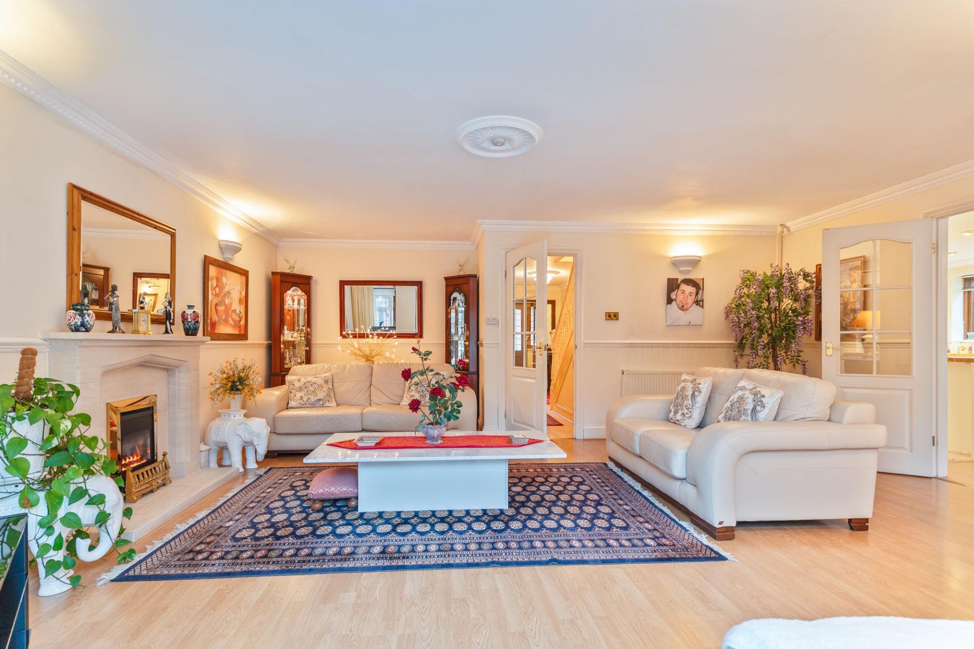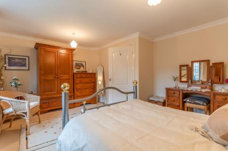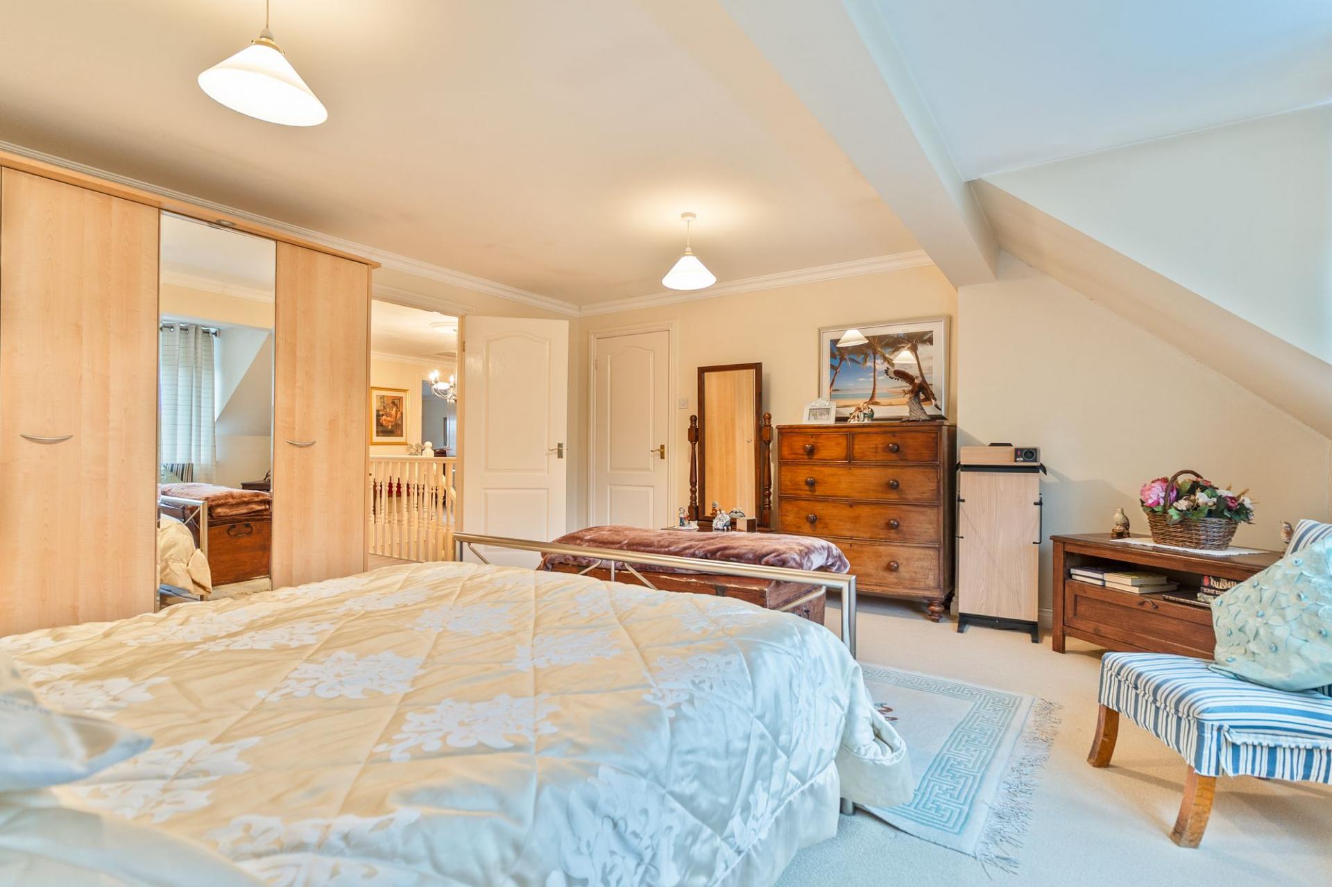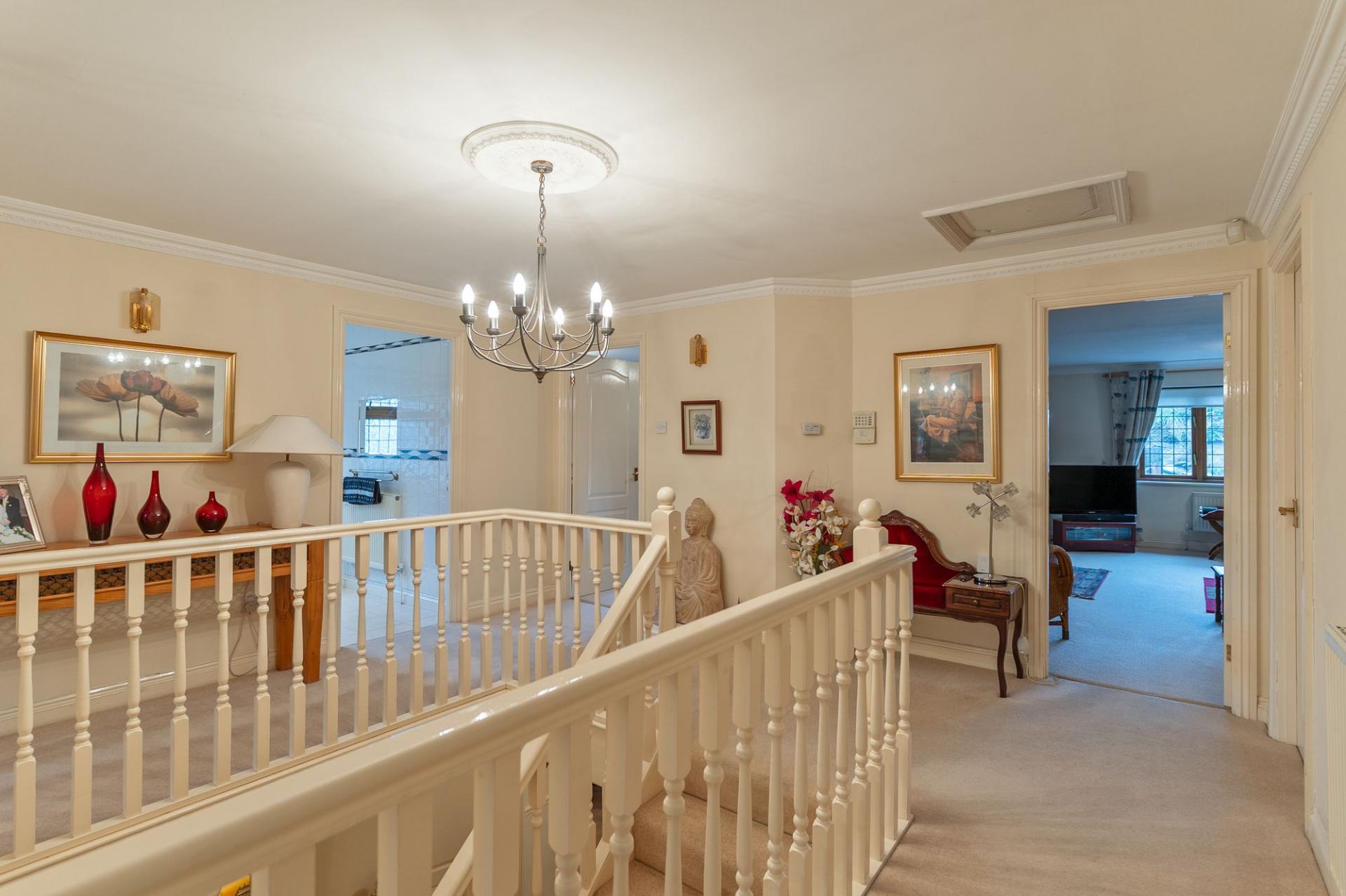 The first floor features a grand landing leading to four generously sized double bedrooms, all offering excellent proportions and flexibility for family living. The primary bedroom further benefits from its own dressing area and a well-appointed en-suite bathroom. The remaining bedrooms are served by a spacious family bathroom.