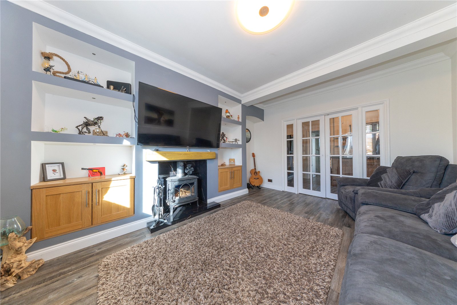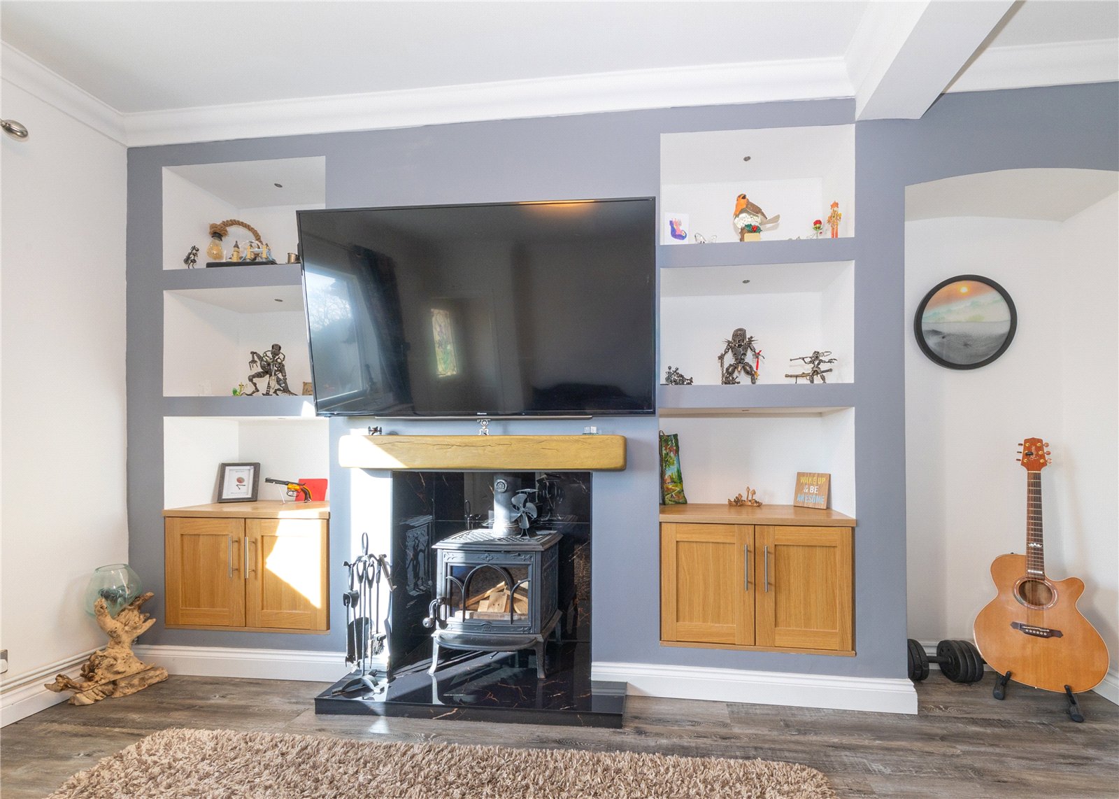 Upon entering, a hallway separates the sitting room from the stairs leading to the first floor. The sitting room is light and well-proportioned, offering ample space for furnishings and featuring a character fireplace with fitted storage on either side. Double doors open from the sitting room into the kitchen/breakfast room, creating a lovely flow through the ground floor.
