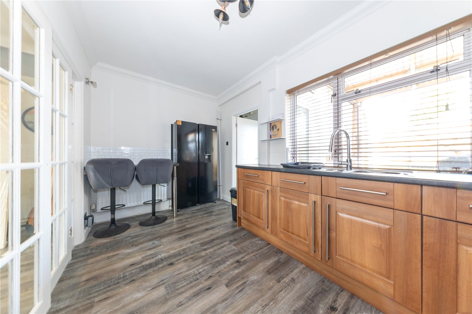 The kitchen/breakfast room is a fantastic space, featuring a fitted kitchen complete with integrated appliances including a dishwasher, electric hob, and oven. Ample storage is provided through thoughtfully designed units, along with space for an American-style fridge freezer. The breakfast bar comfortably seats two and provides a perfect spot to enjoy meals.