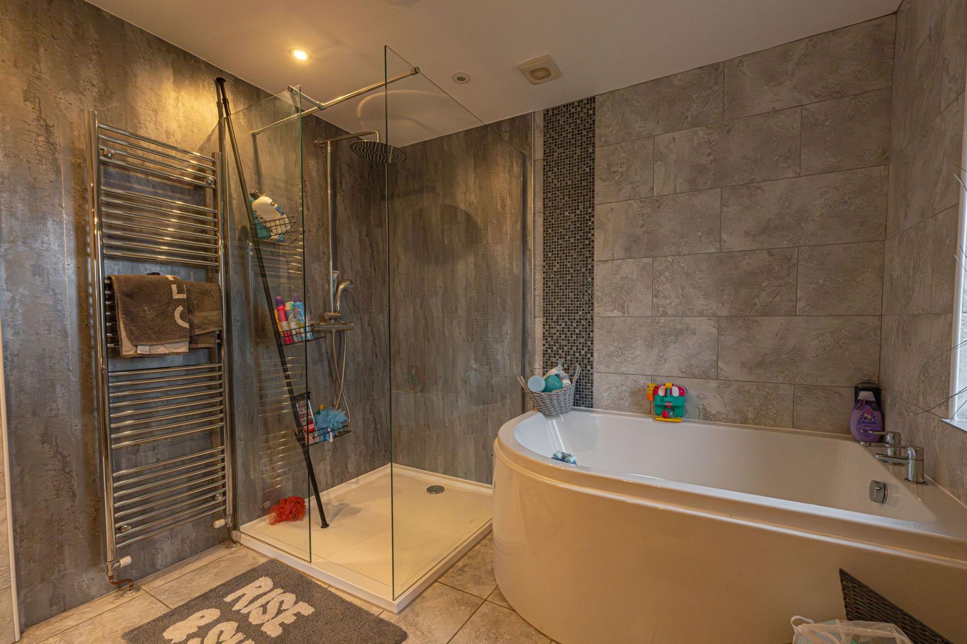 Ascending to the first floor we can find four bedrooms which are all fitted with spotlights and can all accommodate double beds, with more than enough space for repurpose into a home office, dressing room or a nursery. The primary bedroom enjoys a superior size, and has the added benefit of direct access into the properties second bathroom, which impresses a spacious and sleek design, while offering a corner bath, and a separate rainfall shower. The bathroom can also be accessed communally from the hallway, where we can find another fitted cupboard and a snug lounge area, perfect for reading and relaxing.