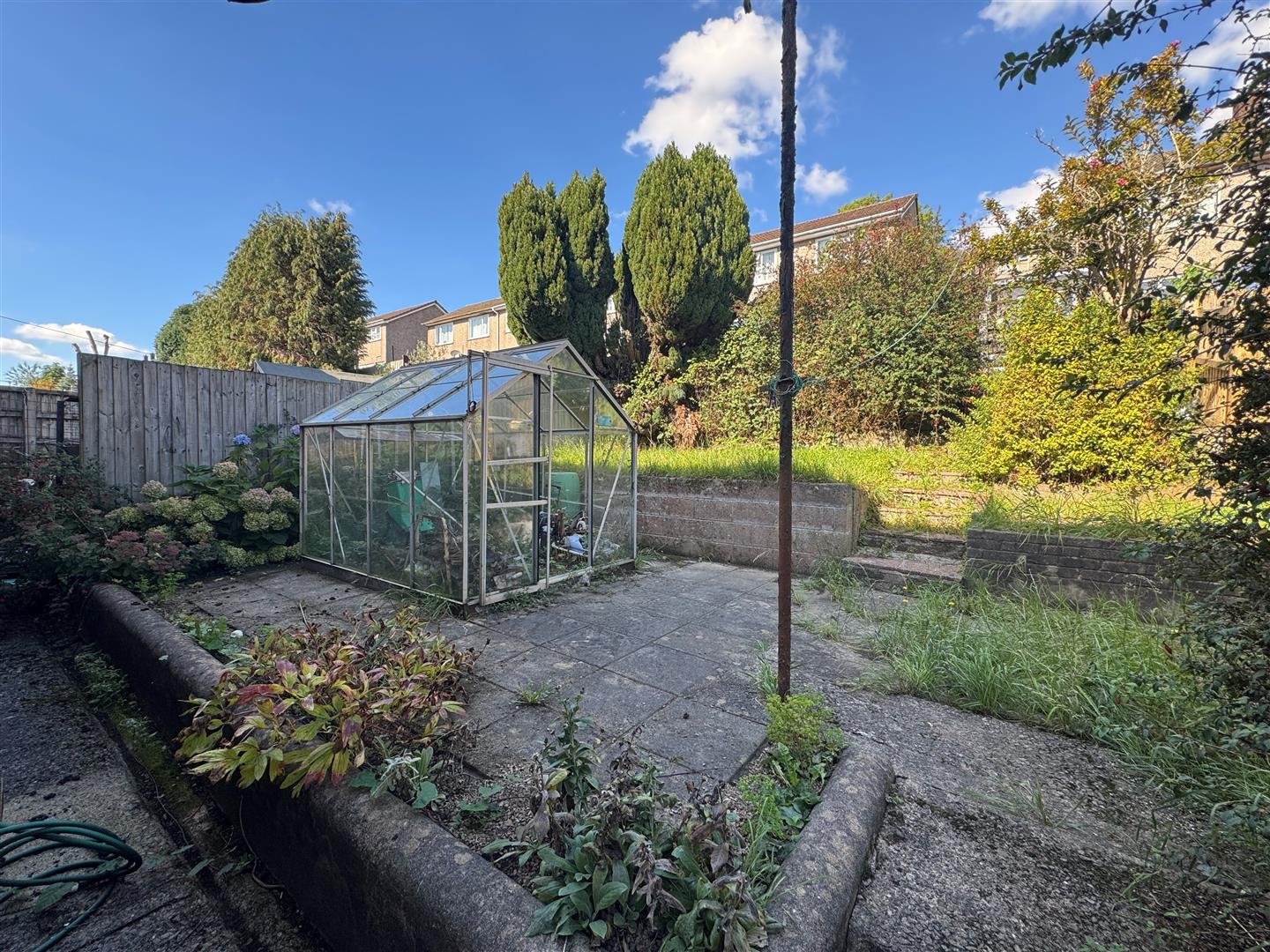 To Rear: Paved patio area, grass lawn area, large shrubbery hedges and some flower beds, glass green house.