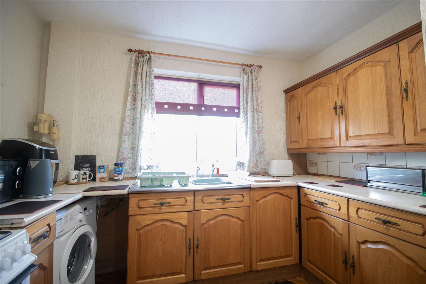 Kitchen - 3.1 x 5.32 (10'2" x 17'5") - UPVC double glazed windows to rear and side, double glazed door to side, matching base and wall units, roll edge worktop, stainless sink with drainer and mixer tap, tile splash back, textured walls and ceiling, radiator, power points.