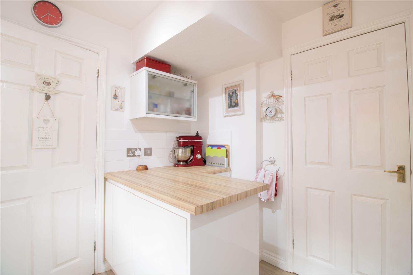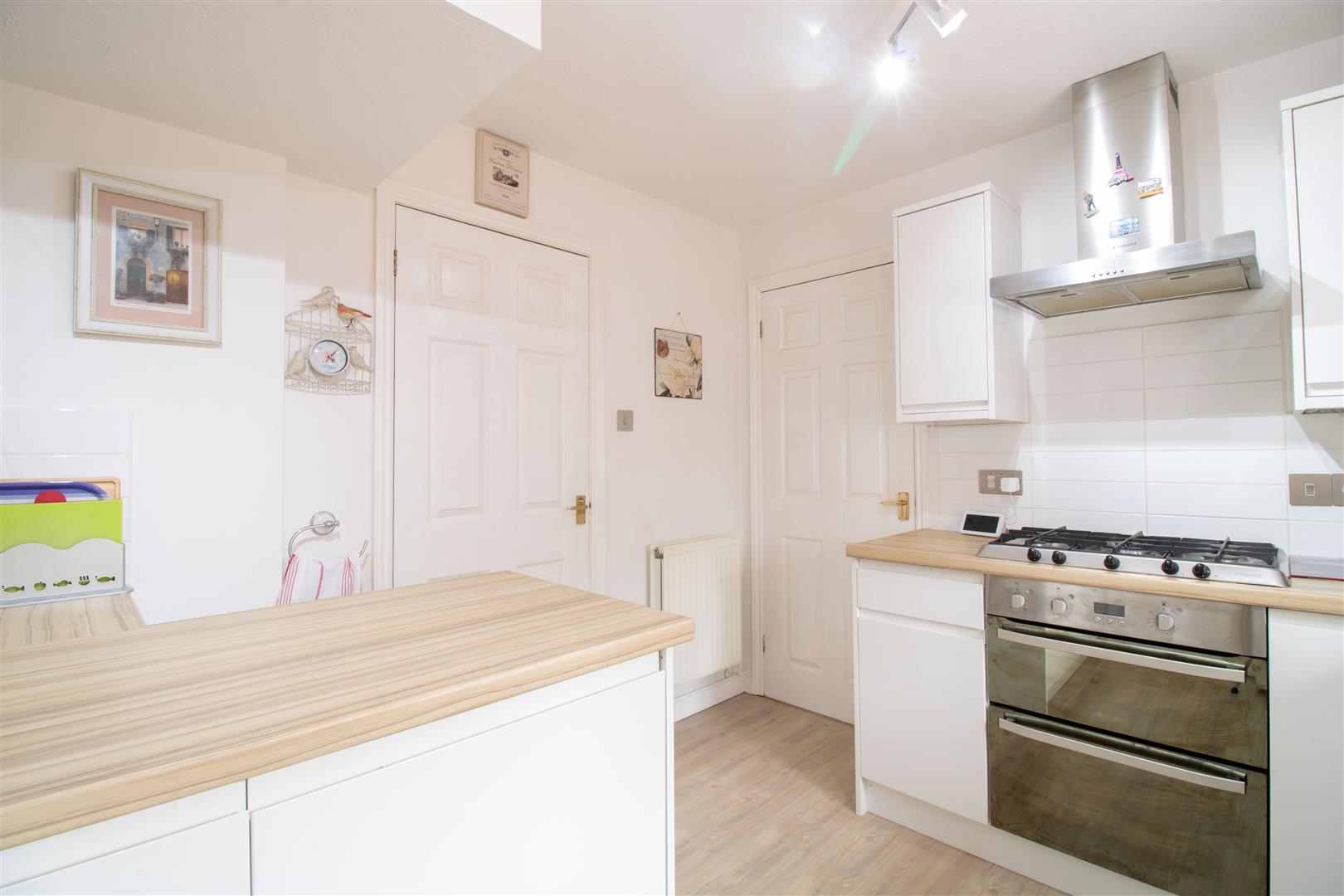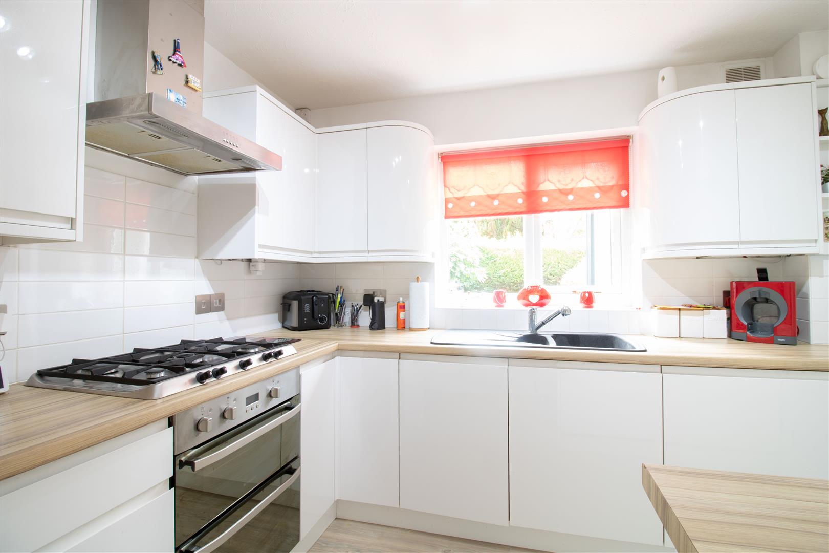 Kitchen - 2.94 x 2.86 (9'7" x 9'4") - UPVC double glazed window to rear, matching high gloss base and wall units, roll edge worktop, integrated double electric oven and five burner gas hob, sink with drainer and mixer tap, plastered walls, tile splash back, textured ceiling, vinyl floor, radiator, power points.