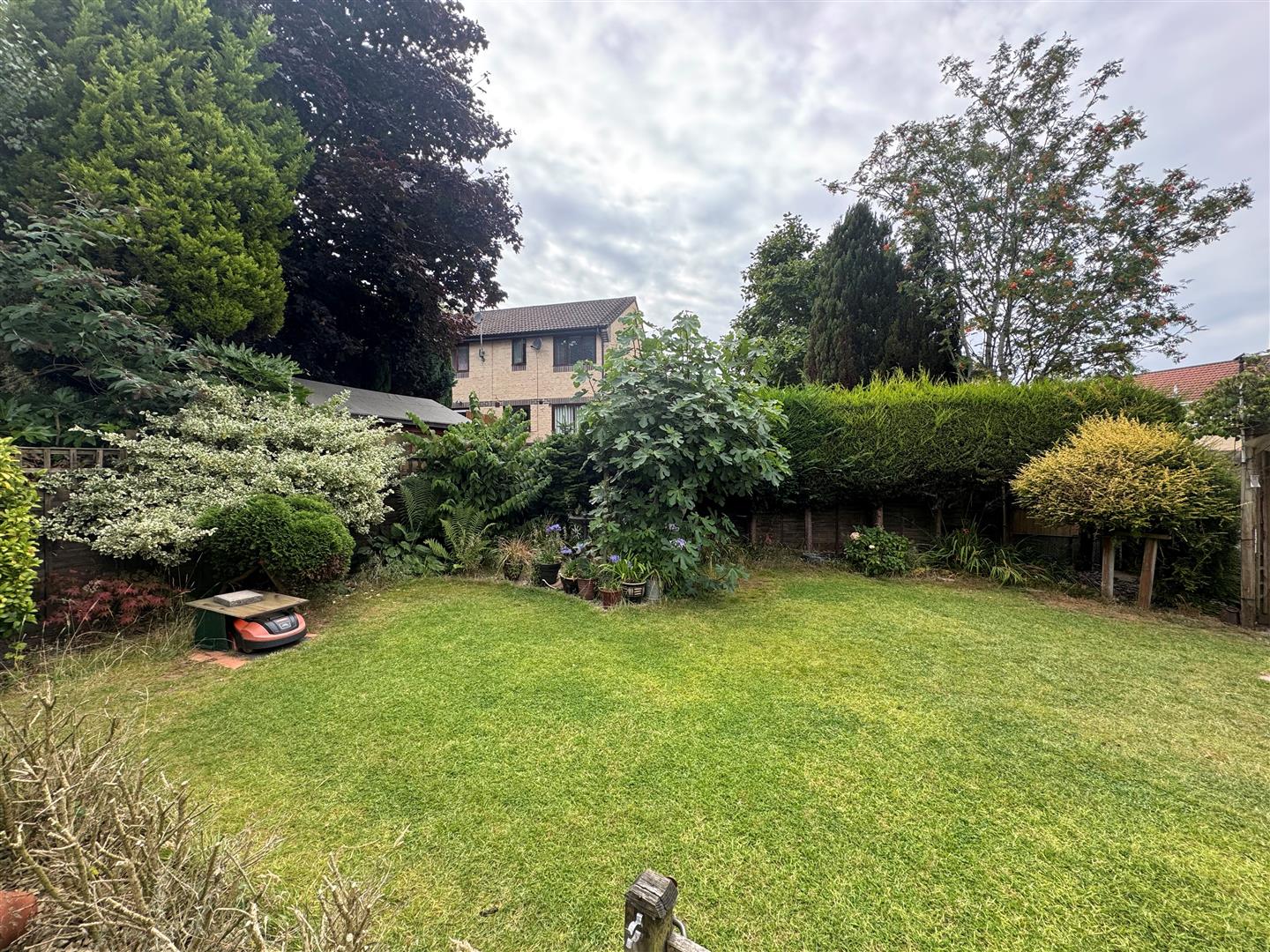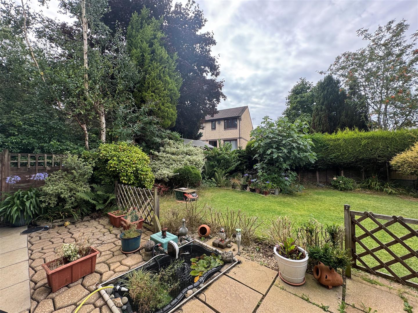 To Rear: Paved patio area with small sunken pond, grass lawn area, hedging, shrubbery and flowers.