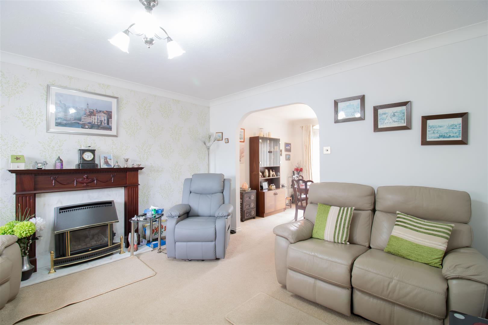 Lounge - 4.03 x 3.84 (13'2" x 12'7") - UPVC double glazed bay window to front, wallpapered and plastered walls, textured ceiling, gas fire with feature surround, carpet to floor, radiator, power points.