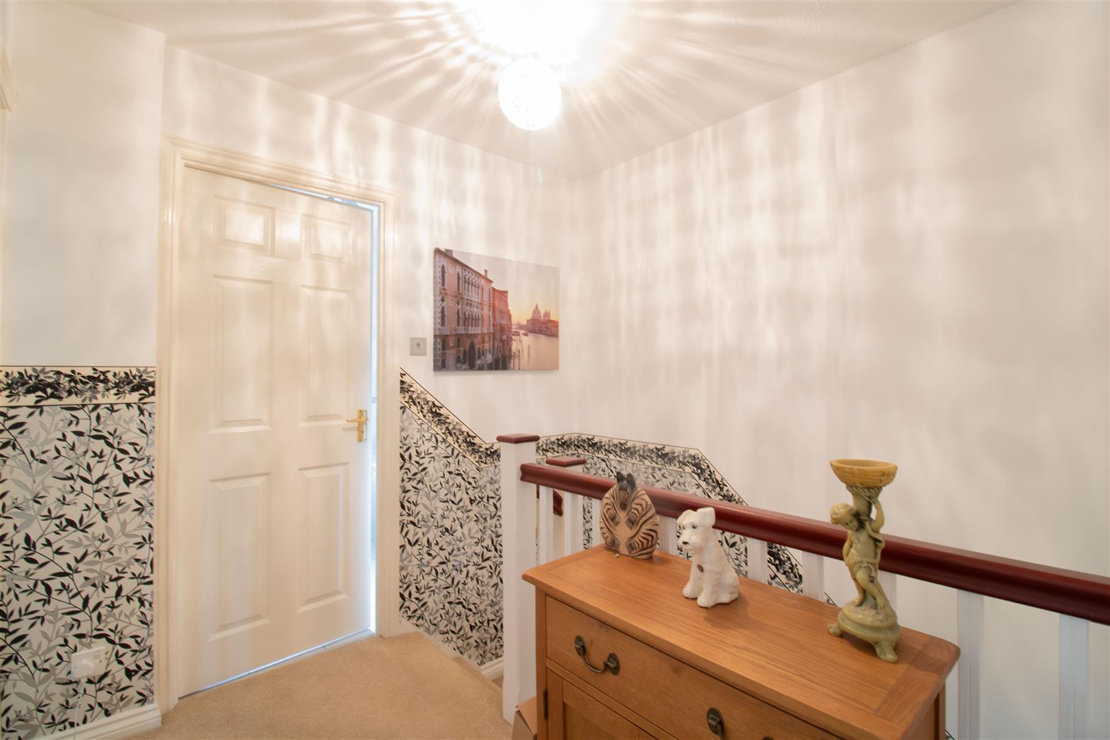 Landing - Wallpapered and plastered walls, textured ceiling, carpet to floor, power points.