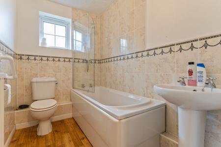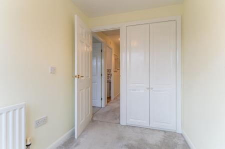 On the first floor, the property offers three bedrooms — two comfortable doubles and a single room. The primary bedroom benefits from built in wardrobes and a private en-suite shower room, while the remaining bedrooms share access to the family bathroom, fitted with a modern white suite including a bath, WC, and hand basin. Each bedroom is well-presented, offering bright and comfortable accommodation for family members or guests.