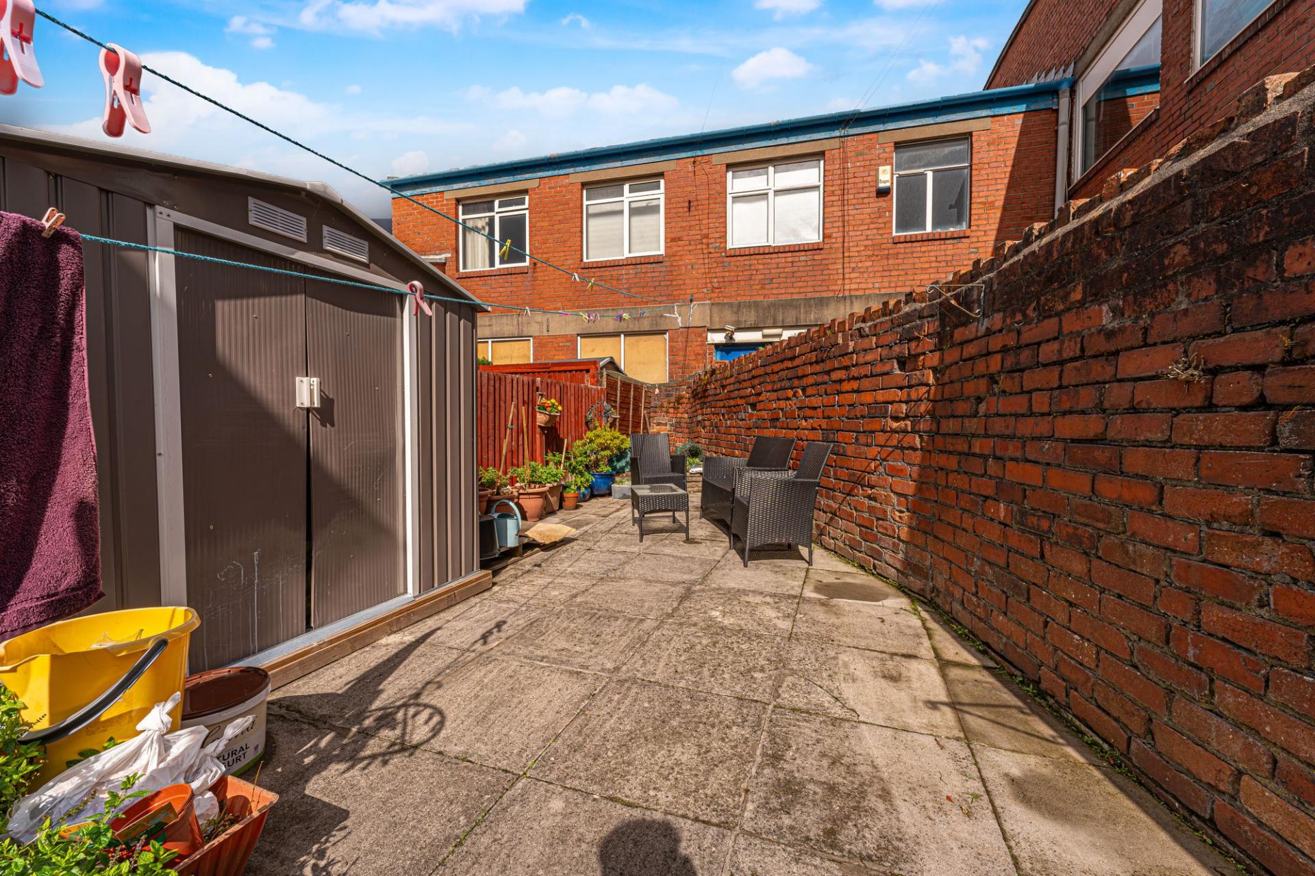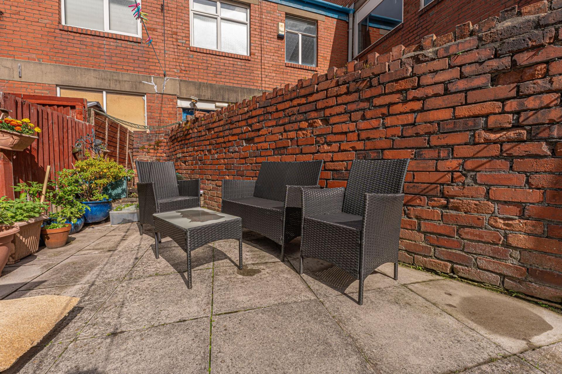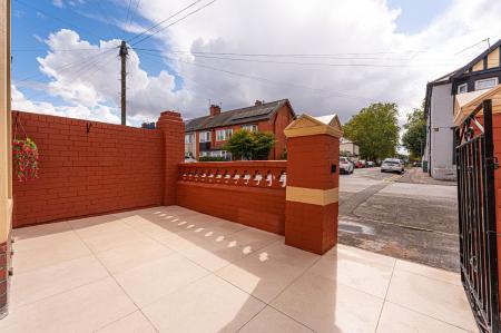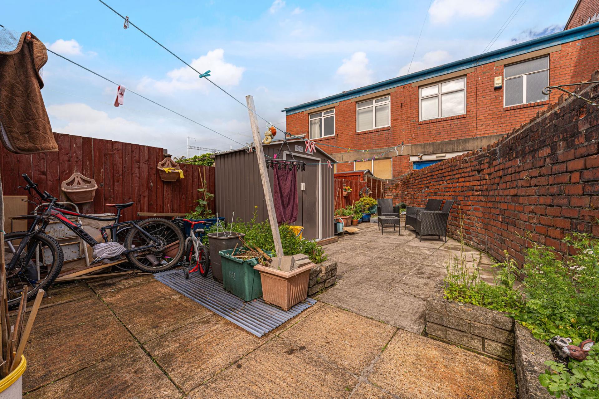 The low maintenance gardens can be accessed from here, which are entirely patio, with a raised bed to the rear for planting and a garden hose pipe. The garden further benefits from a convenient garden shed installed last year and garden table and chairs, offering plenty of space for relaxing in the fresh air, and catching up with friends and family over tea/coffee or dining al-fresco style. From the garden we can also access a convenient W.C and a exterior store room, while at the front of the house there is another lovely patio space, perfect for another outdoor lounge or ideal for storing bins. On street parking is available to the street beyond, along with electric car charging points located outside the property.