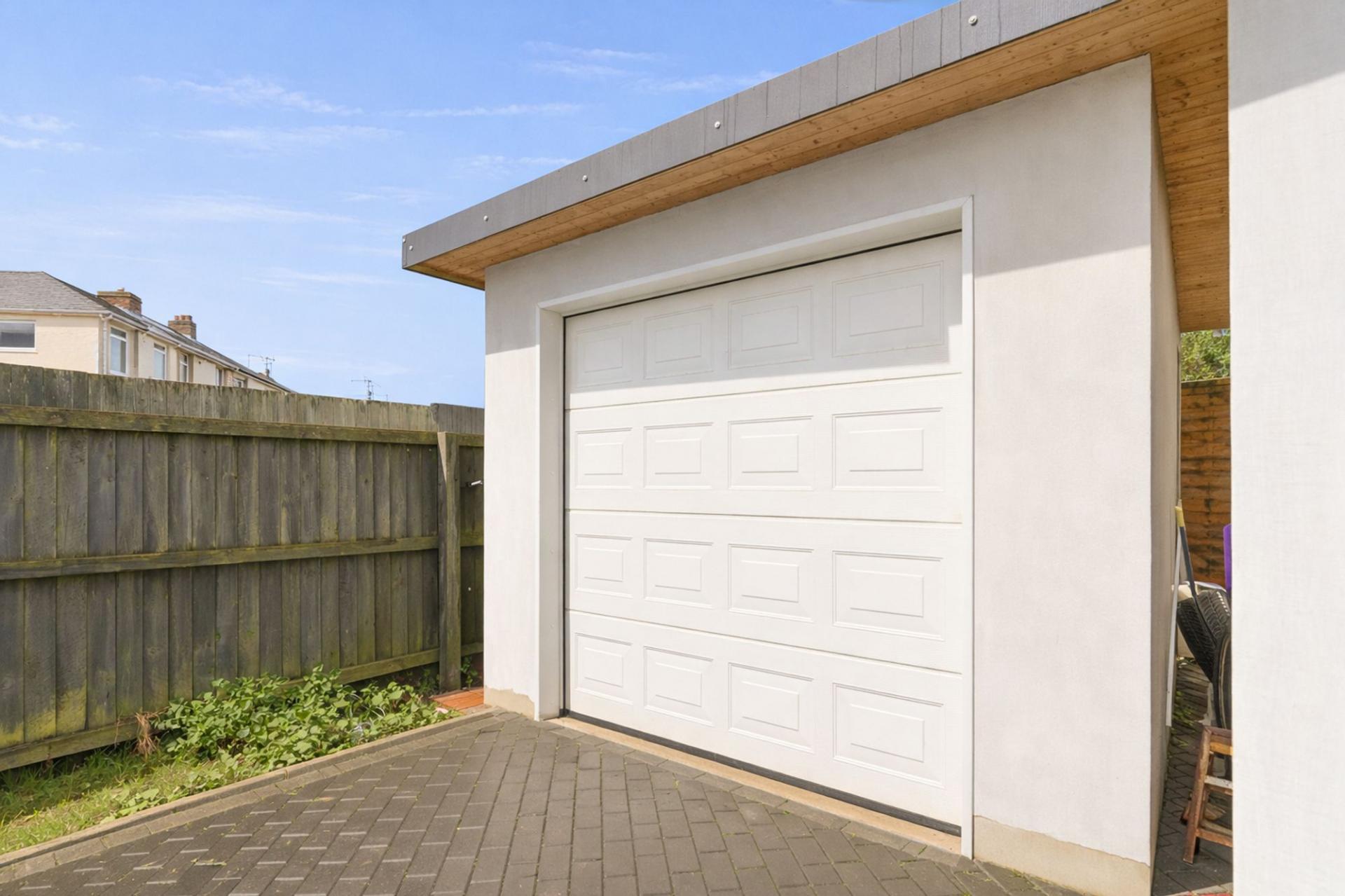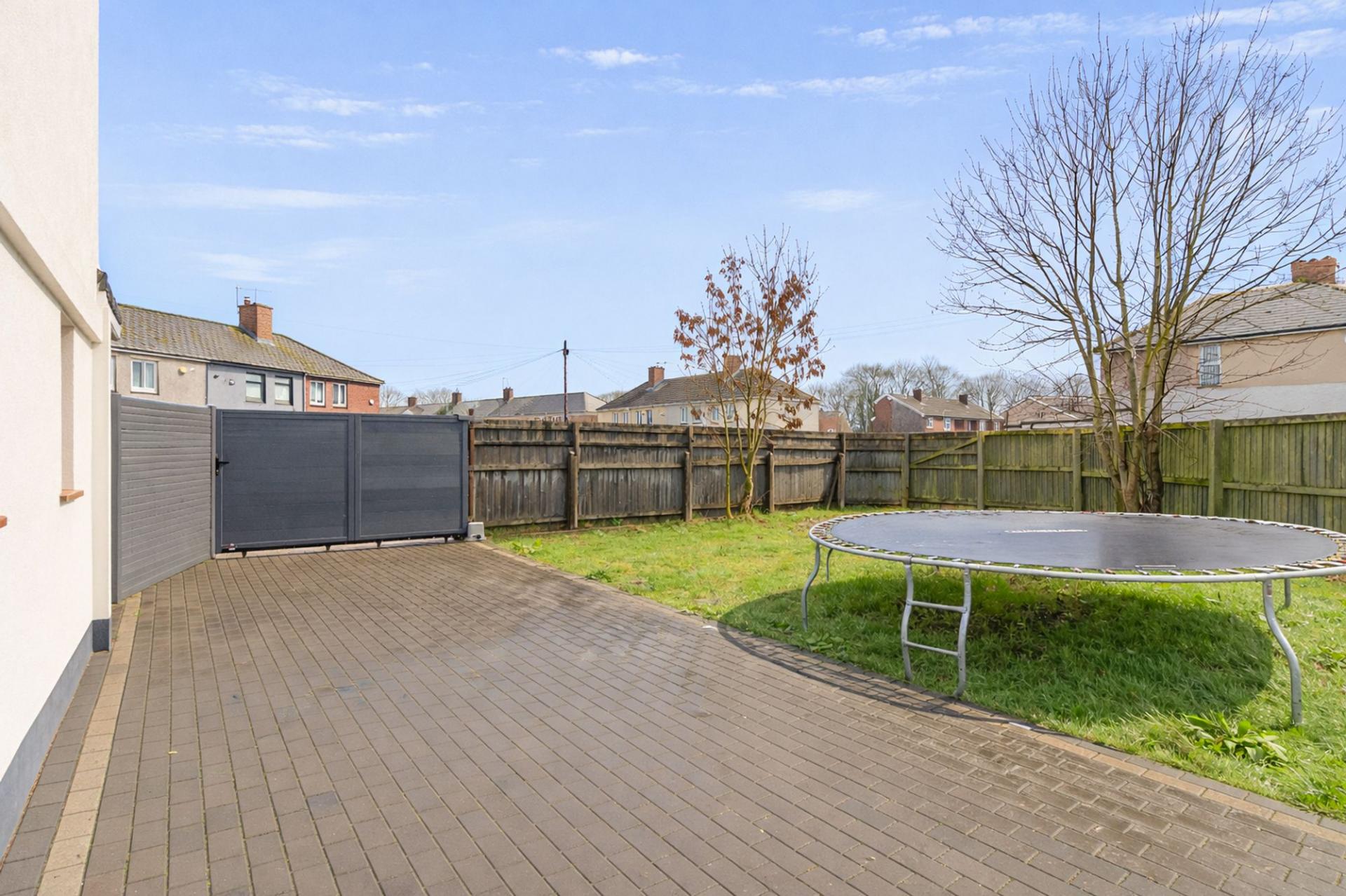 Externally, to the front of the property is gated access to a driveway, which leads to a garage, providing off-road parking and additional storage. Along the side of the property is a generous lawned area, offering further outdoor space and potential for landscaping or family use.