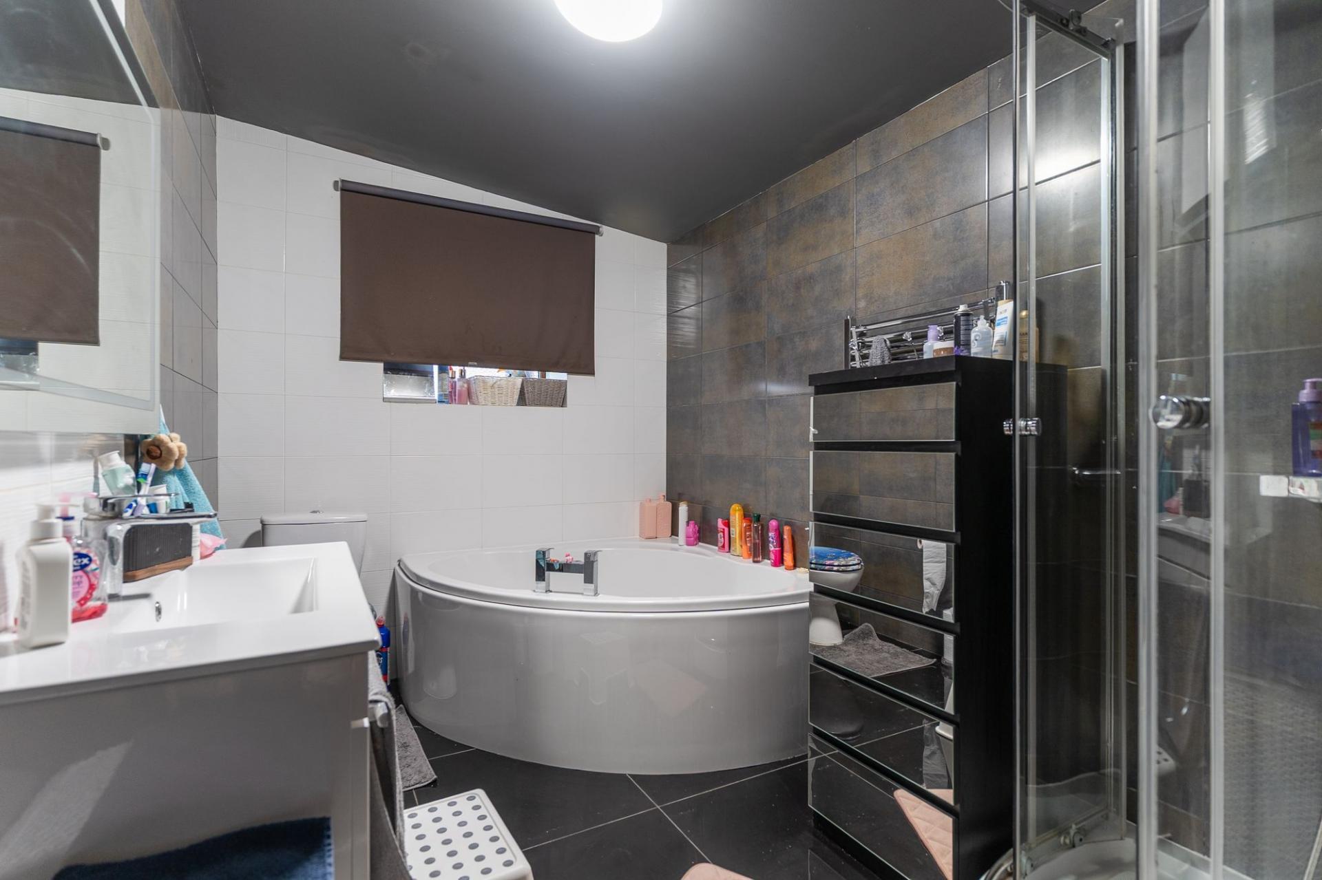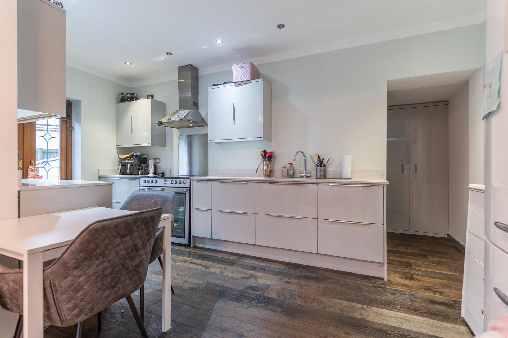 You enter the property through an initial hall space, with the staircase ahead leading to the first floor and access into the main living area. The ground floor offers a bright and spacious open-plan layout, creating a modern and sociable environment. The lounge provides ample room for seating and flows seamlessly into the contemporary kitchen, which is fitted with a range of wall and base units and offers space for dining furniture. To the rear of the property is the large family bathroom, featuring both a corner bath and a separate shower, providing flexibility for busy households.