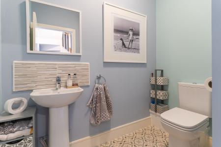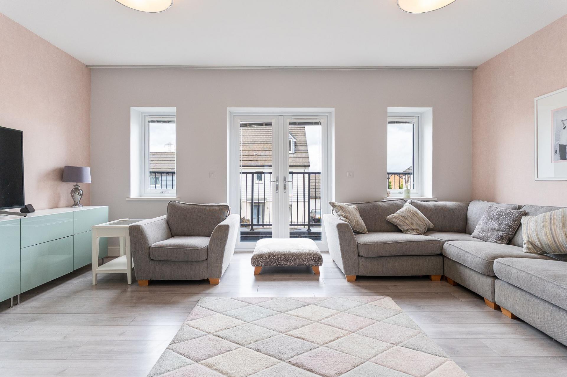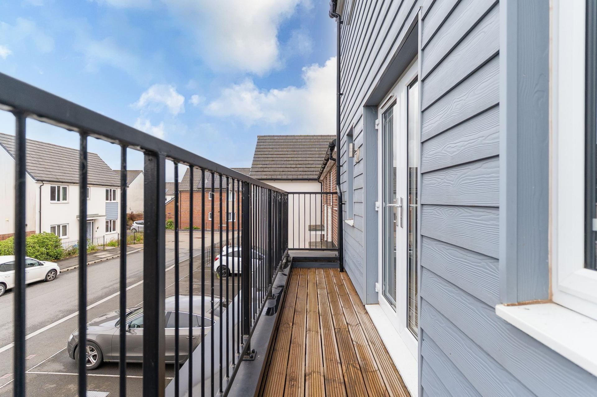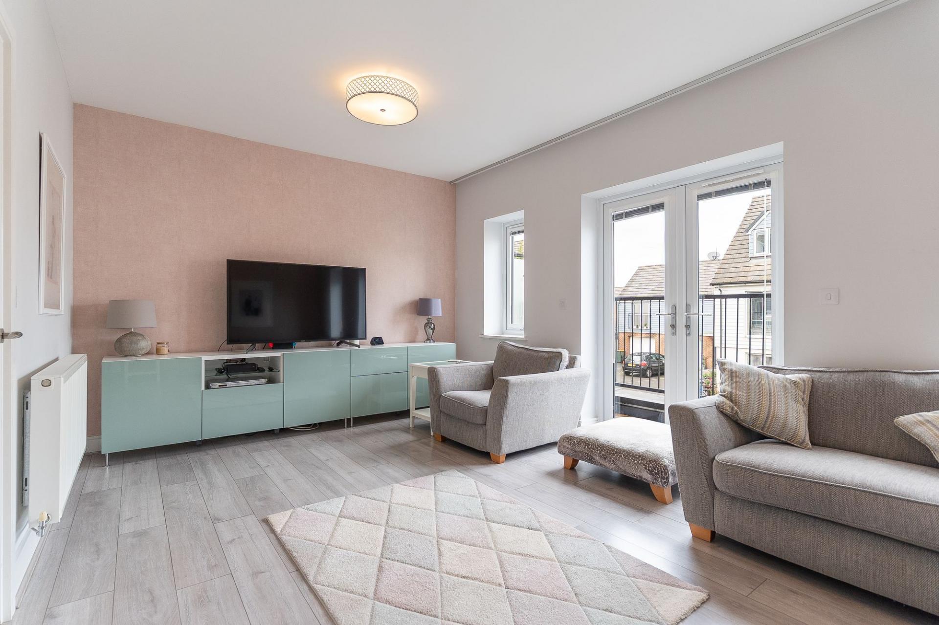 The first floor is designed for comfortable living and entertaining. To the front of the property is a generous living room, beautifully presented and naturally bright, with patio doors opening out onto a front-facing balcony — a perfect spot for enjoying a morning coffee or evening sunset. To the rear is a spacious open-plan kitchen/diner, fitted with modern cabinetry and integrated appliances. There is ample space for a family dining table, and Juliet balcony doors allow for further natural light and views over the garden. A convenient cloakroom is also located on this floor, adding to the practicality of the home.