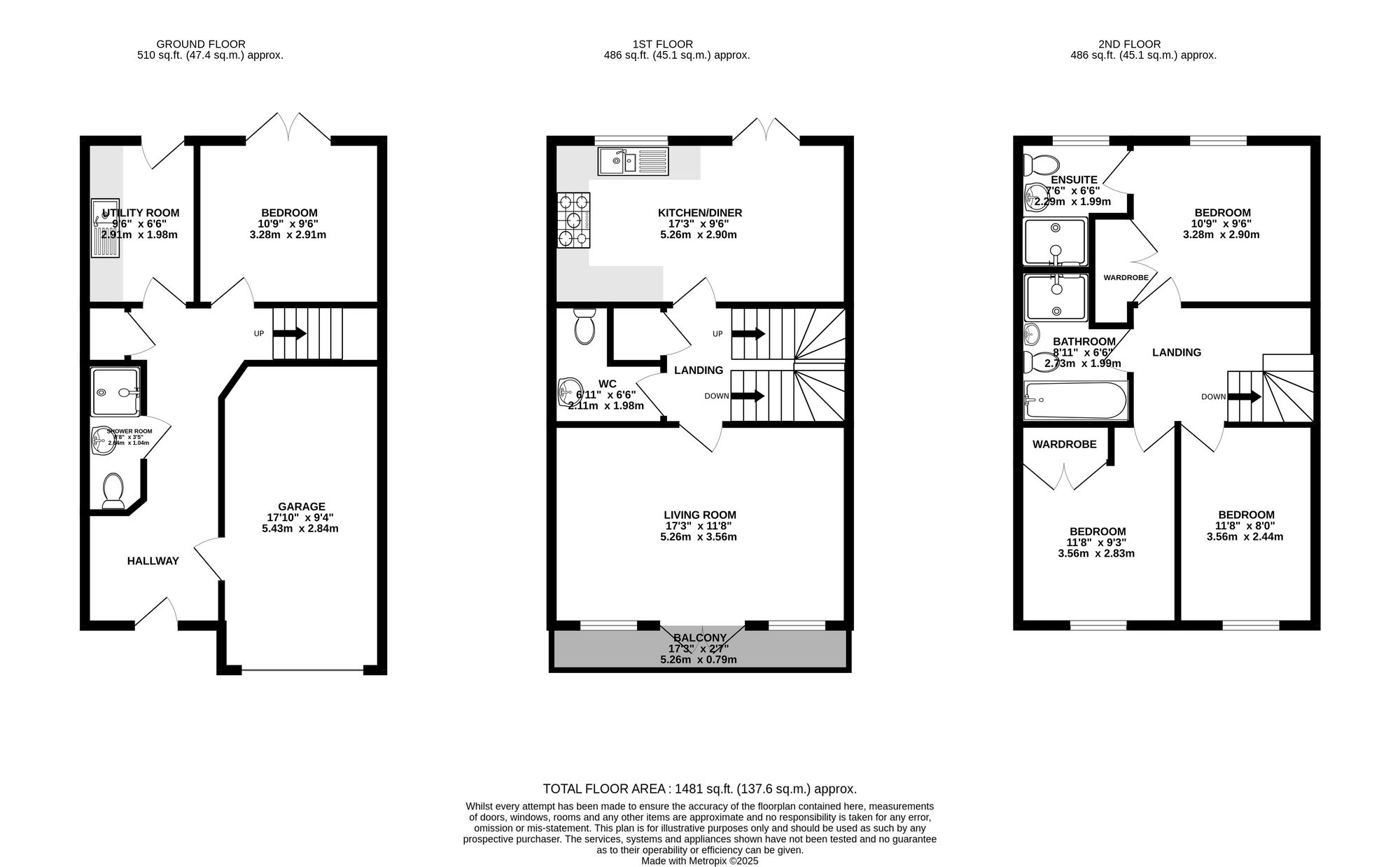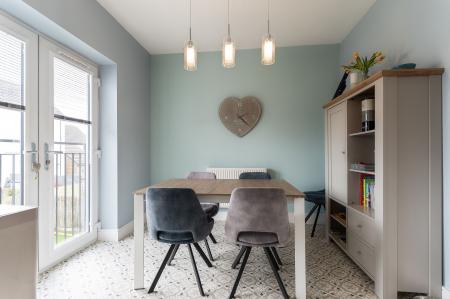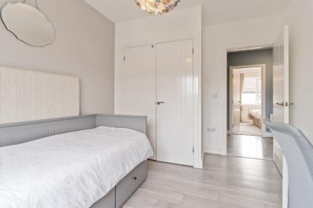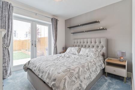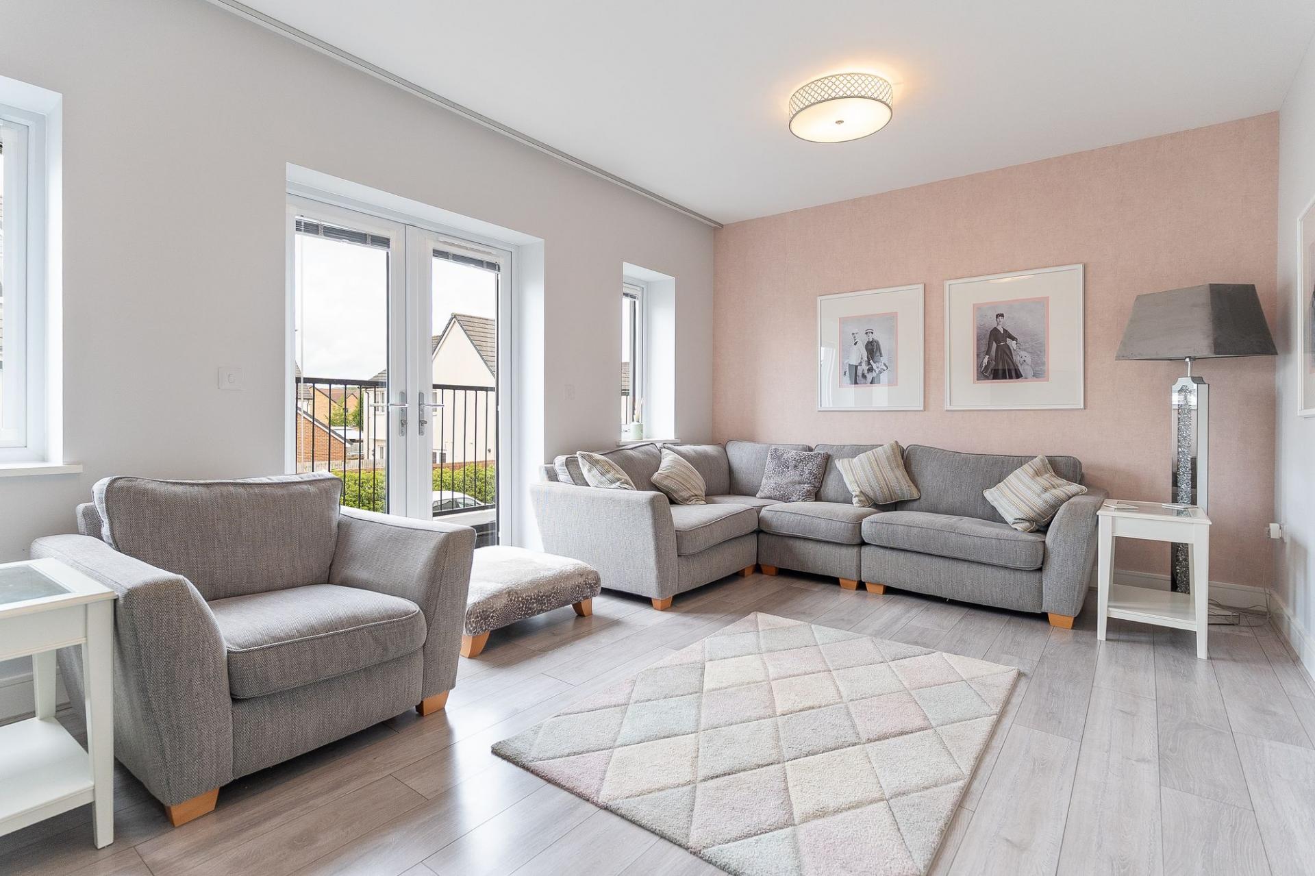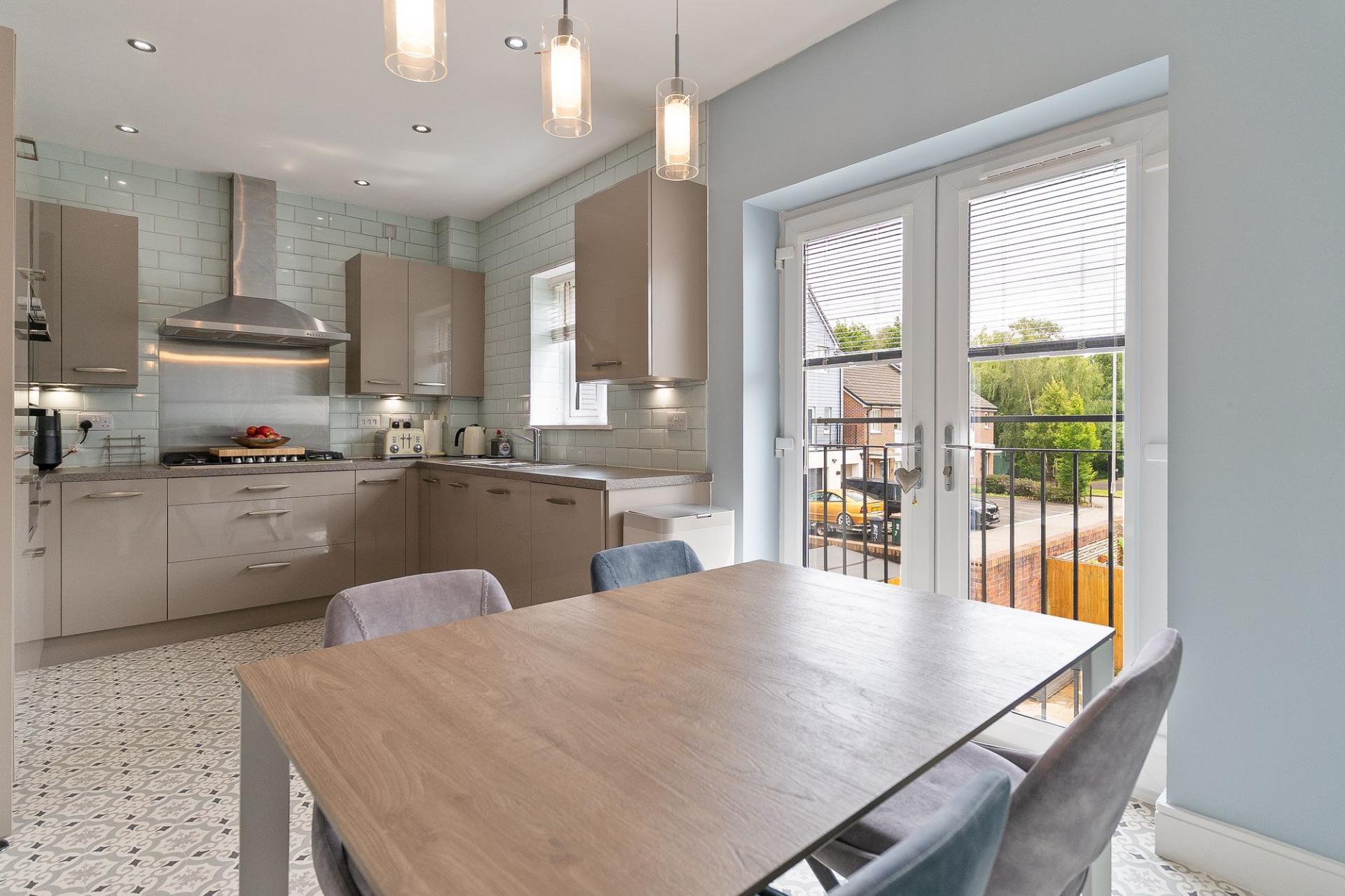 The first floor is designed for comfortable living and entertaining. To the front of the property is a generous living room, beautifully presented and naturally bright, with patio doors opening out onto a front-facing balcony — a perfect spot for enjoying a morning coffee or evening sunset. To the rear is a spacious open-plan kitchen/diner, fitted with modern cabinetry and integrated appliances. There is ample space for a family dining table, and Juliet balcony doors allow for further natural light and views over the garden. A convenient cloakroom is also located on this floor, adding to the practicality of the home.