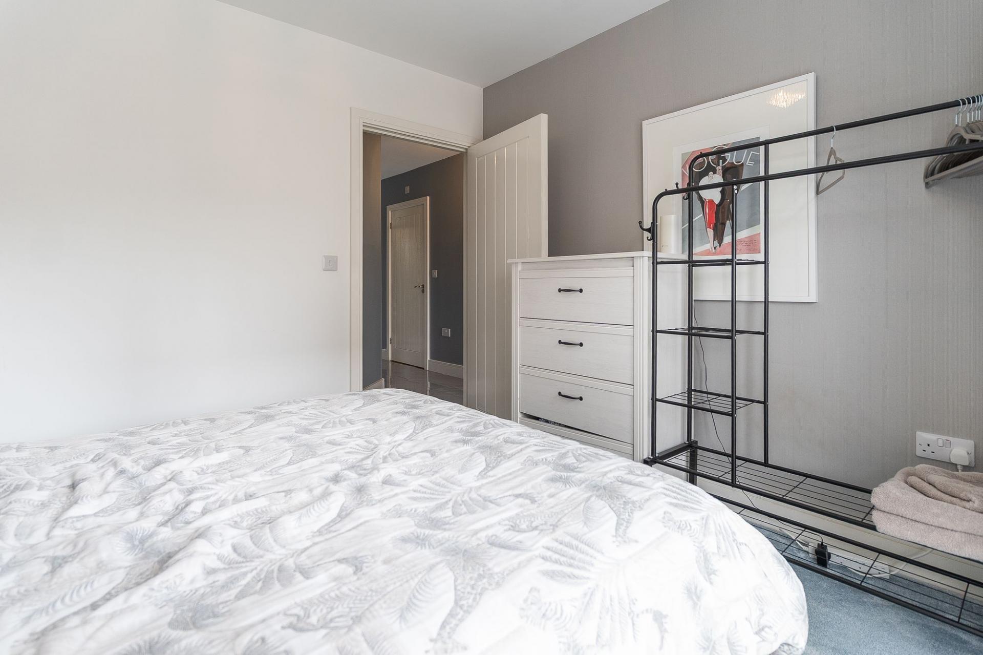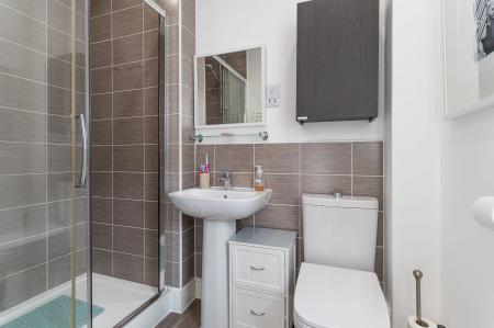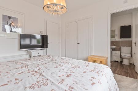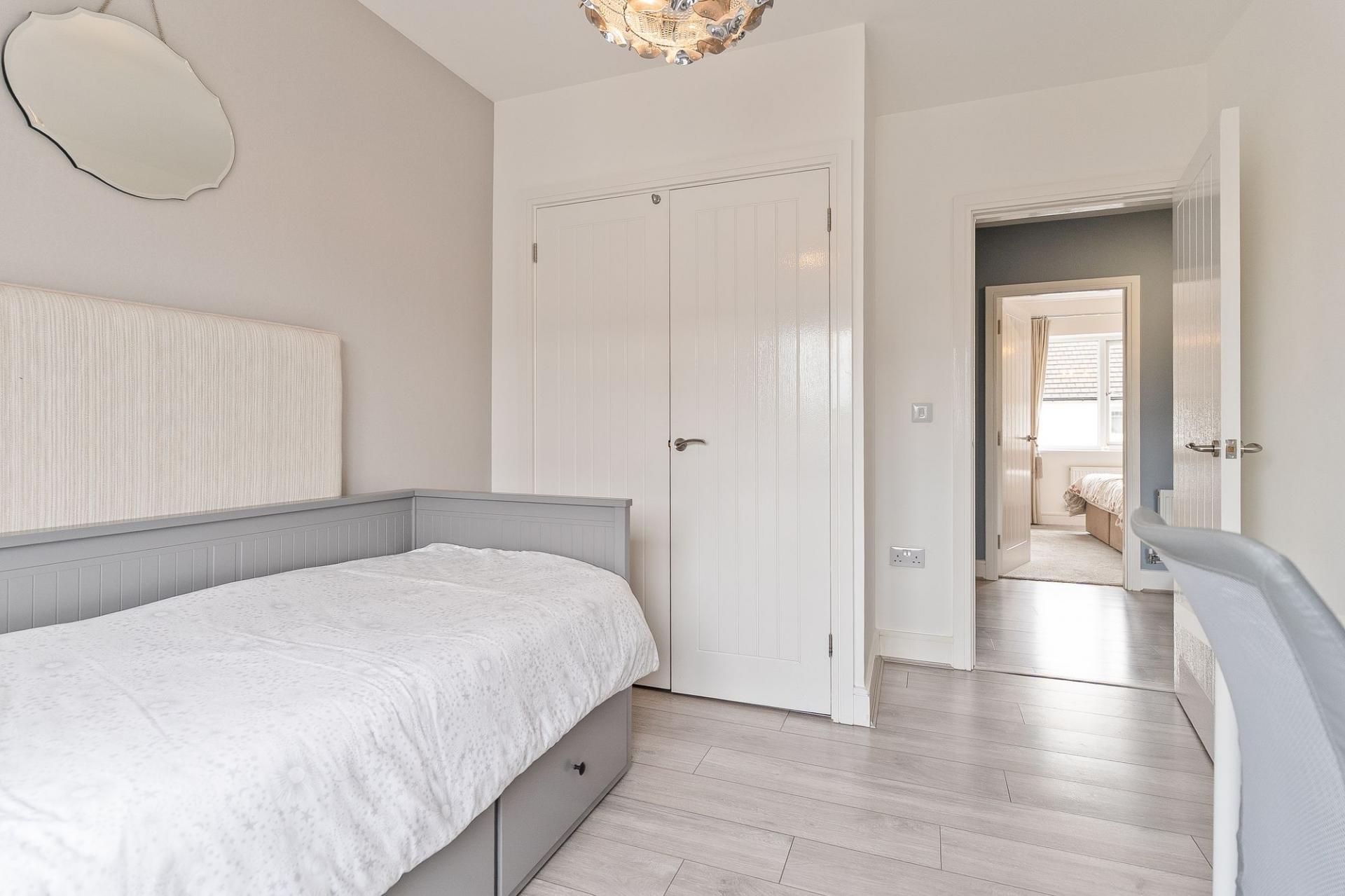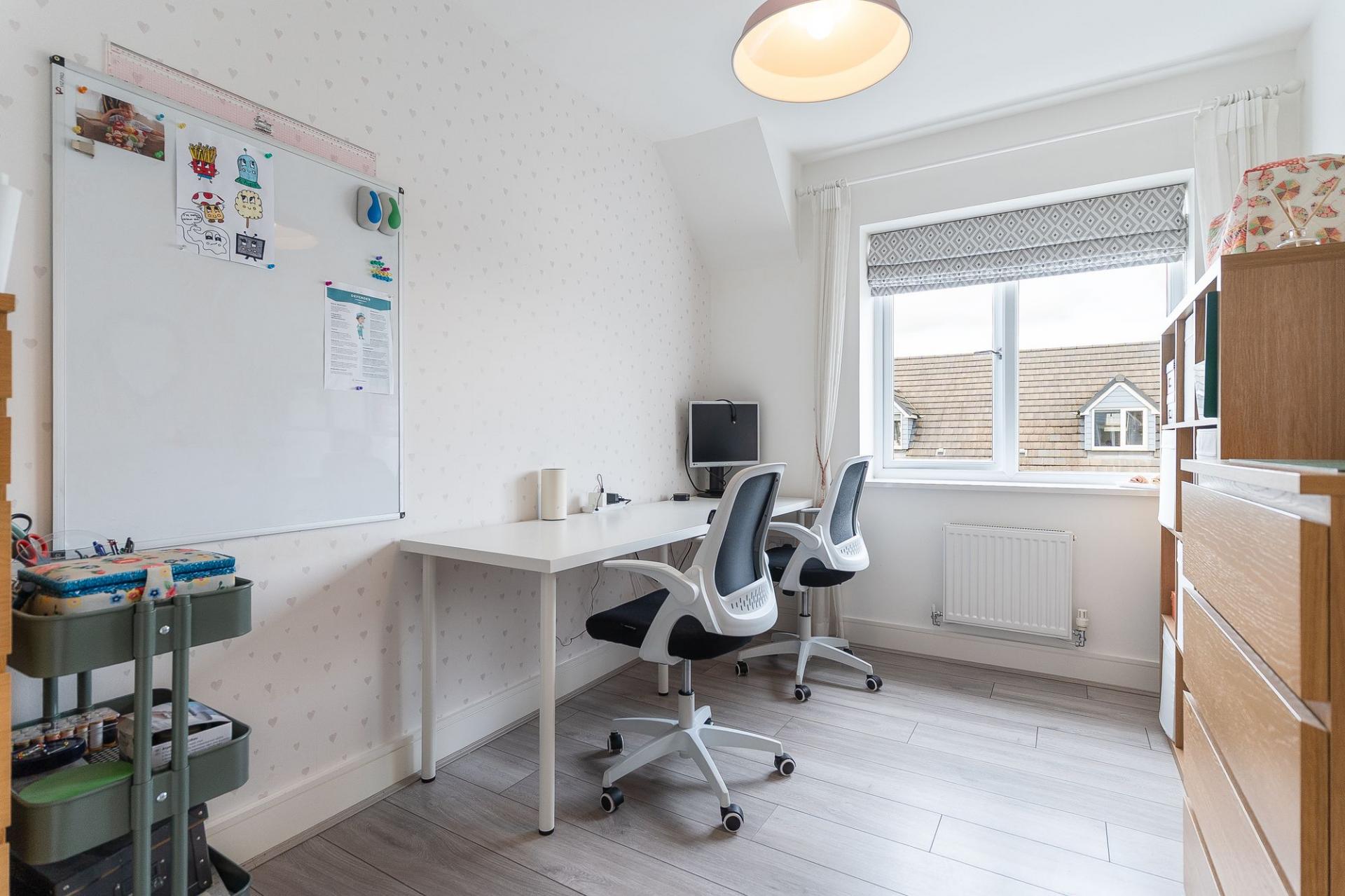 The second floor houses three further bedrooms and the main family bathroom. The primary bedroom is a generous double, benefitting from built-in wardrobes and a stylish en-suite shower room. The second bedroom is also a well-proportioned double with built-in storage, while the third is a comfortable single — ideal as a child’s room or additional study. The large family bathroom is finished to a high standard, complete with a walk-in shower, separate bathtub, WC, and hand basin.