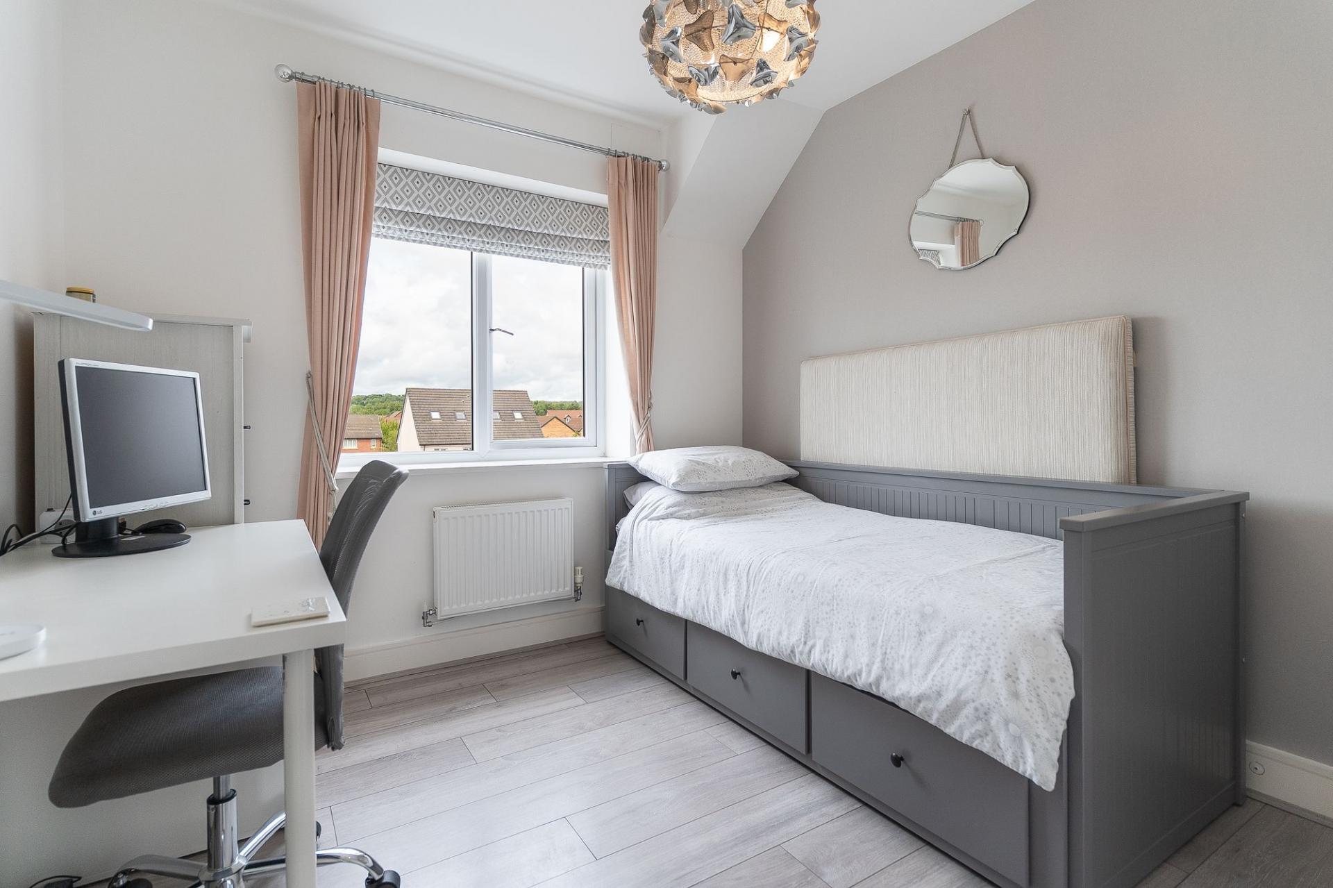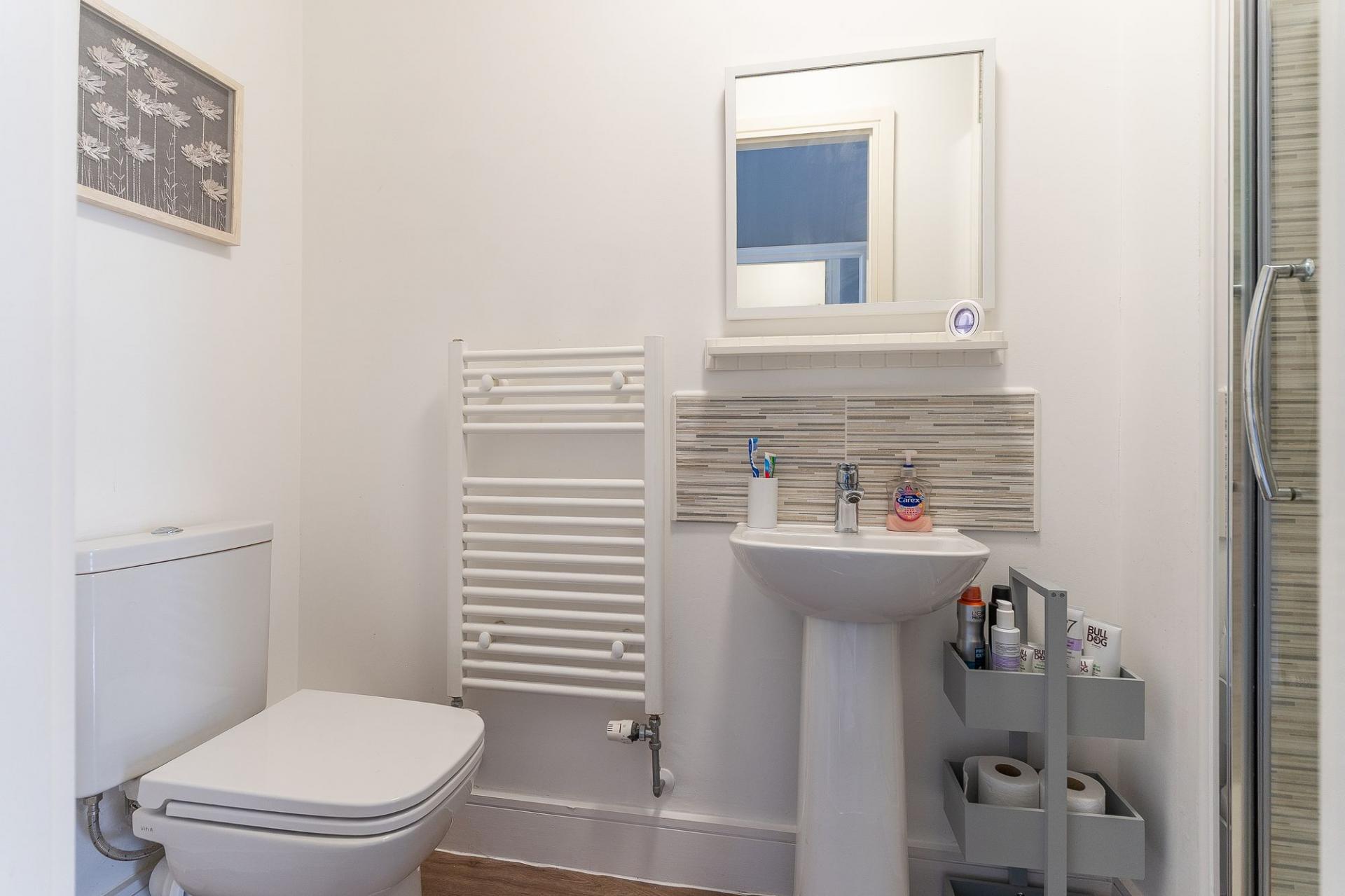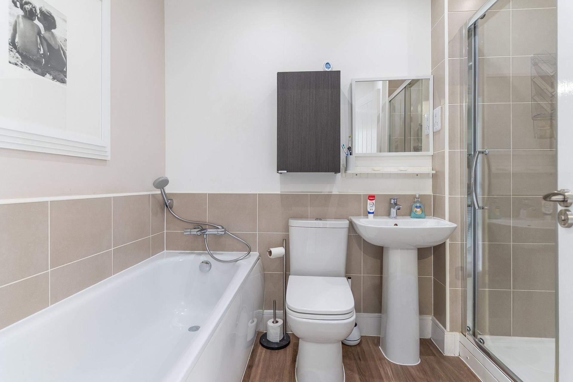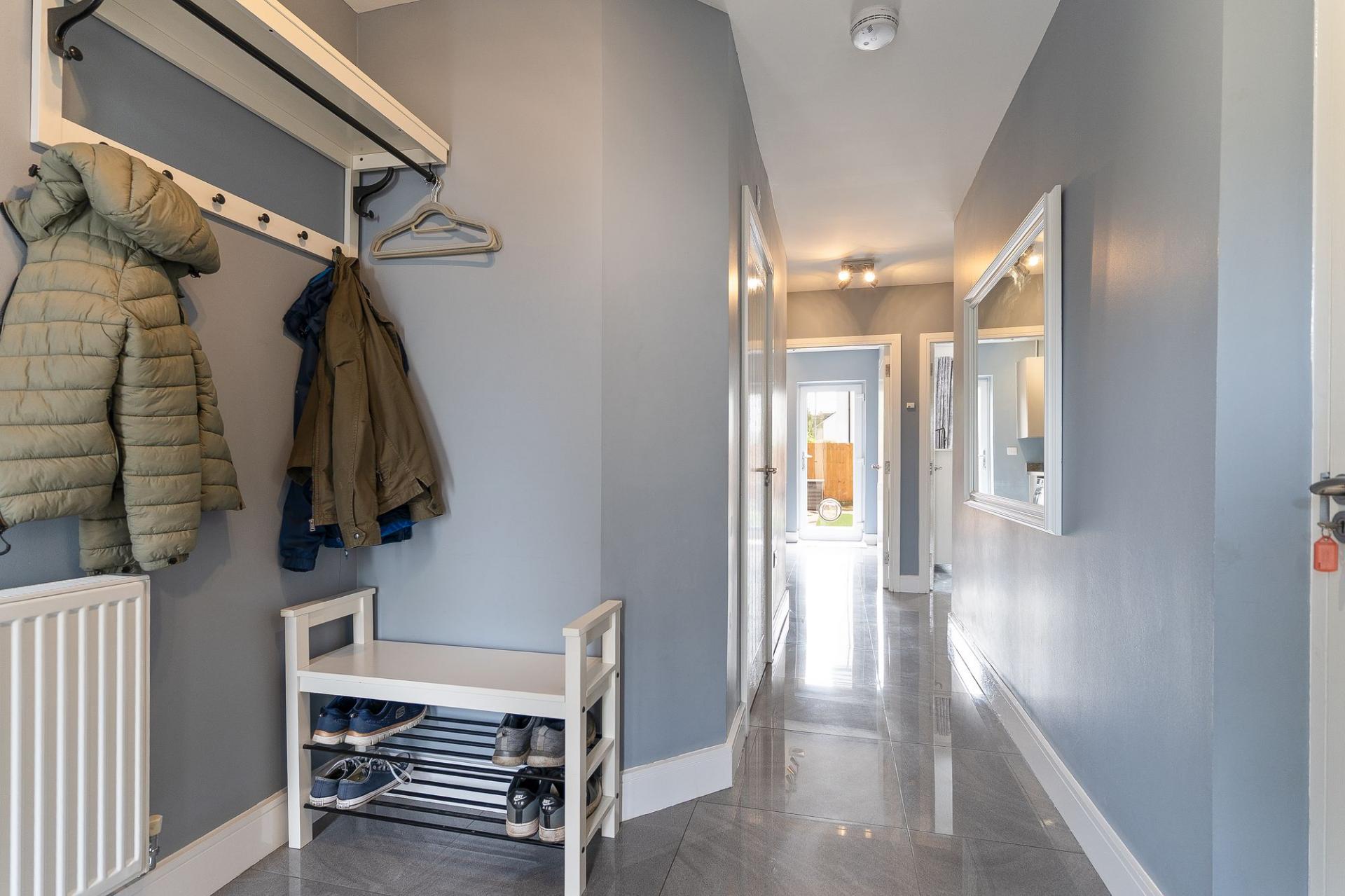 The second floor houses three further bedrooms and the main family bathroom. The primary bedroom is a generous double, benefitting from built-in wardrobes and a stylish en-suite shower room. The second bedroom is also a well-proportioned double with built-in storage, while the third is a comfortable single — ideal as a child’s room or additional study. The large family bathroom is finished to a high standard, complete with a walk-in shower, separate bathtub, WC, and hand basin.