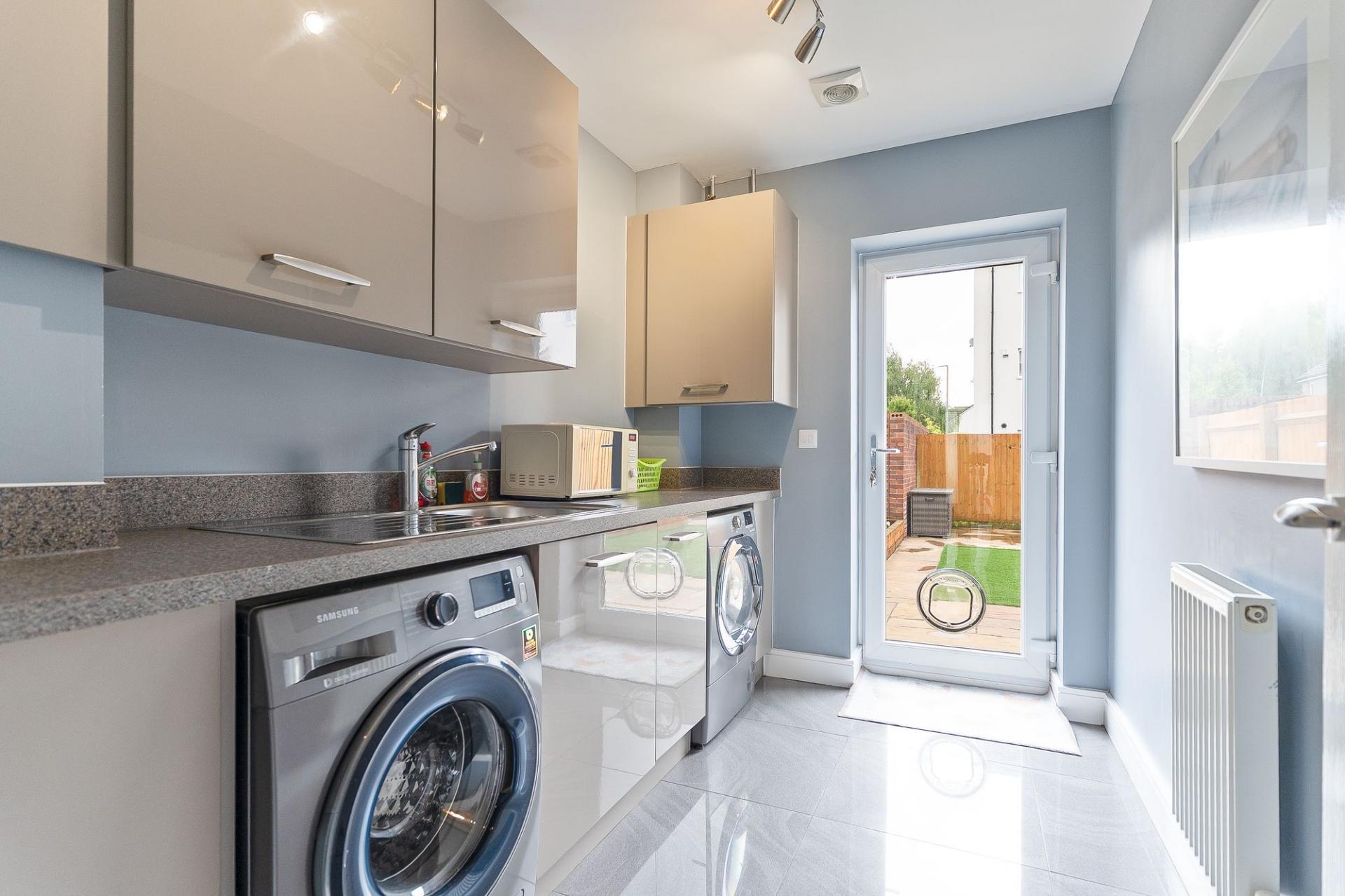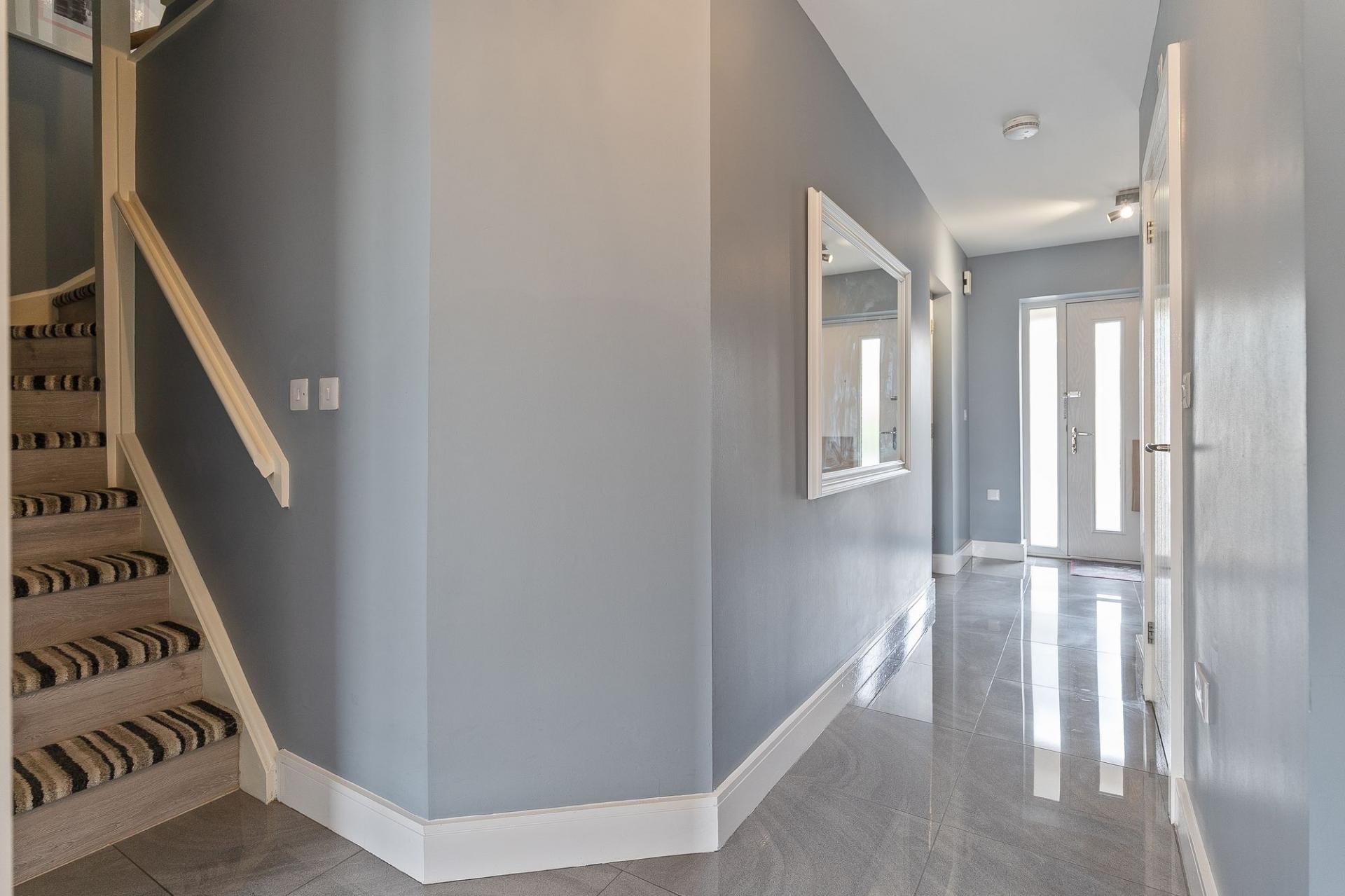 To the front of the property is a private driveway and an integral garage, providing ample off-road parking and useful additional storage. Upon entering, you are welcomed into a bright and spacious hallway that provides access to all ground floor rooms as well as internal access to the garage. On the left-hand side is a stylish and contemporary shower room, complete with a walk-in shower, WC, and hand basin. To the rear, you'll find a utility room and a versatile fourth bedroom, which could alternatively be used as a home office or study. Both rooms enjoy direct access to the rear garden, enhancing their practicality and appeal.