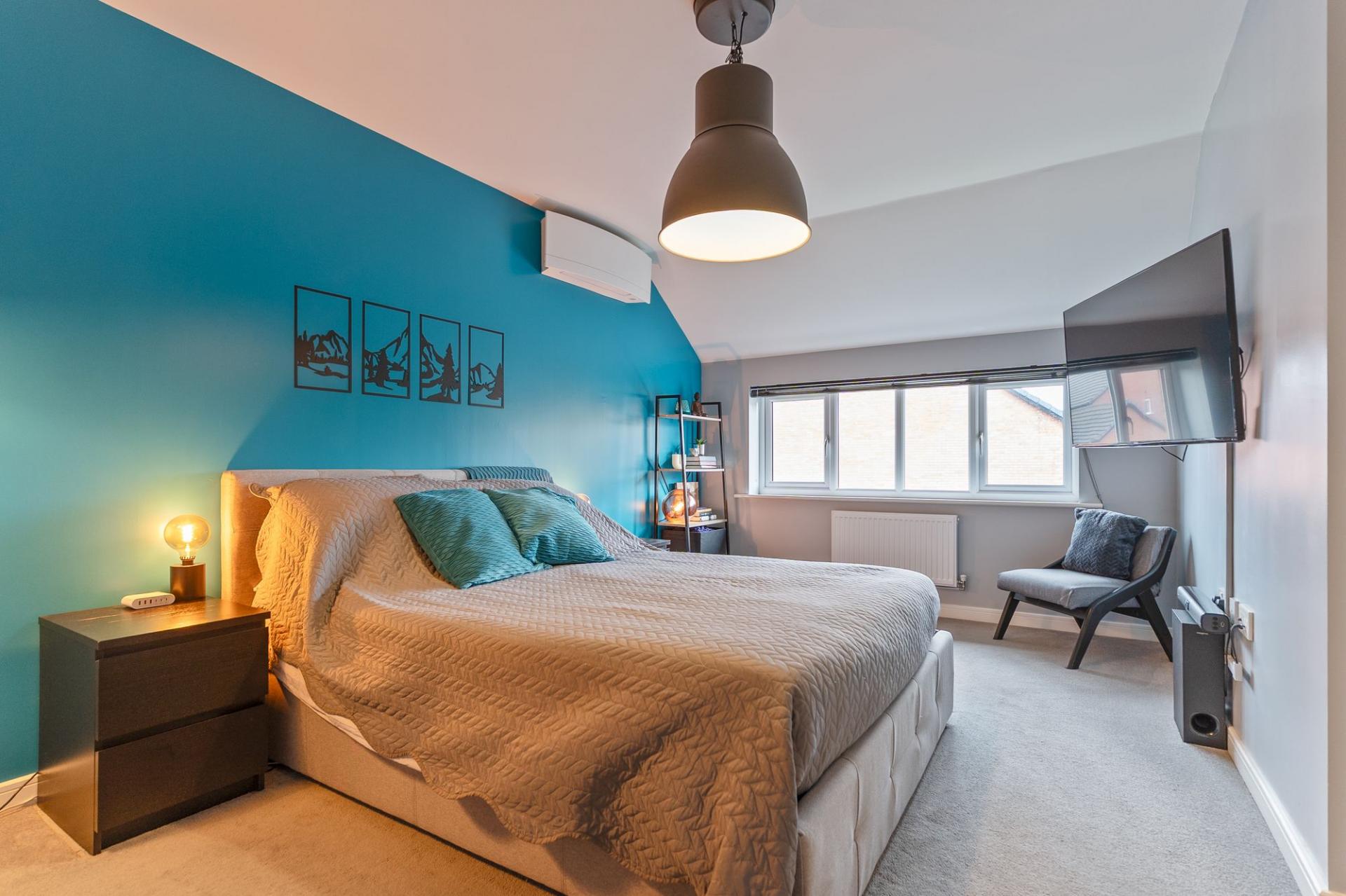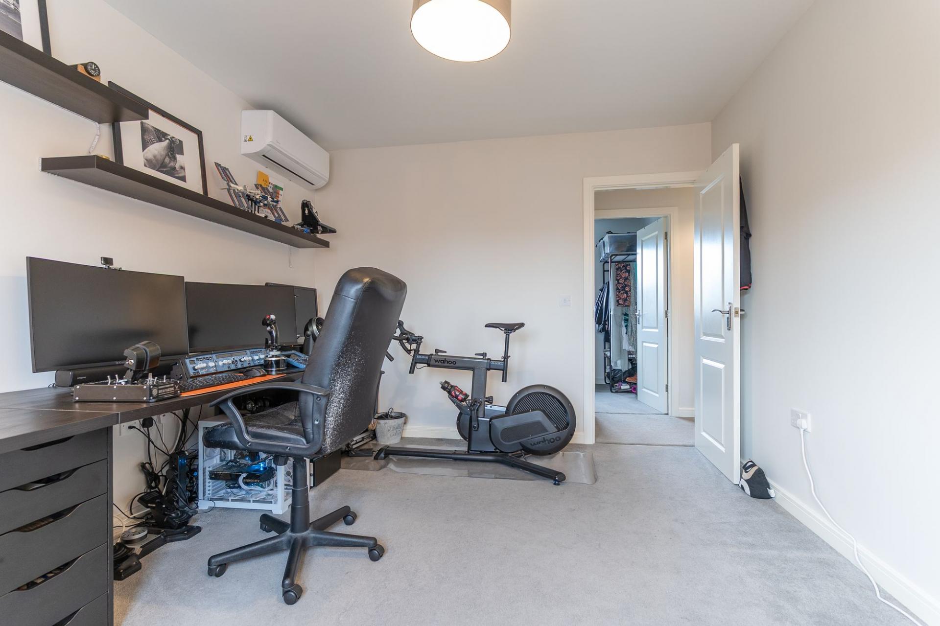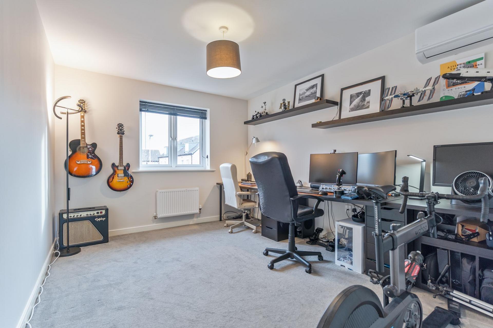The first floor comprises four well-proportioned bedrooms and the family bathroom. There are three comfortable double bedrooms along with a large single bedroom, ideal for a child’s room, home office or dressing room. The primary bedroom further benefits from a modern en-suite shower room, while the remaining bedrooms are served by a well-appointed family bathroom. The primary and secondary bedrooms also benefit from air conditioning.