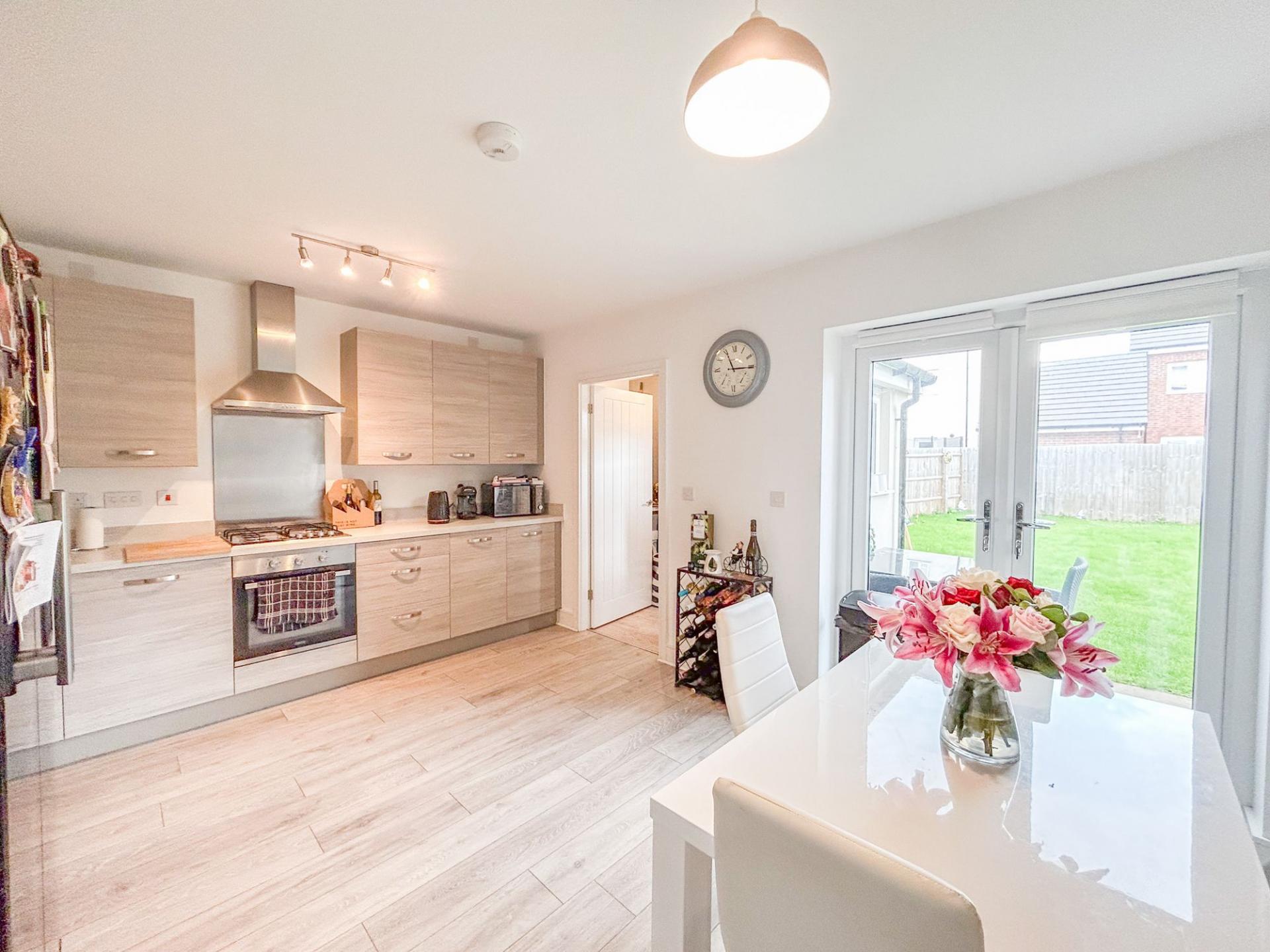 On the ground floor there is a spacious living room to the front of the property and an open plan kitchen/diner to the rear. The kitchen benefits from a range of wall and base units, with integrated appliances to include an oven, four-ring gas hob and fridge/freezer. Double doors from the kitchen open to the garden, which has a patio and lawn area. A useful utility offers secondary garden access, while a convenient cloakroom can be found beyond. A tandem driveway to the side of the property provides off-road parking.