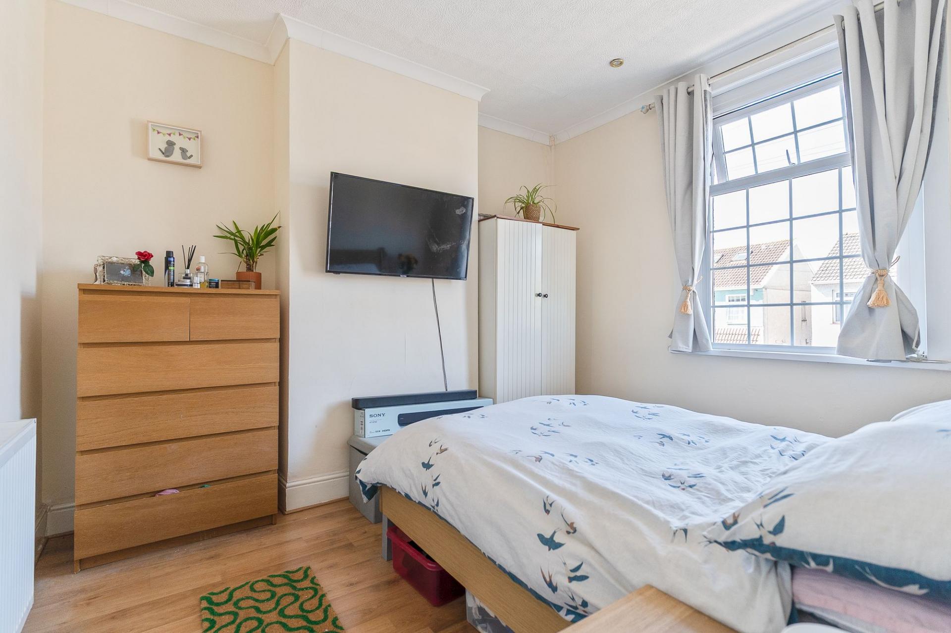 Upstairs, the property offers three well-proportioned bedrooms. There are two double rooms, both offering comfortable accommodation, and a third single bedroom, perfect as a nursery, study, or guest room. The family bathroom is neatly presented, featuring a WC, hand basin, and bath with a shower overhead – practical in size and layout.