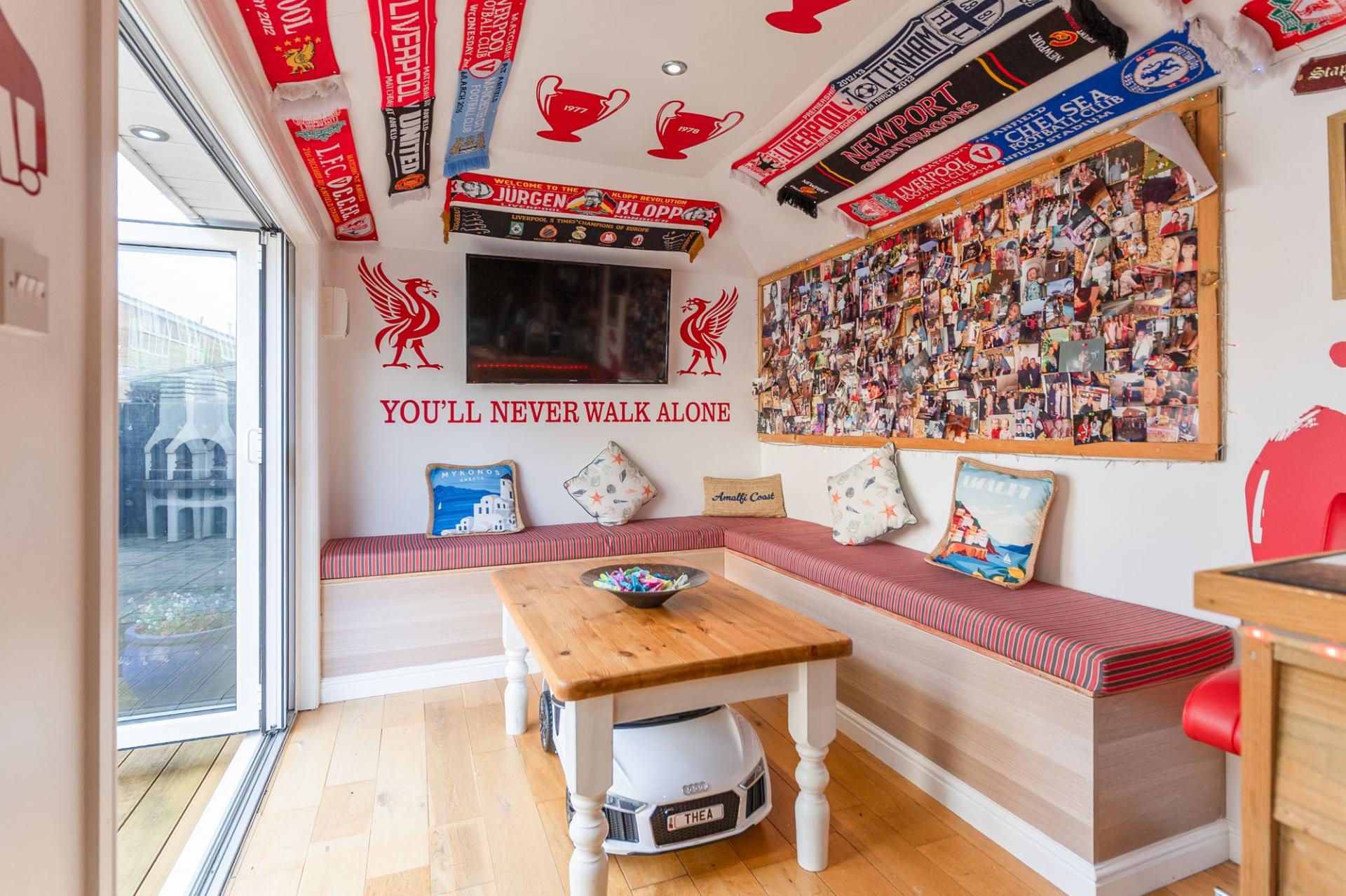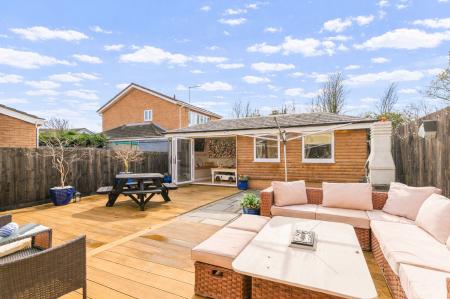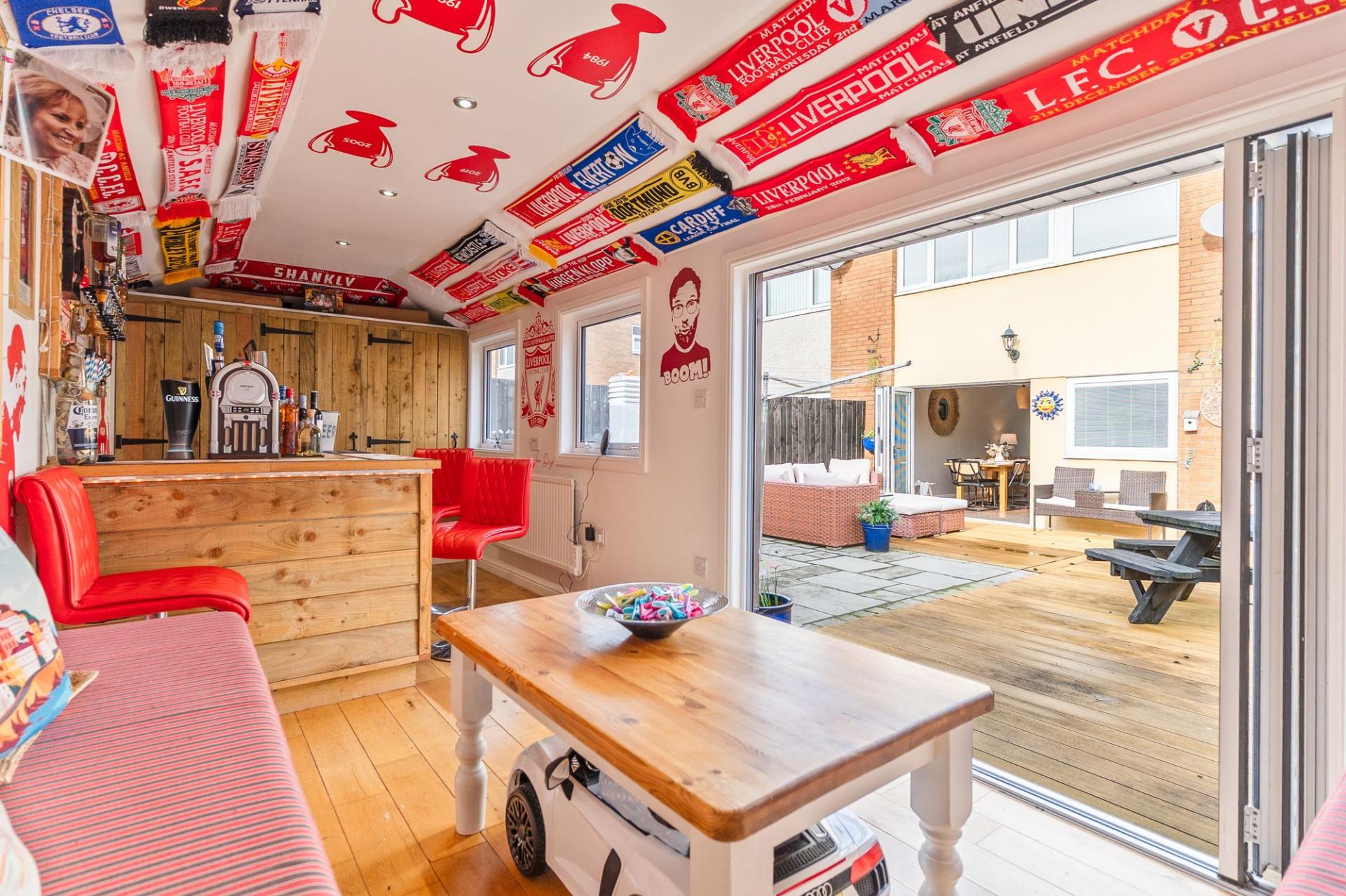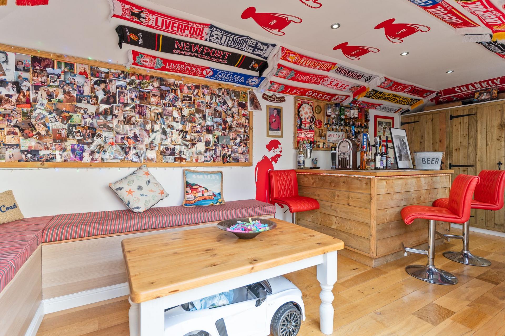 Externally, to the front of the property is a driveway providing off-road parking. To the rear is a substantial garden space, offering plenty of room for outdoor seating and entertaining. The garden also benefits from an impressive outhouse building, currently utilised as a home bar and entertainment area, providing a versatile and sociable additional space.