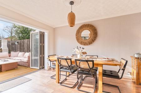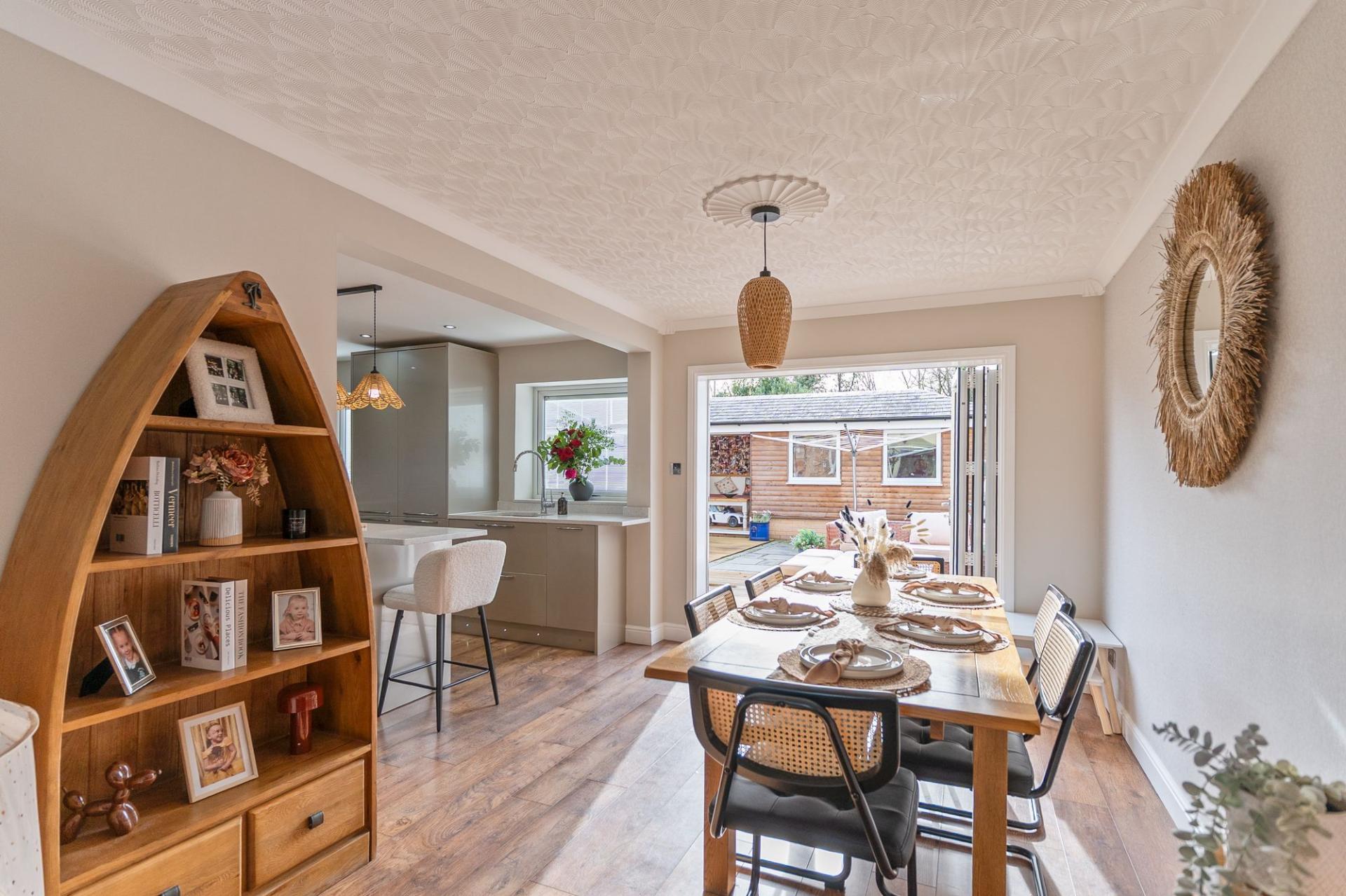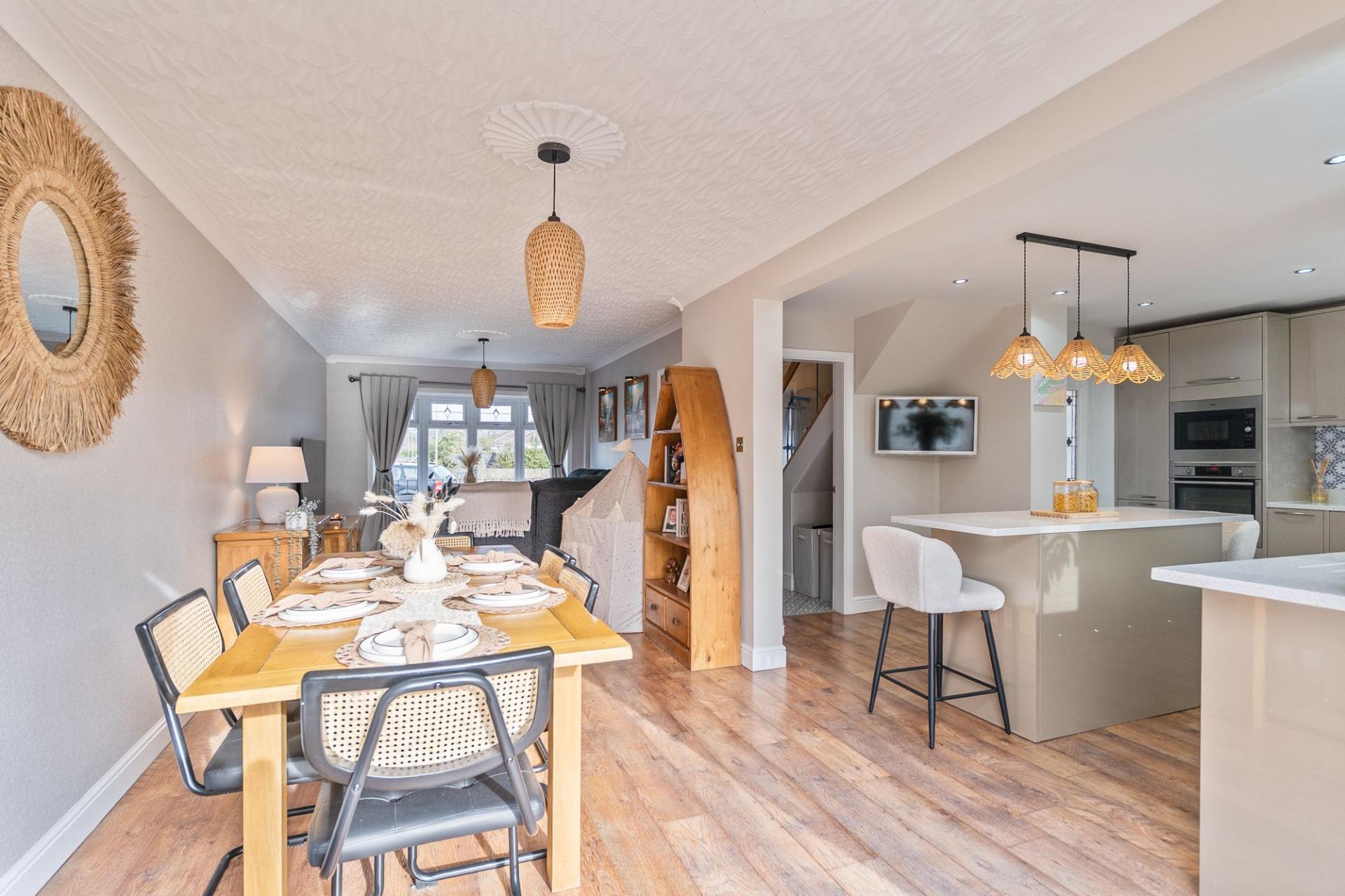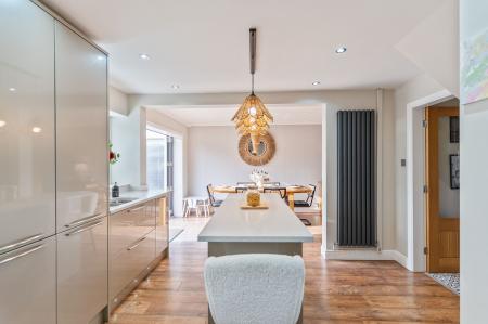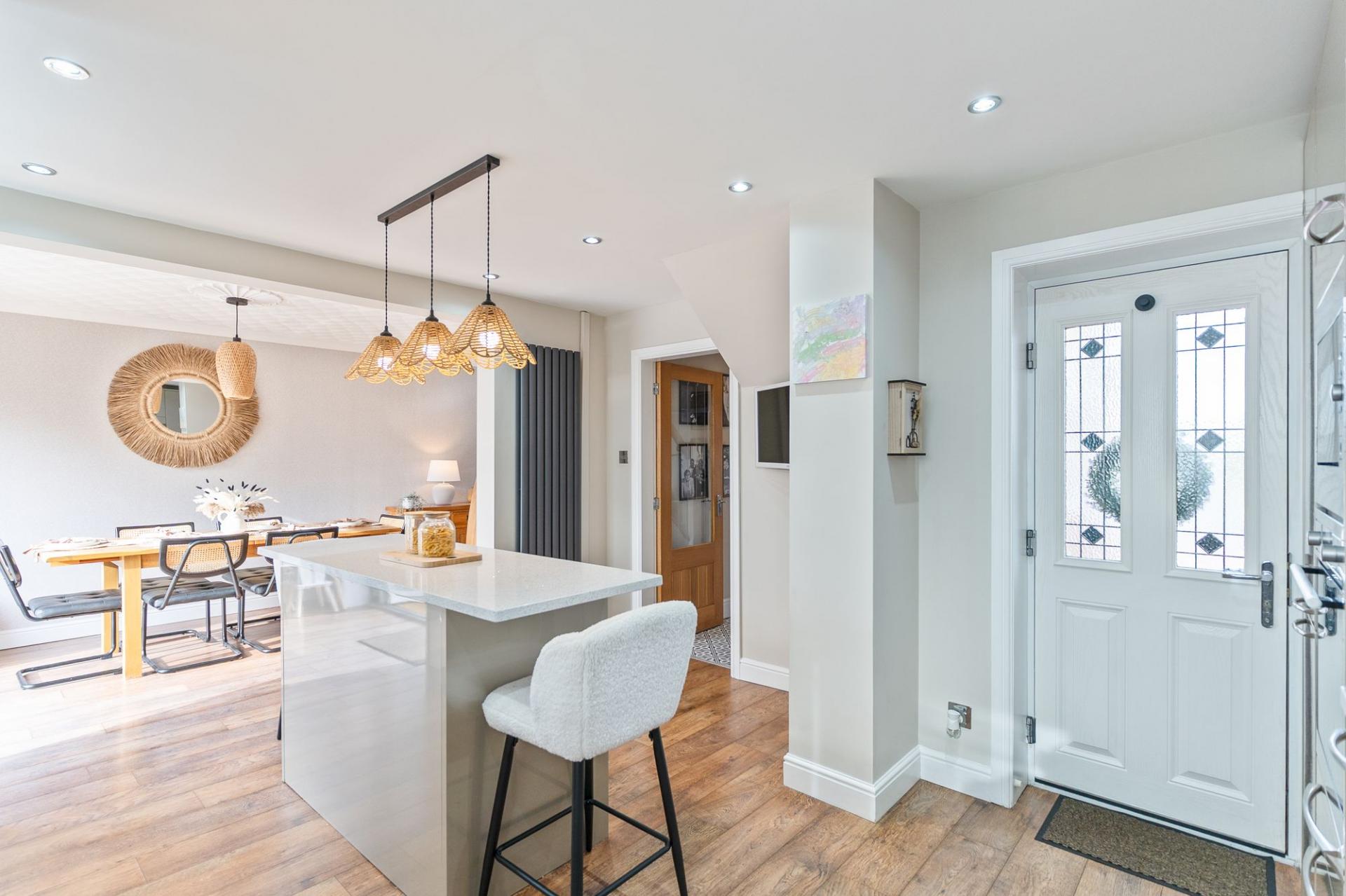 You enter the property through an initial porch, which leads into the welcoming hallway. From here there is a convenient cloakroom to the left, access to the first-floor staircase and entry into the main living area. The ground floor boasts a modern open-plan layout, thoughtfully designed for contemporary family living. The stylish fitted kitchen features a central island and offers ample unit and worktop space, seamlessly flowing into the living and dining area. Bi-fold doors to the rear open out onto the garden, allowing for an abundance of natural light and creating an excellent space for entertaining and everyday living.