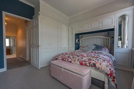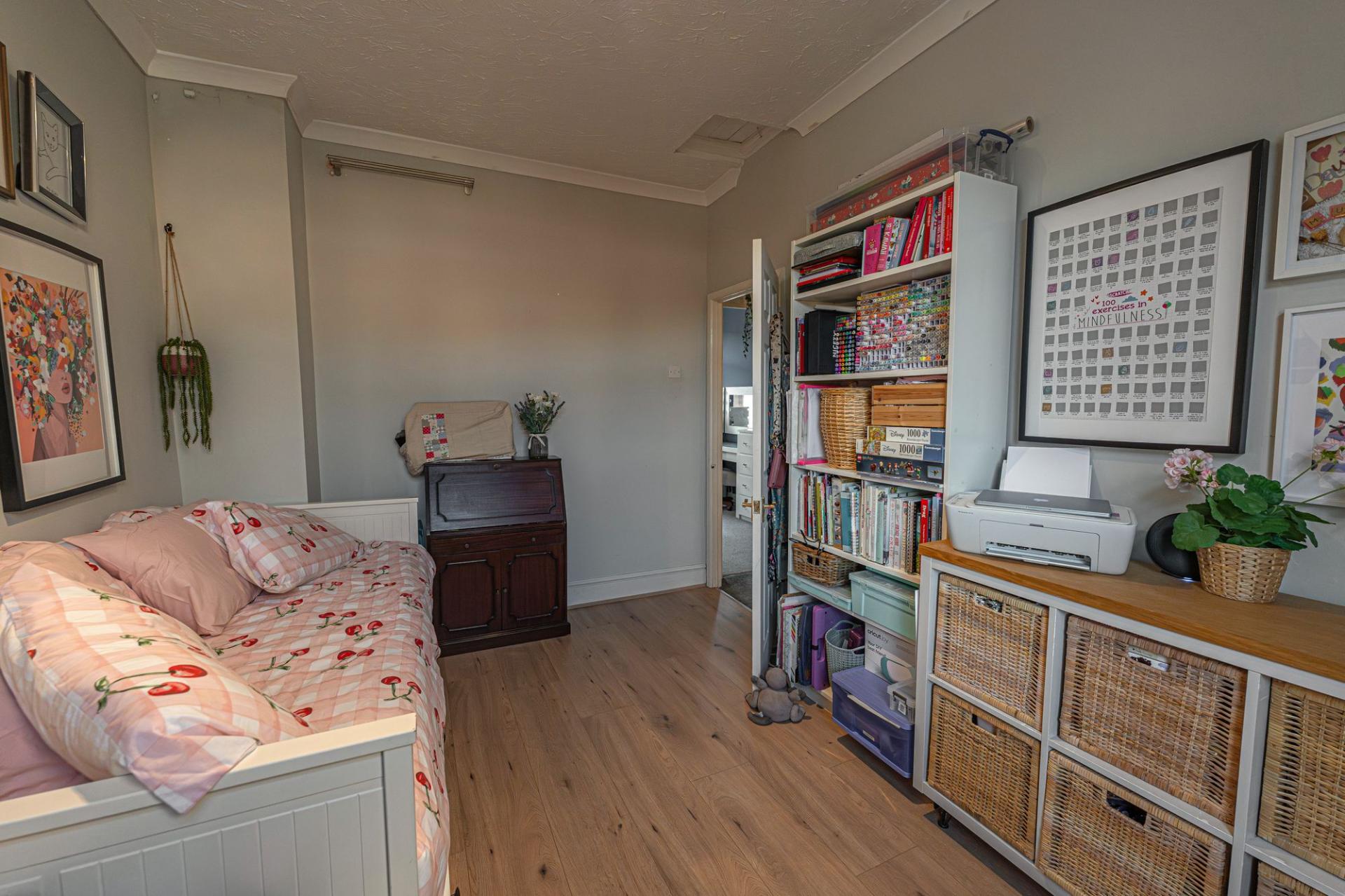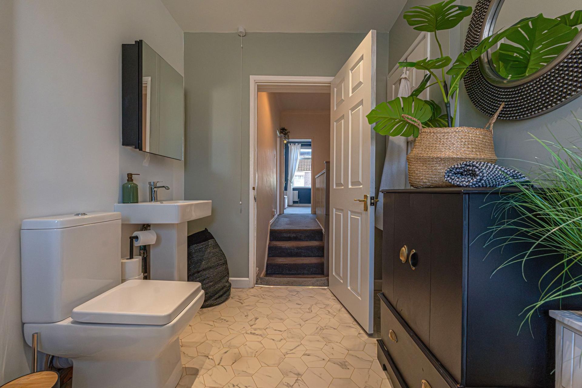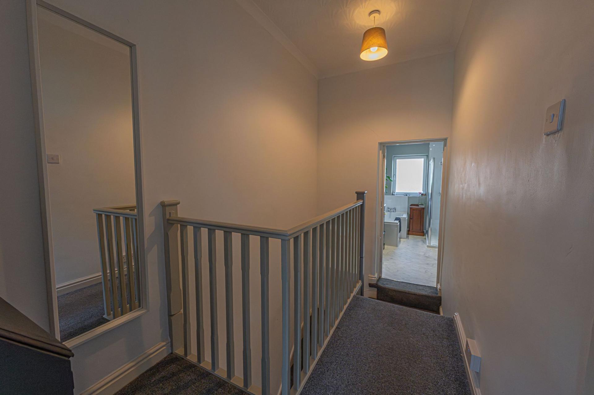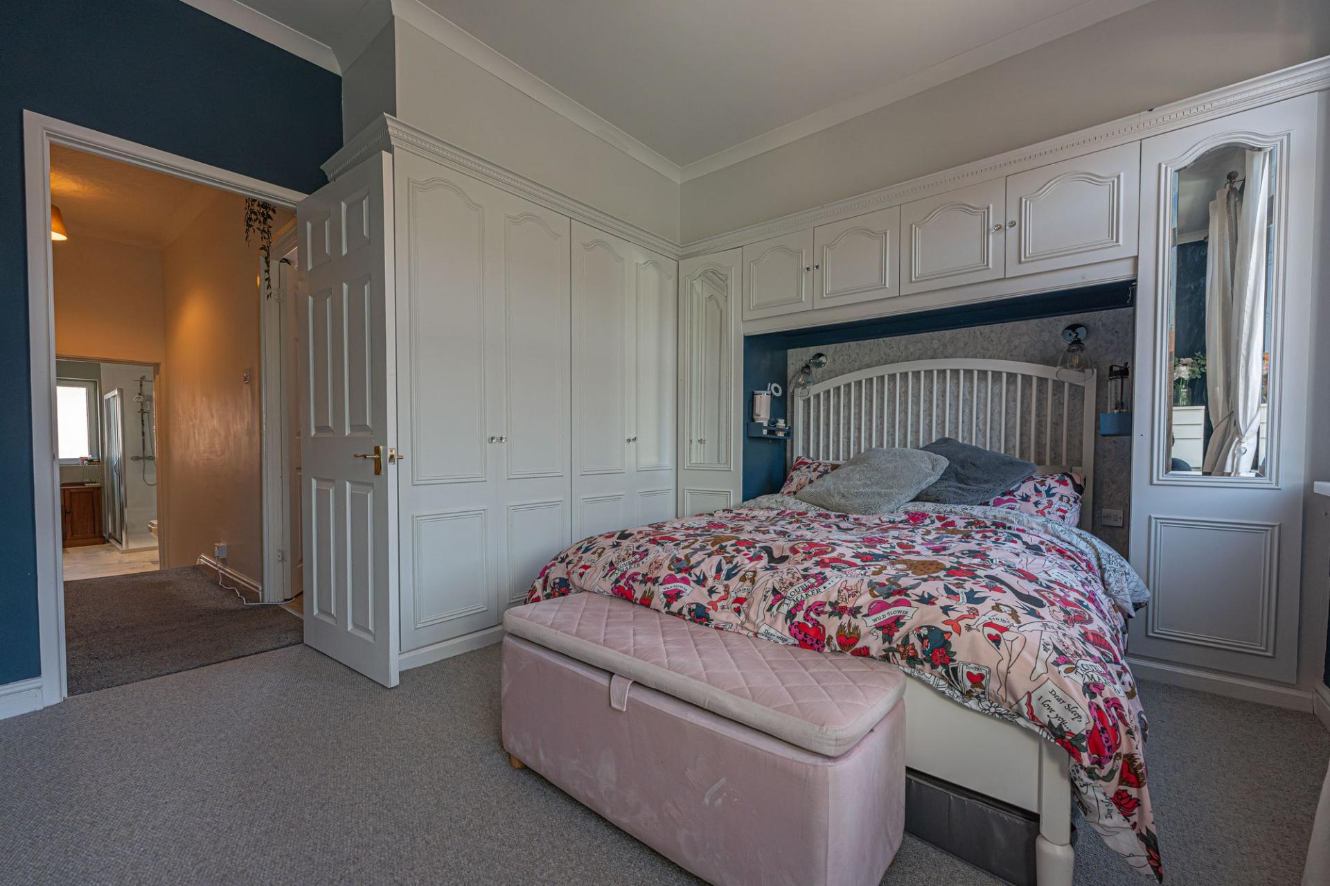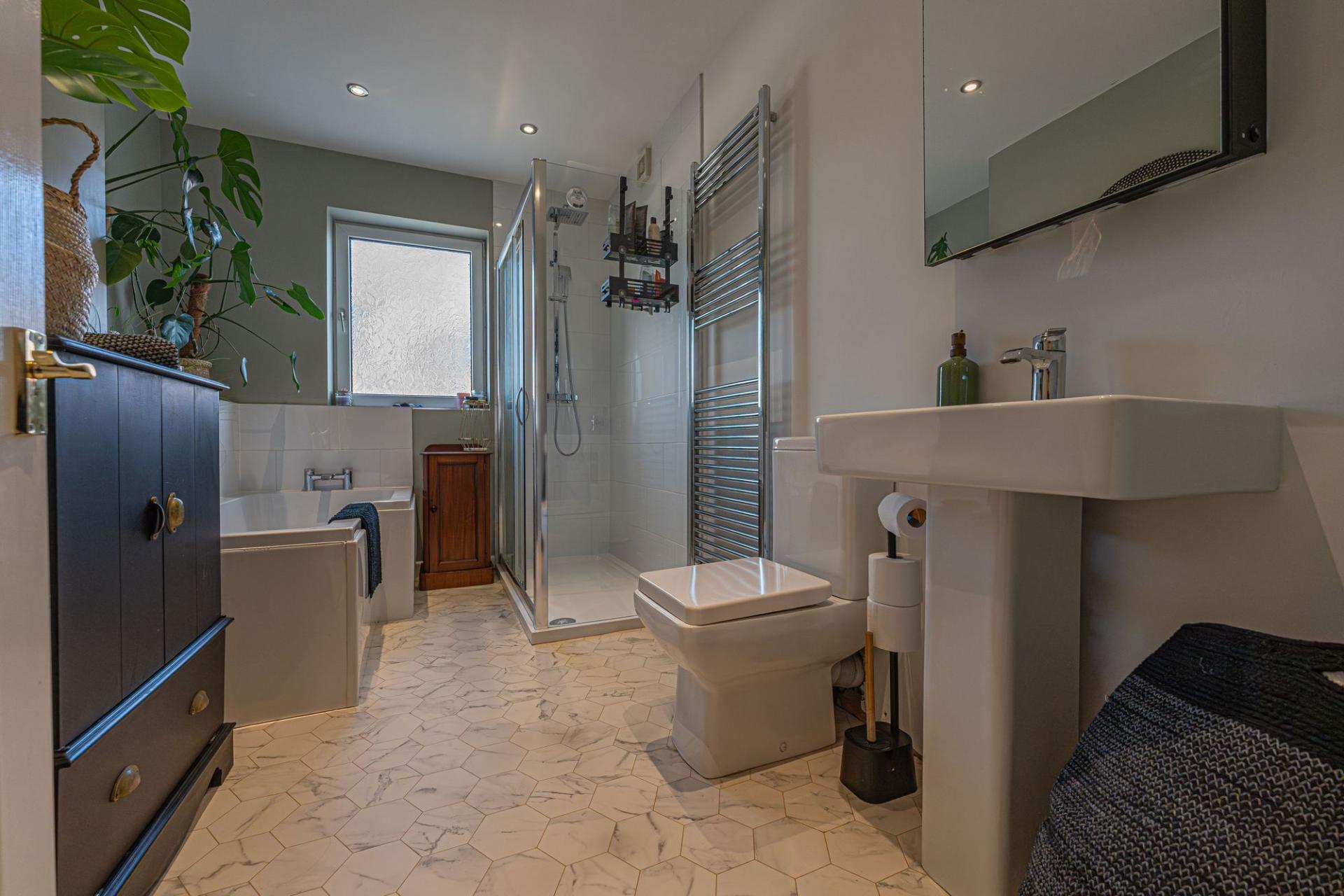 To the first floor we have two well proportioned double rooms, with the primary bedroom positioned at the front of the house, and benefitting from multiple windows for plenty of natural light, and numerous fitted wardrobes for convenient storage space. From the hallway we can also find the sleek family bathroom, which features both a large bath suite and a separate shower unit.