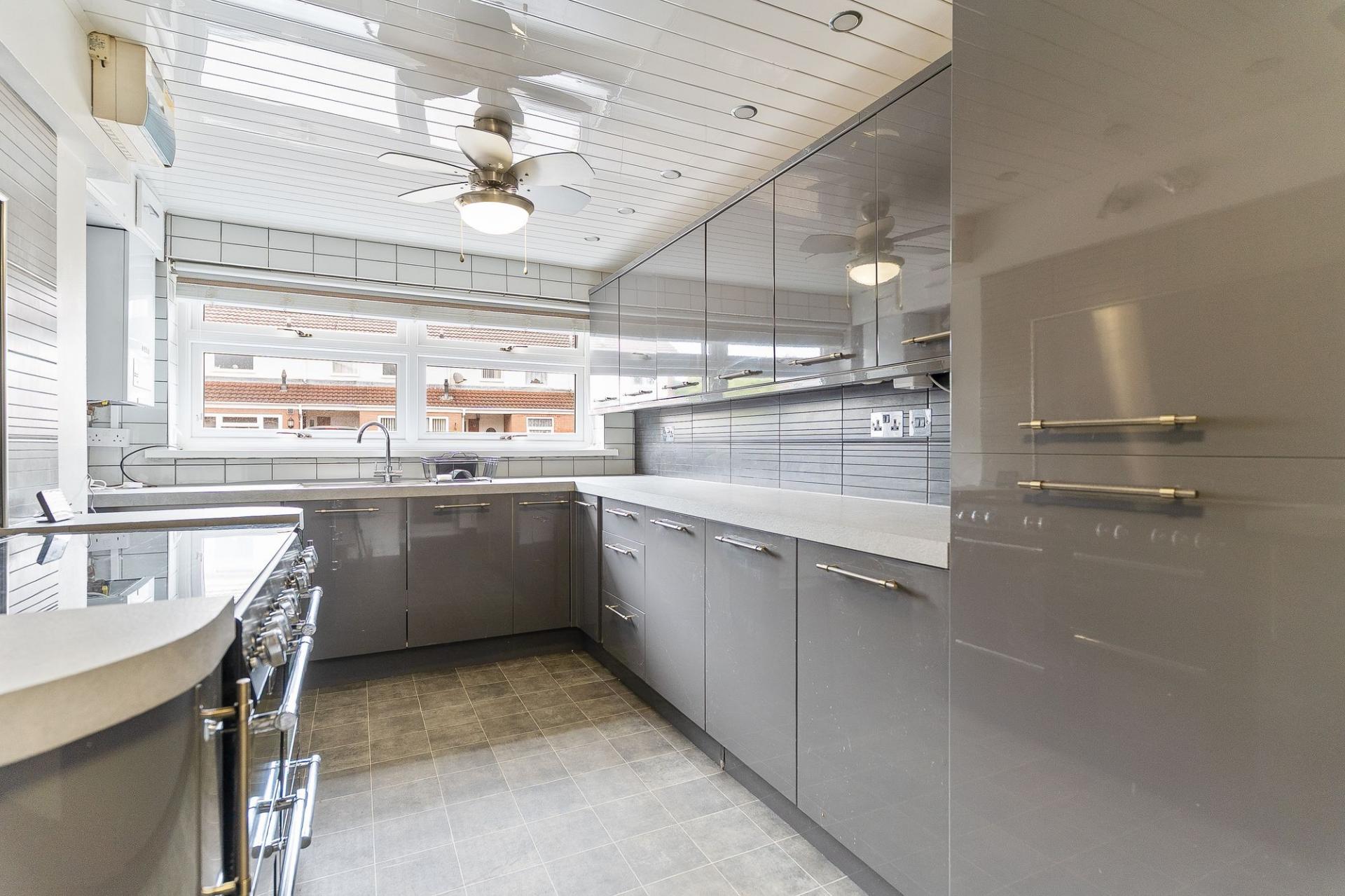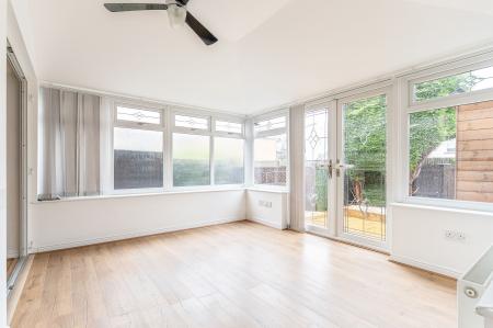 Upon entering the property, you are welcomed into a bright hallway offering access to the main living areas. A convenient ground-floor cloakroom is located to the right, fitted with a WC and hand basin. To the left is the fully fitted kitchen, featuring ample cupboard and worktop space, a double oven range cooker, and a wall-mounted 19-inch Freeview TV — ideal for cooking and casual dining. To the rear of the home is the main living room, a bright and spacious area fitted with a 50-inch Samsung TV, offering an ideal setting for family life or entertaining. This space flows openly into the conservatory, which provides additional seating or dining space. The conservatory is a particularly impressive feature, with a tiled roof, central heating, and double doors that lead out to the garden, making it a comfortable year-round space.