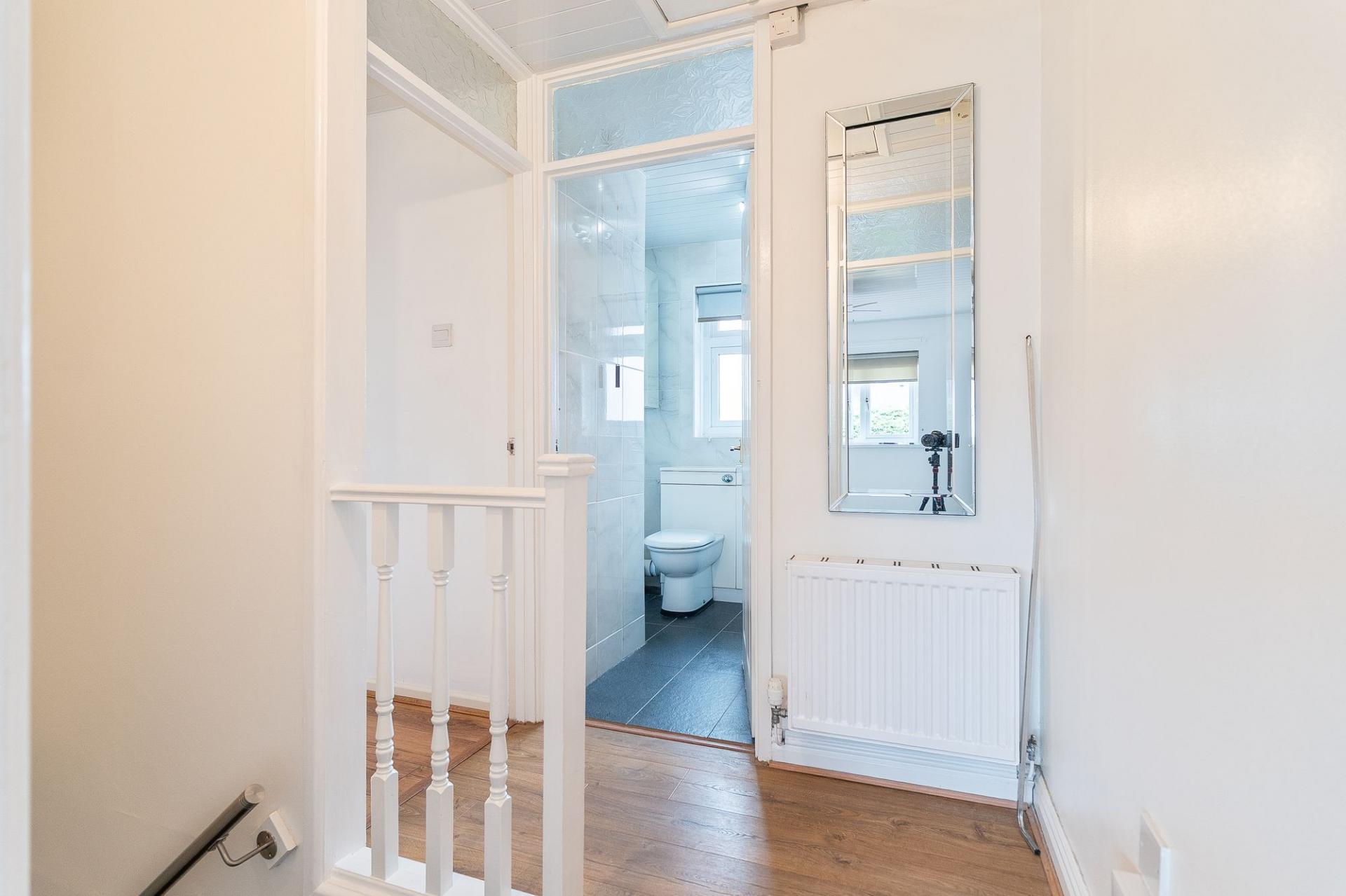 On the first floor, the property continues to impress with two generous double bedrooms, both of which benefit from walk-in wardrobes. The primary bedroom offers particularly spacious storage, ideal for those needing extra space. The shower room is fitted with a recently installed shower cubicle, WC, and hand basin, all finished to a modern standard. From the landing, there is pull-down ladder access to the part-boarded loft, which features a Velux window and offers useful additional storage or potential for conversion, subject to relevant permissions.
