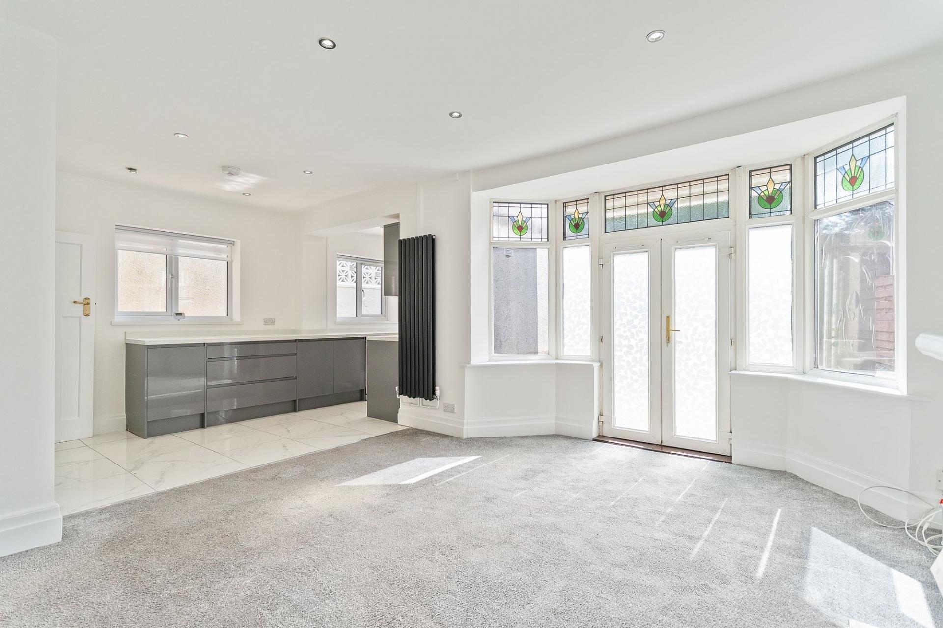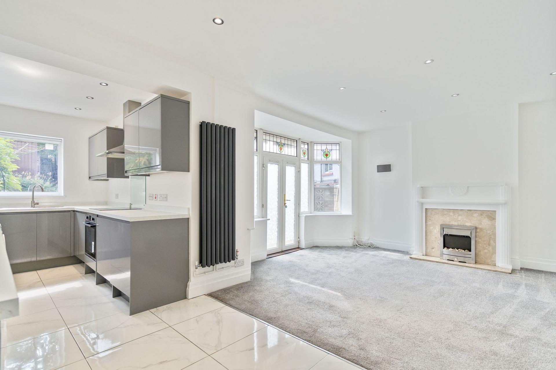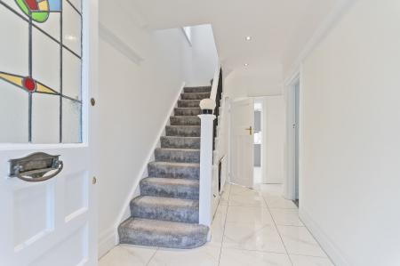 We enter this beautifully presented property to the front, where we can find a large entry foyer leading us into the spacious living room, which offers an abundance of space for multiple furniture layouts, and is perfect for entertaining guests, with plenty of light flooding in through gorgeous bay fronted windows. Another large reception room can be found at the rear of the property, with an airy open plan design to connect to the neighbouring kitchen, which is practical and well equipped with ample storage space and numerous integrated appliances, as well as featuring under counter lighting to illuminate the space. This lovely reception room provides further flexibility for residents, with plenty of space for both a dining area and a secondary lounge, with multiple aspect windows to light up the room, including a bay aspect with doors to the garden. From the kitchen we can also find a useful W.C and a utility closet.