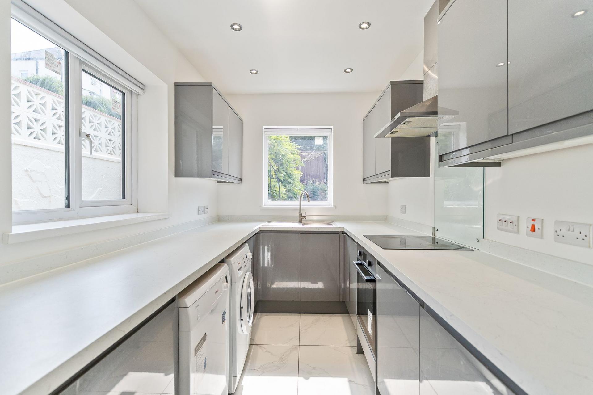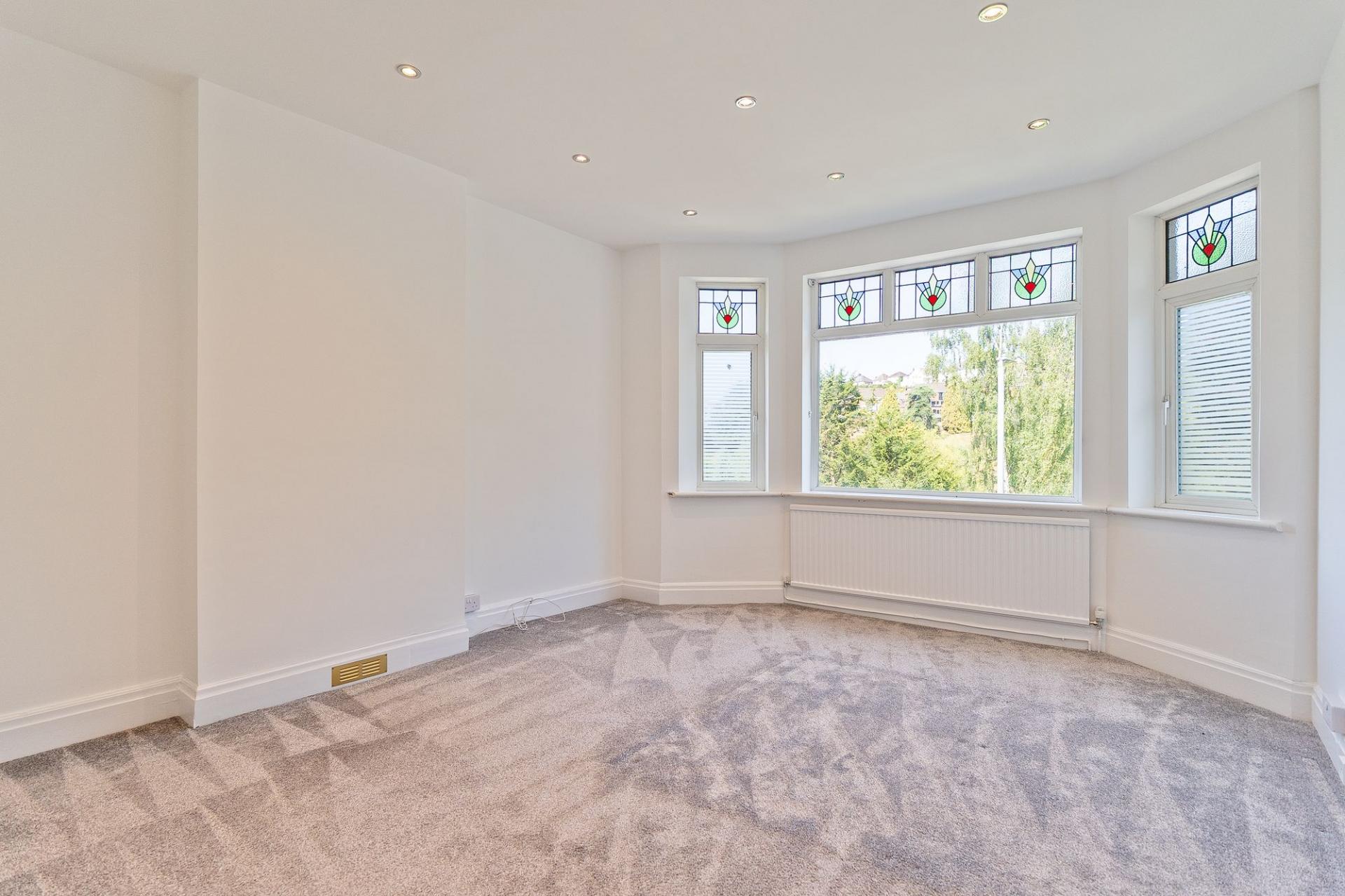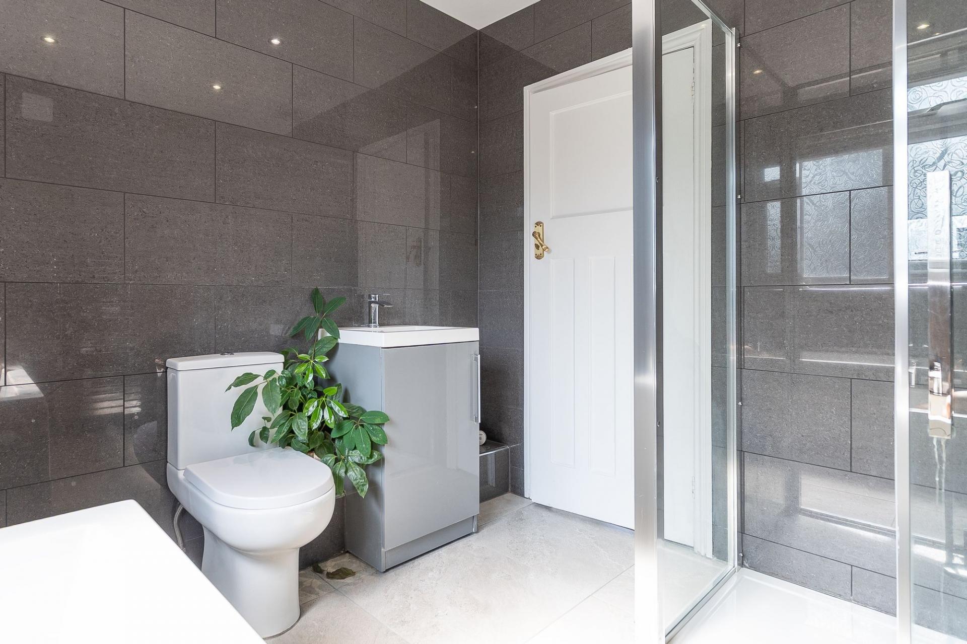 To the first floor we have the three bedrooms, which are all generously proportioned double rooms, with the primary bedroom enjoying the abundant size and sunlight cascading in through another set of bay windows, offering views to the neighbouring park across the road. The family bathroom is sleek in design and is also found on the first floor, equipped with both a bathtub and separate shower unit.