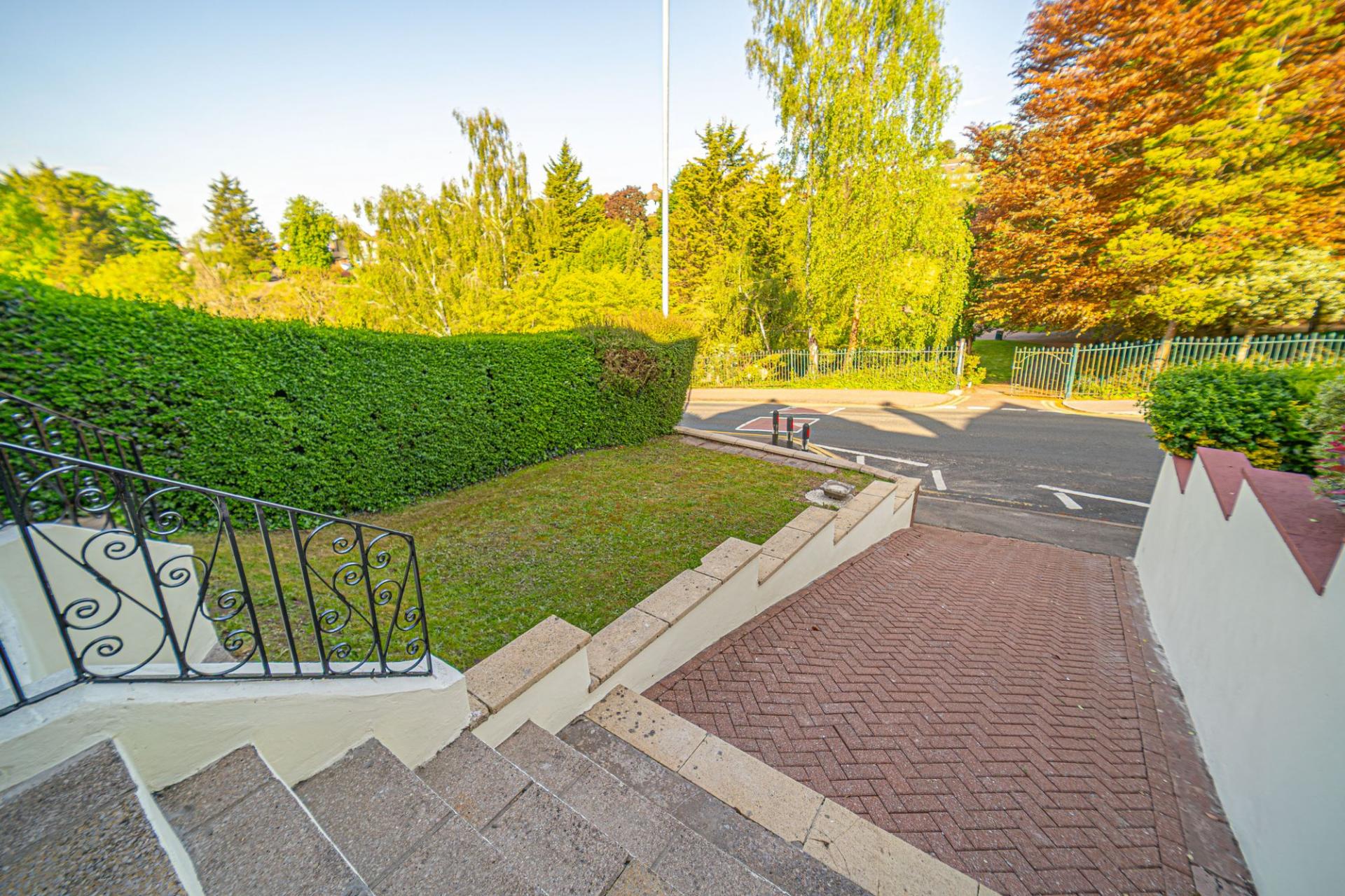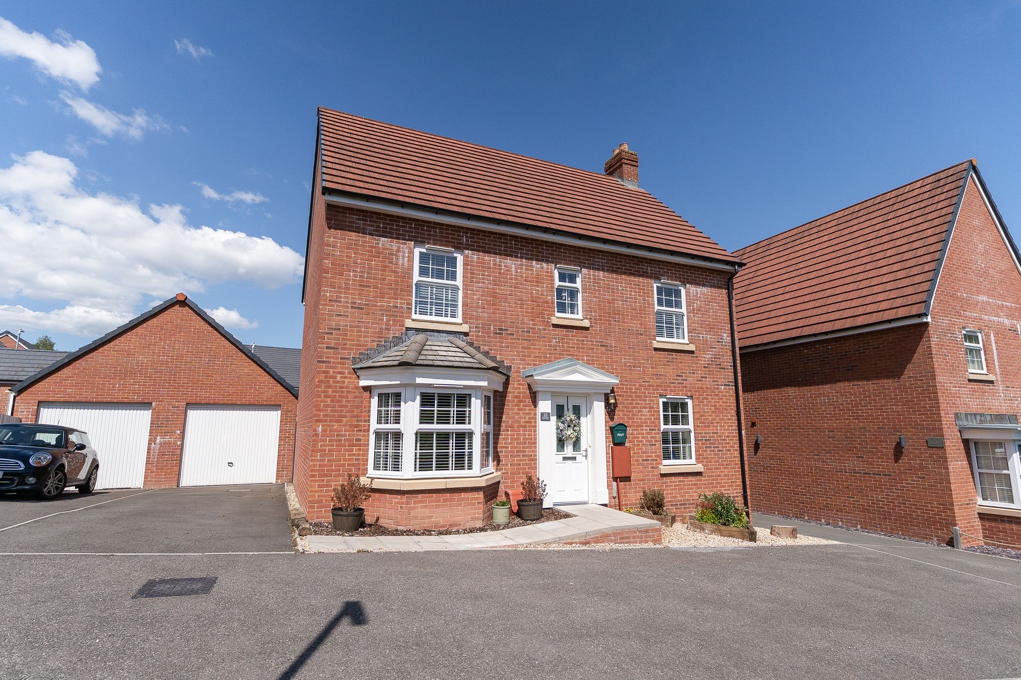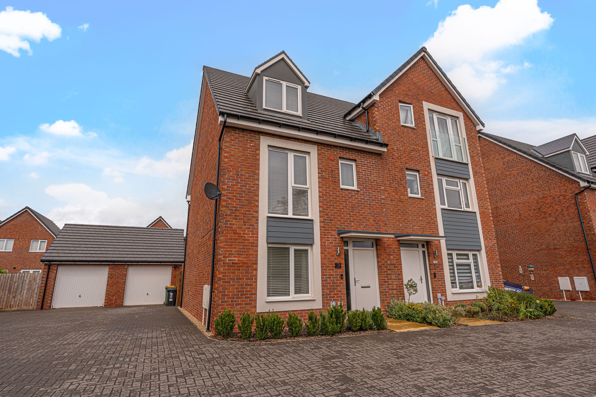 Stepping outside we have the rear garden, which comprises of a wonderfully low maintenance patio extending away from the house, adorned with an array of shrubs and ferns to create a gorgeous outdoor retreat, perfect for lounging in the sunshine, catching up with friends, or enjoying dining al-fresco style. Beyond the garden we can find a walkway shared by the neighbouring houses, which further connects to the property’s garage and driveway, providing excellent off-road parking and storage connecting to a private through-way to the roadside. At the front of the house we can find another great driveway that can park an additional 1-2 cars, while running parallel to a large grass lawn to welcome us to the property.