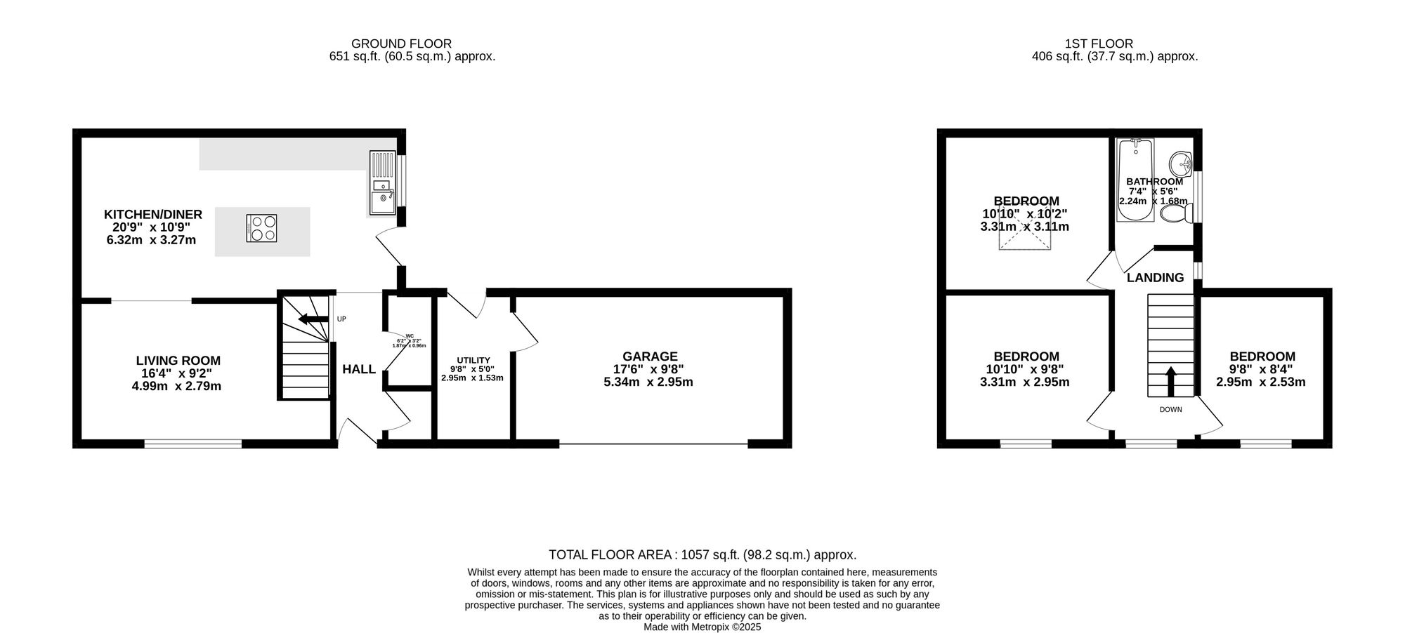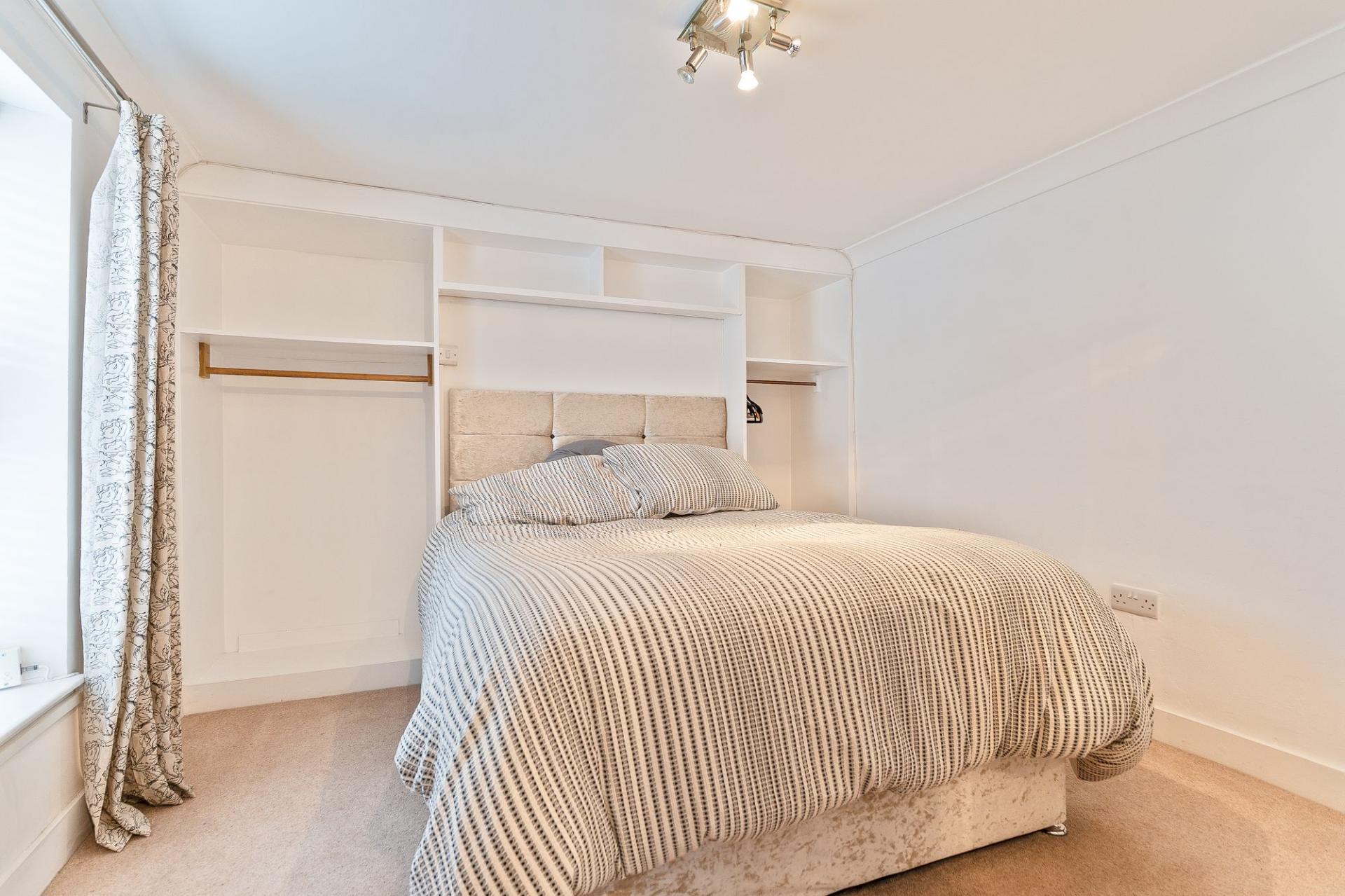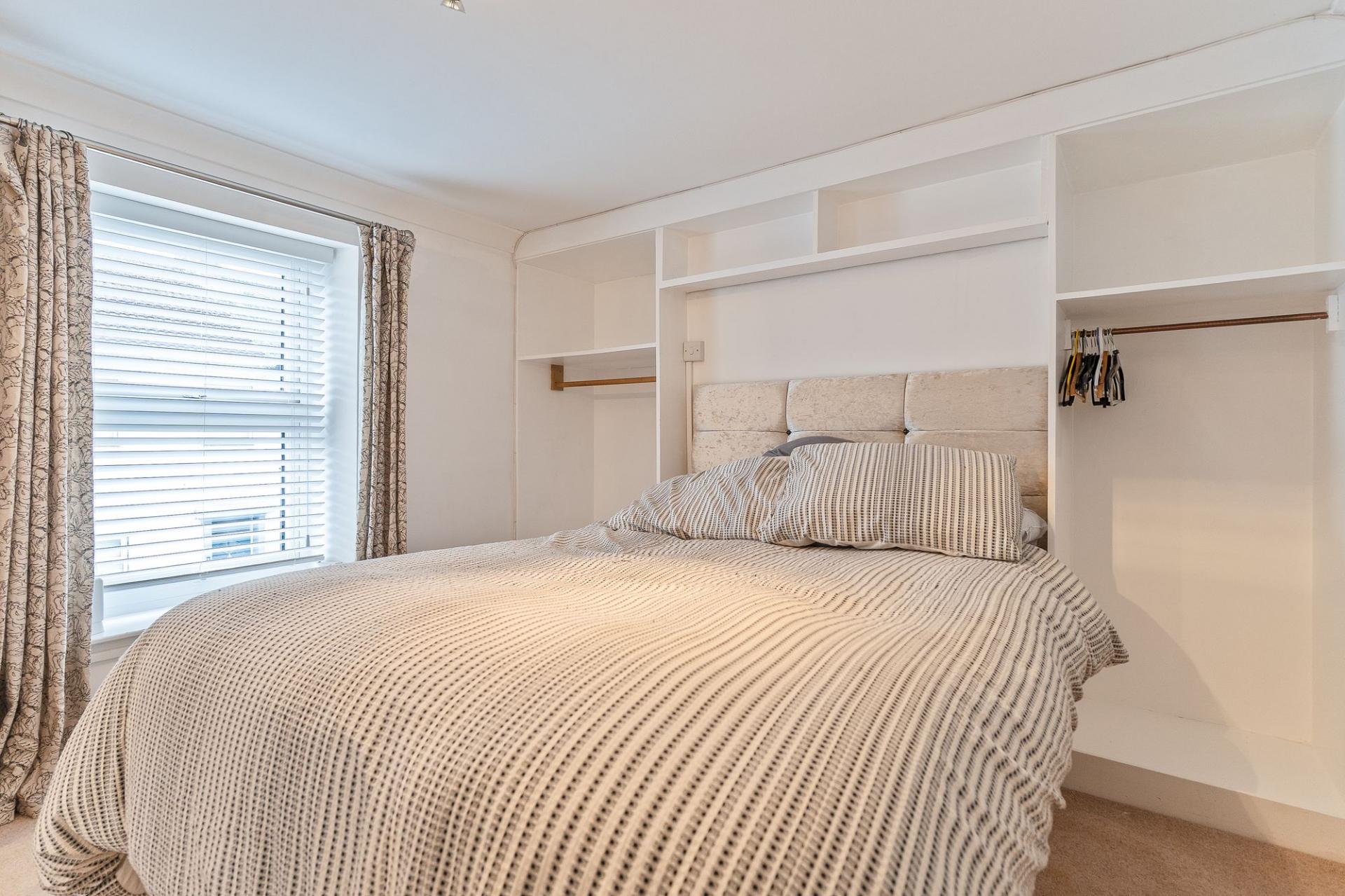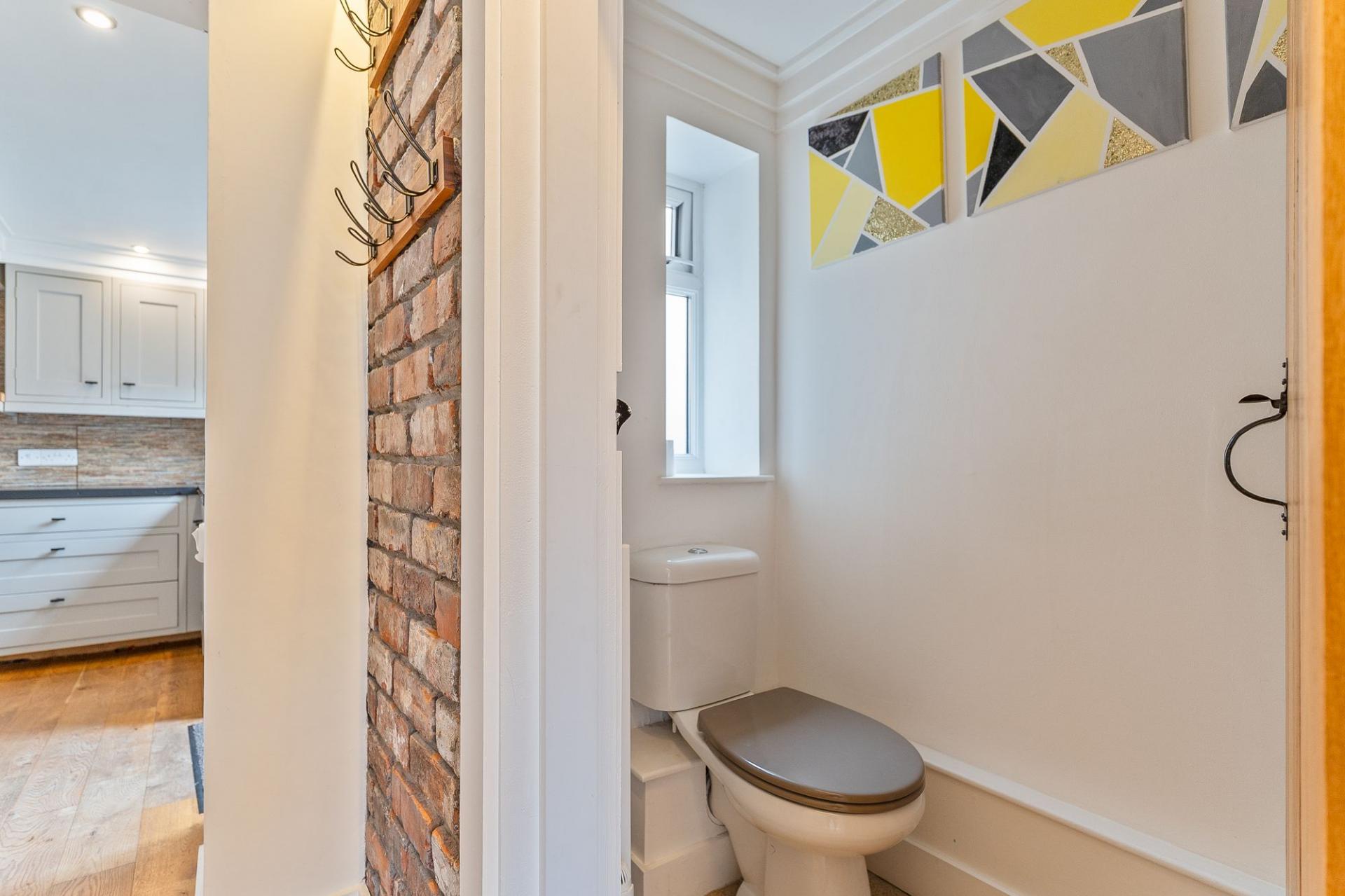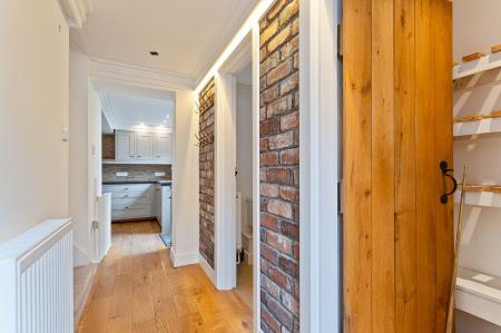 You enter the property through a welcoming hallway, which features a cloakroom and storage cupboard to the right and stairs to the first floor on the left. Continuing ahead, you enter the main living area — a bright and inviting kitchen/diner that opens seamlessly into the living room. The kitchen is well-maintained and thoughtfully designed, offering ample storage and workspace, with space for a dining table and chairs, making it ideal for family meals or entertaining. The living room is equally impressive, decorated in neutral tones and featuring exposed brick details that add character and warmth to the space. Large windows allow plenty of natural light to fill the room, creating a bright, open feel that’s perfect for relaxing or socialising.