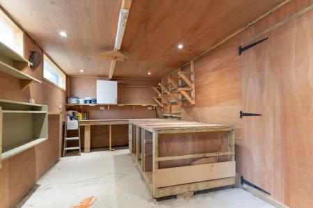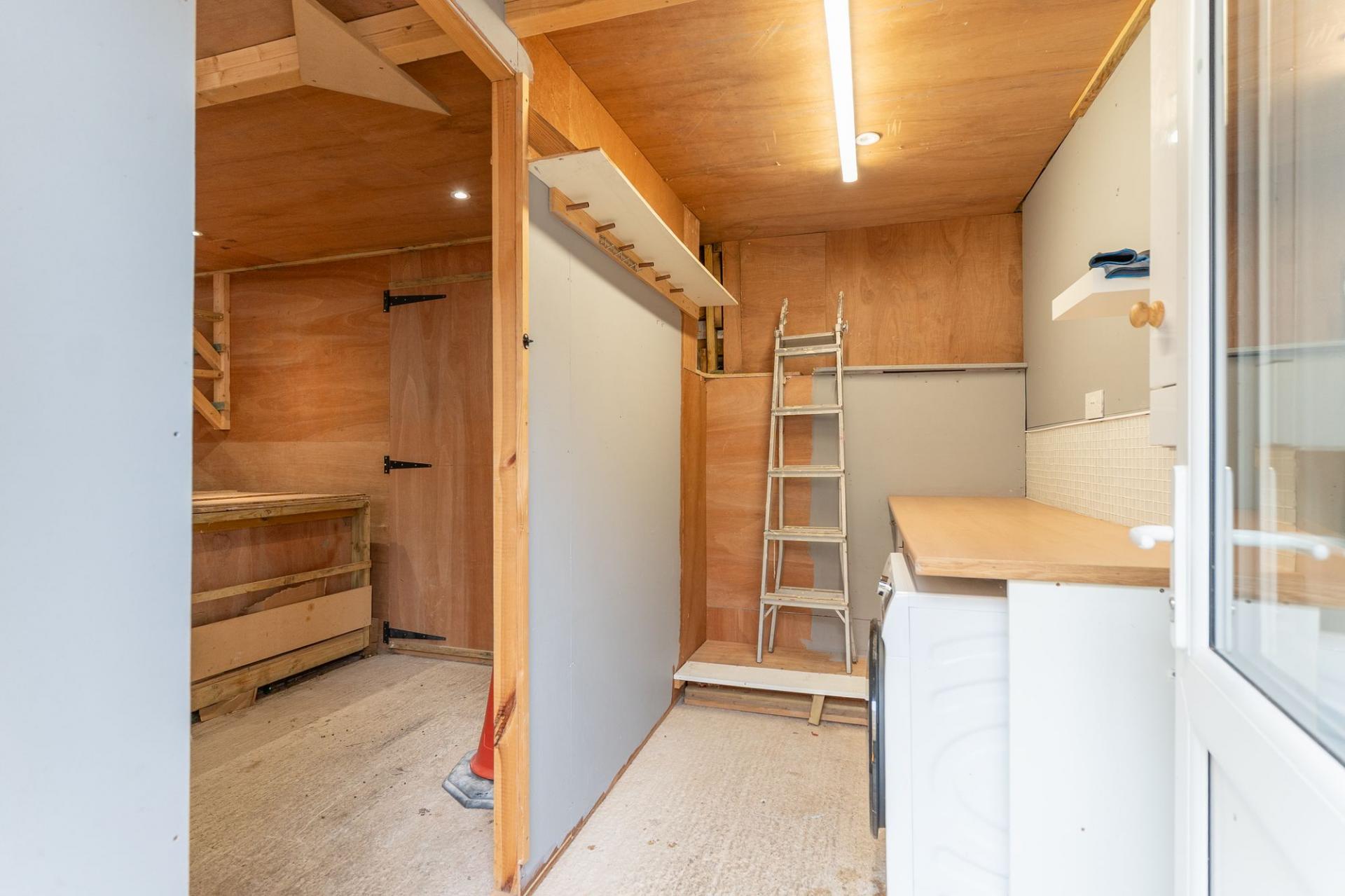 Externally, the property offers excellent outdoor and storage options. To the rear, there is an enclosed garden, featuring a raised patio area ideal for outdoor seating and dining. The garden provides a peaceful space to relax and enjoy during the warmer months. From the garden, there is rear access to the garage, which is currently utilised as a large workshop and utility area, offering versatility for storage, hobbies, or further development potential.