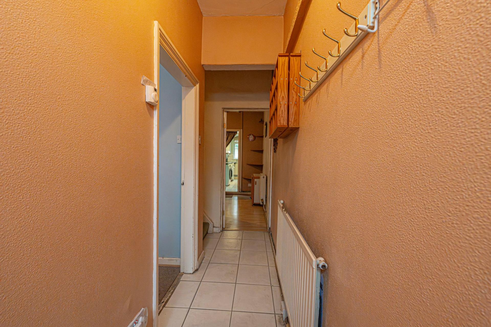 Ascending to the first floor we have the two bedrooms, which are both double in size. The primary bedroom is well lit by multi-aspect windows, and offers a great deal of space, with the secondary bedroom also offering great potential to double up as a home office and dressing room, thanks to the fitted shelving and clothes rails. From the hallway we can find additional storage space, as well as the family bathroom, featuring a bathtub, overhead shower, and a fitted airing cupboard housing the newly installed boiler.