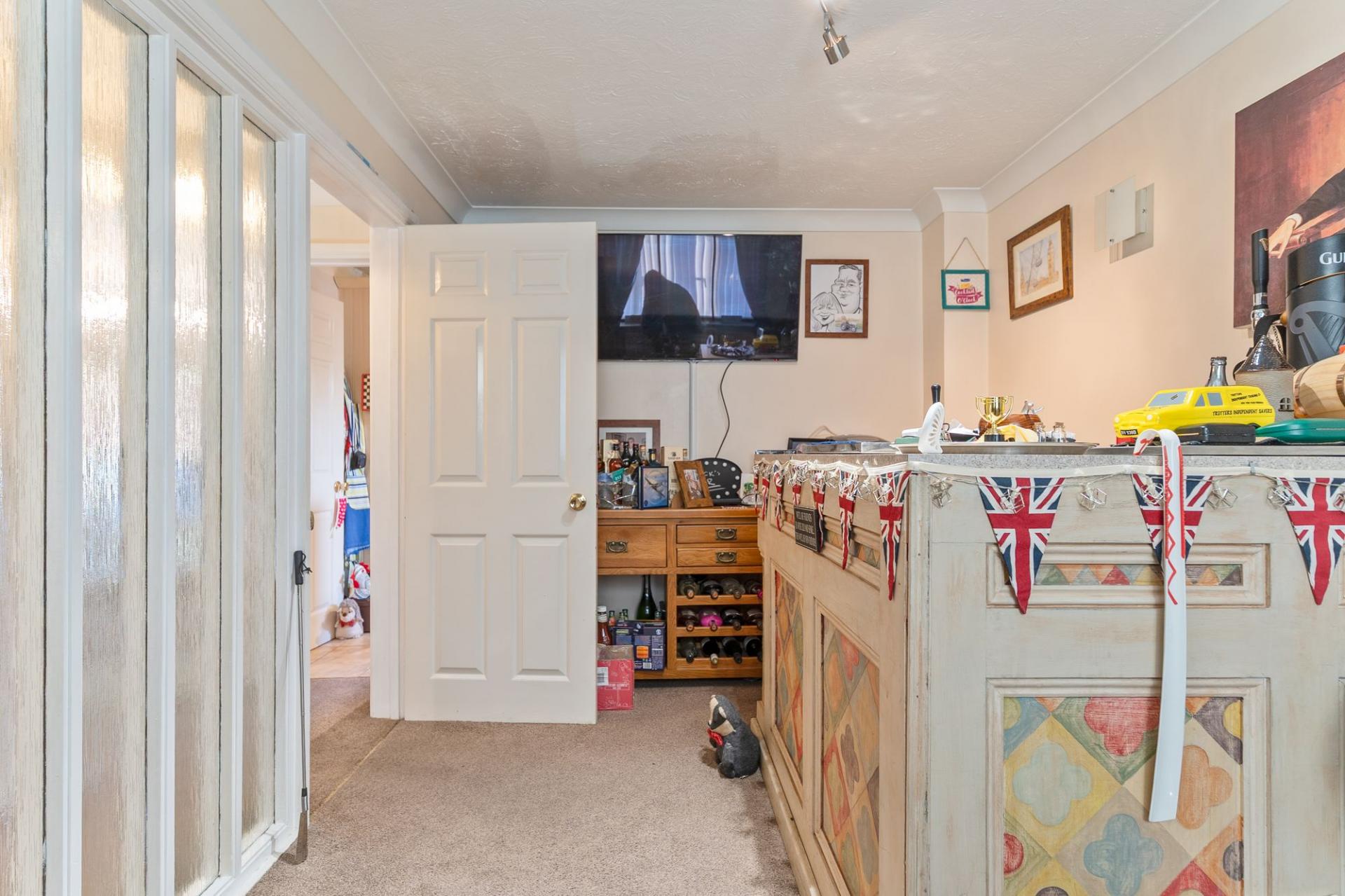 On the ground floor, you enter through a welcoming hallway with access to the main living areas, stairs to the first floor and a cloakroom conveniently positioned on the left. To the rear is the spacious lounge, a bright and comfortable room featuring patio doors that open directly out to the rear garden. Adjacent is the kitchen, offering generous floor and wall unit storage along with ample preparation space. Overlooking the front of the property is a second sitting room, currently utilised as a home bar but equally suitable as a snug or additional family room. To the front of the property we have the former double garage.