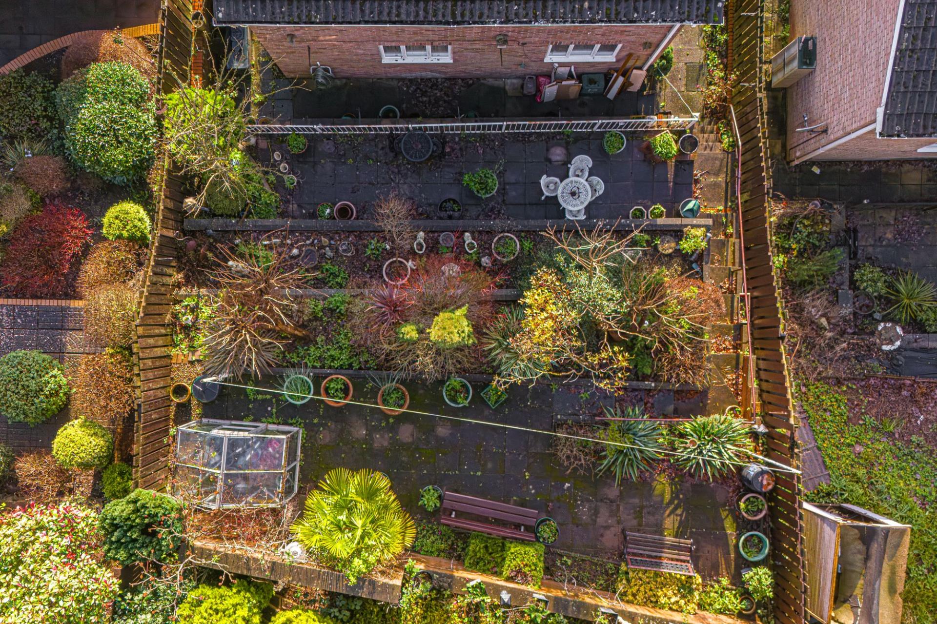 To the rear of the house we have the well-maintained gardens spanning multiple tiers at the rear of the house, including mature shrubs and ferns surrounding an abundance of seated patio areas, ideal for relaxation or welcoming guests for gatherings. Garden enthusiasts will appreciate the greenhouse and raised beds, as well as a great foundation for landscaping. Additional features include a double garage found at the base of the property, as well as ample off-road parking space with a large driveway. The property also features a stairlift for enhanced accessibility.