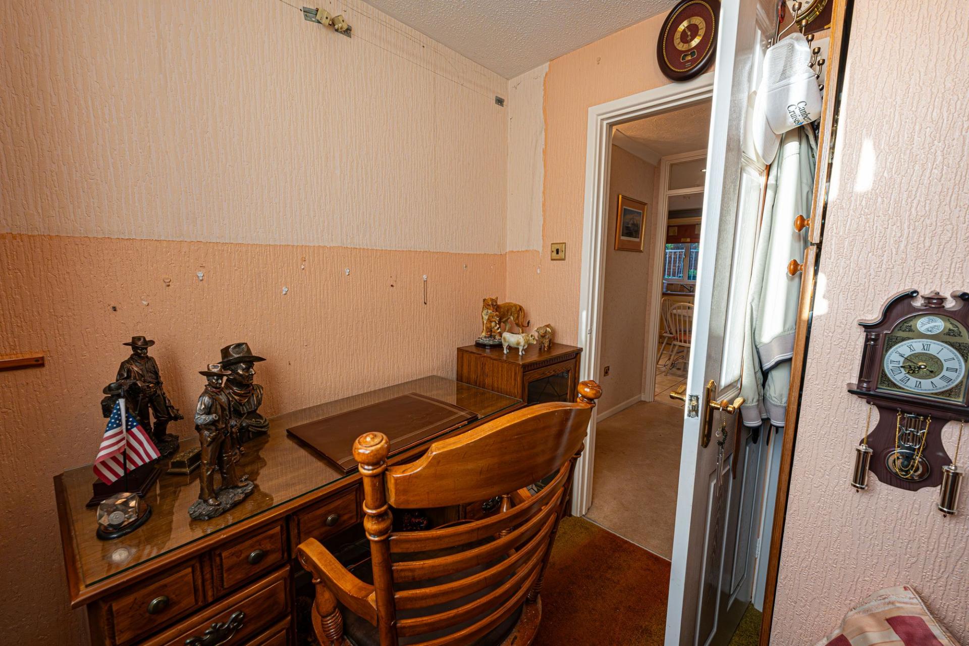 Ascending to the upper floor we can find four bedrooms, with a majority having access to fitted storage, and sharing a communal family bathroom from the hallway, as well as a convenient airing cupboard. Two of the bedrooms are comfortable single rooms, one of which is ideal for a home office or nursery, while the remaining two bedrooms are double in size, including the primary bedroom which has the added benefit of an en-suite shower room.