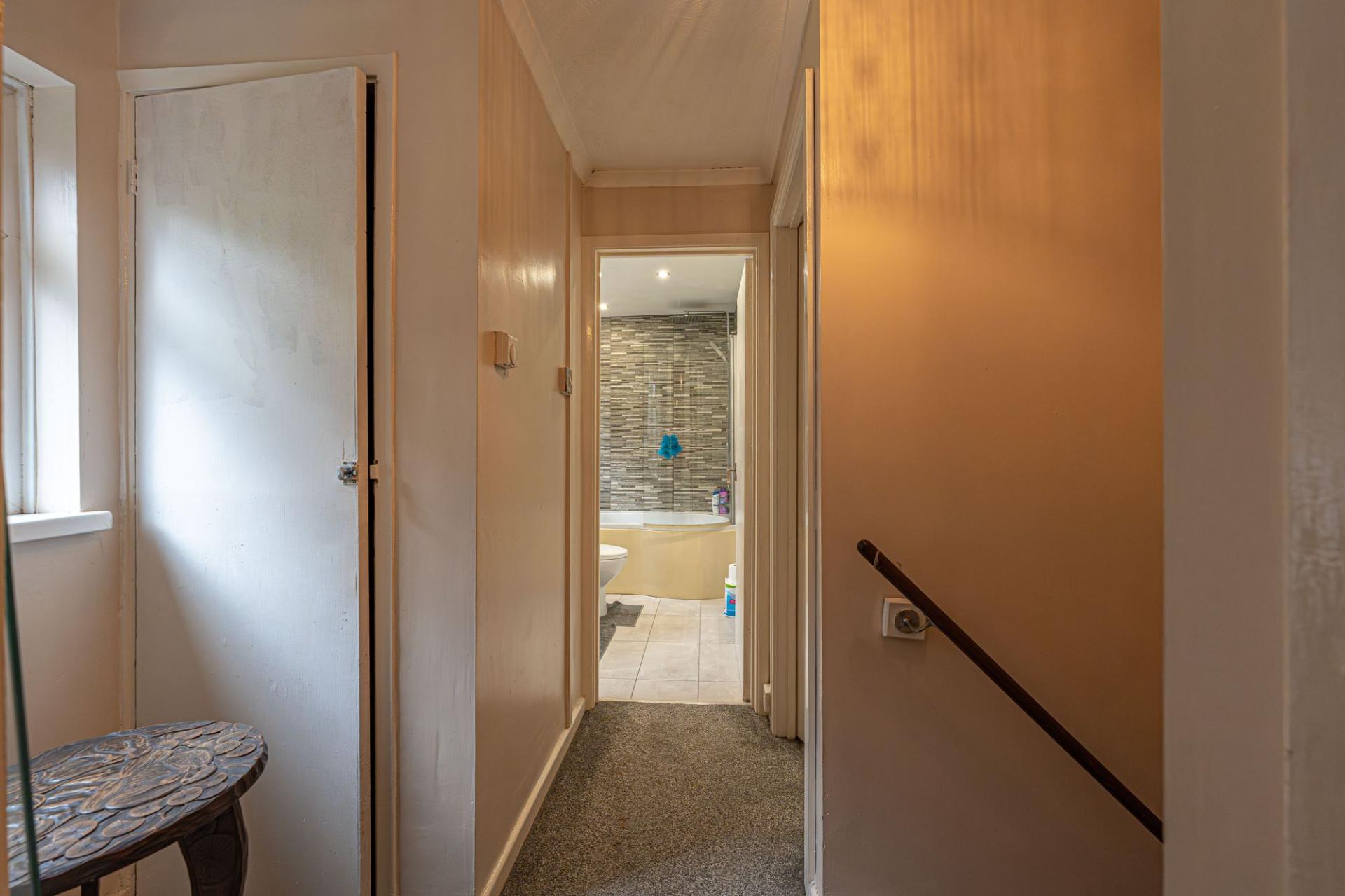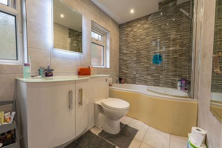 To the first floor we have three bedrooms, two of which are double in size, while the third is a comfortable single that could work well as a home office or dressing room. Two of the three bedrooms benefit from fitted wardrobes, while a communal closet can be found from the hallway, as well as the sleek family bathroom which offers a toilet, bath and shower.
