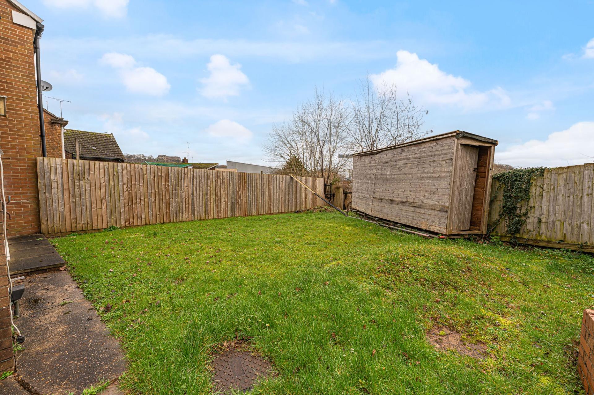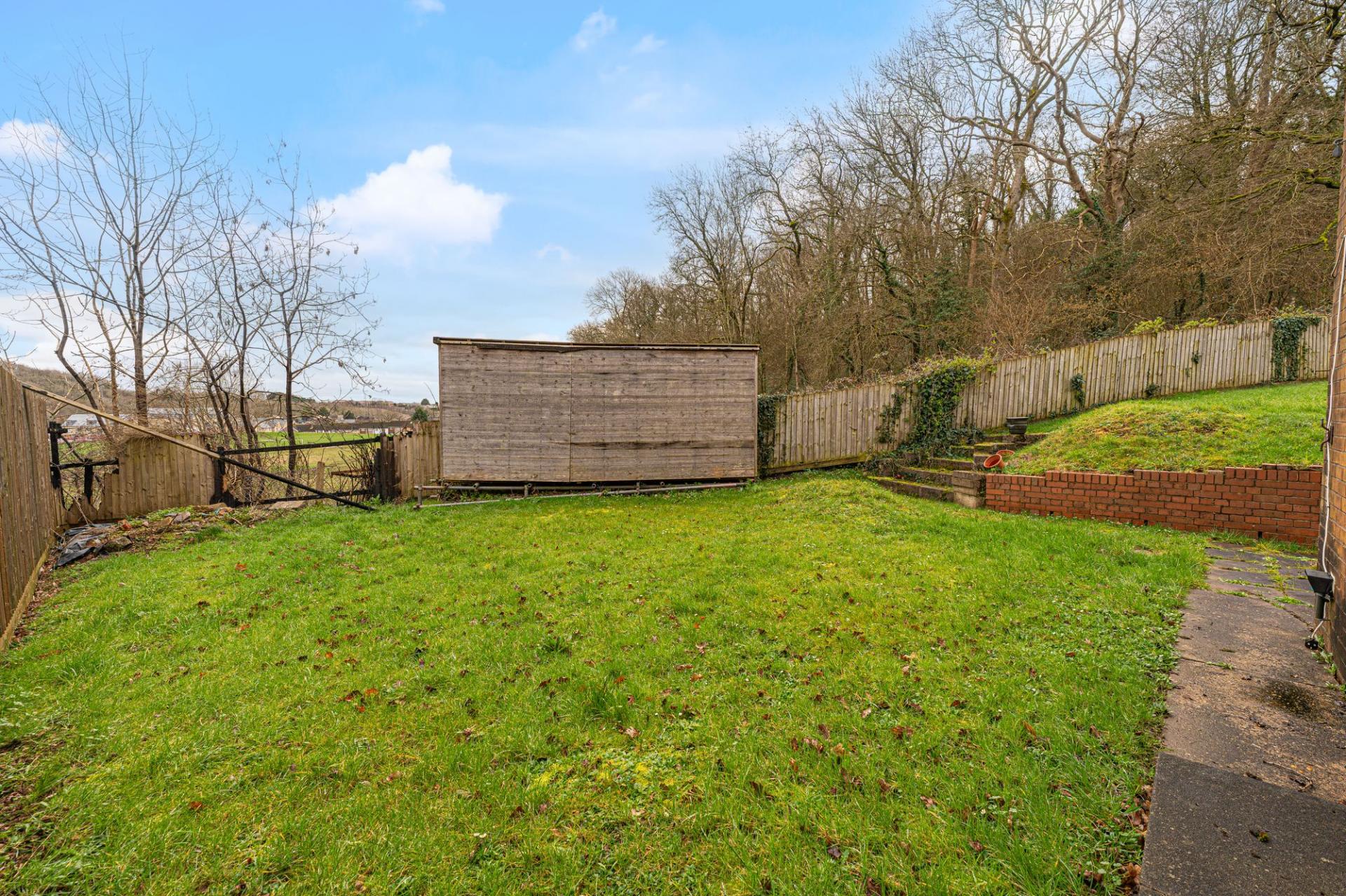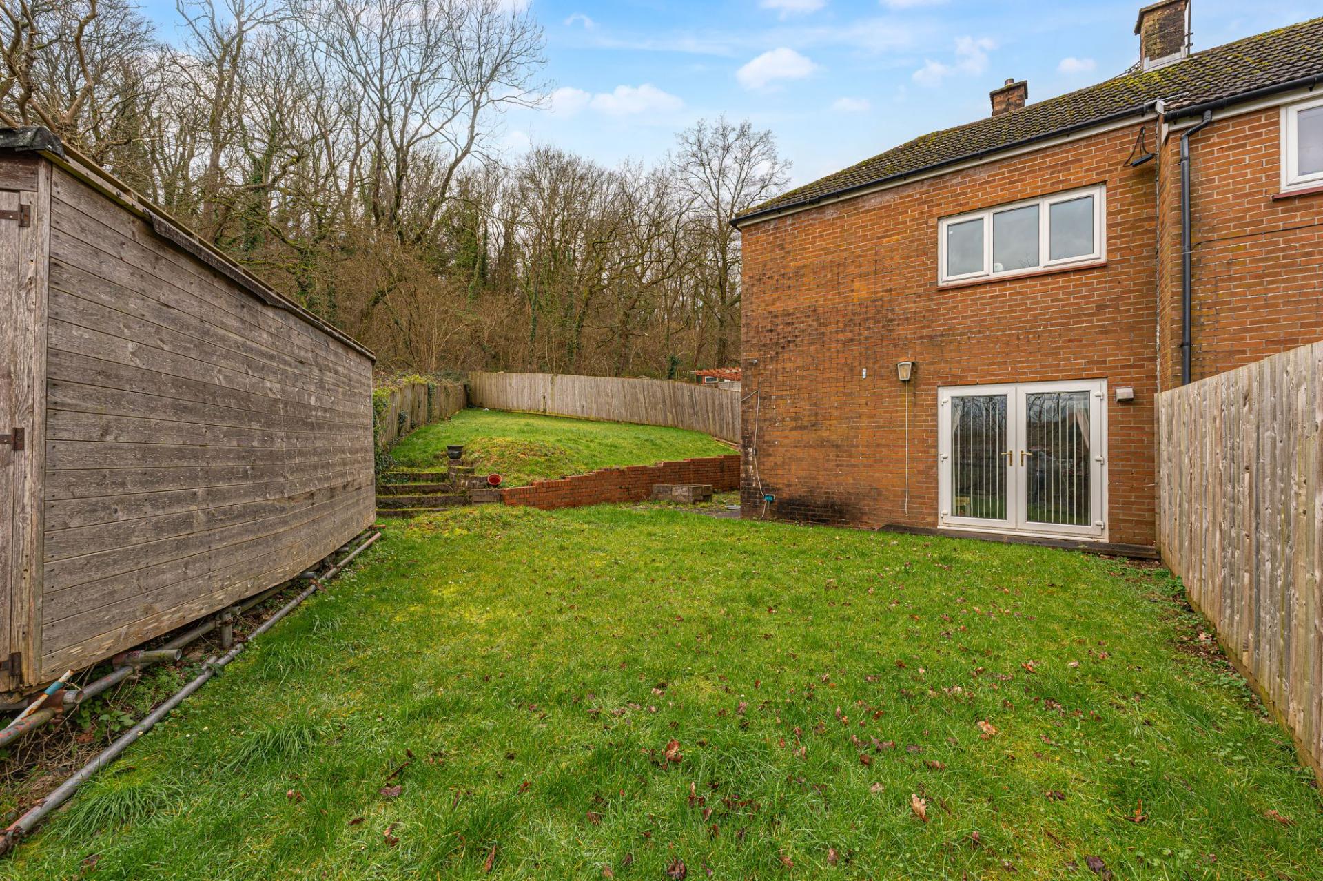 A major highlight of this home is the expansive garden, which sits on a sizeable corner plot that enjoys an abundance of outdoor space for residents to enjoy. The garden features a considerable lawn space at both the side and rear of the house, complimented by a patio area that is ideal for al-fresco dining and entertaining guests, while also offering a helpful storage shed. The garden is enclosed via a fenced boundary and framed by tall trees that provide a great sense of tranquillity.