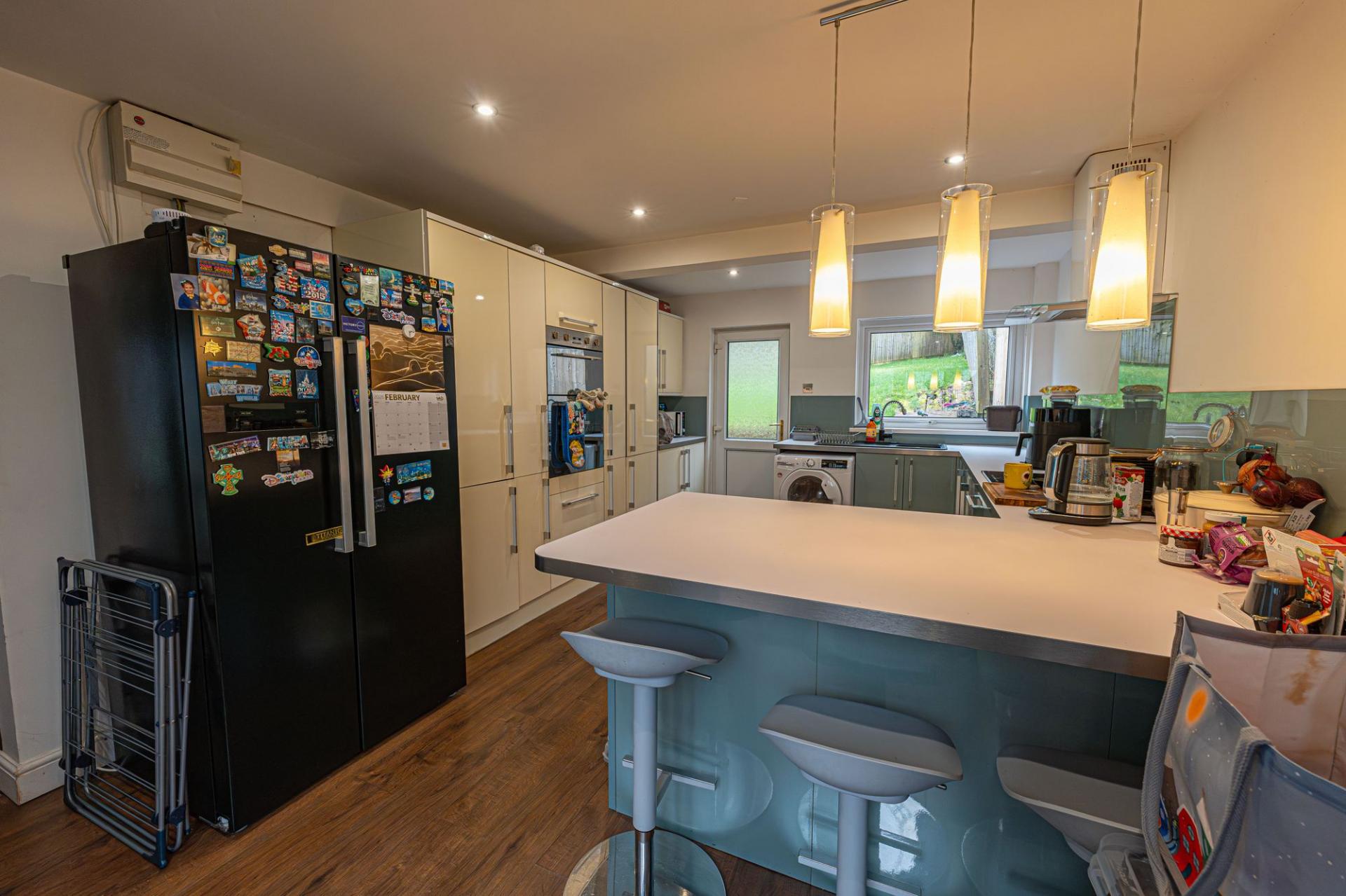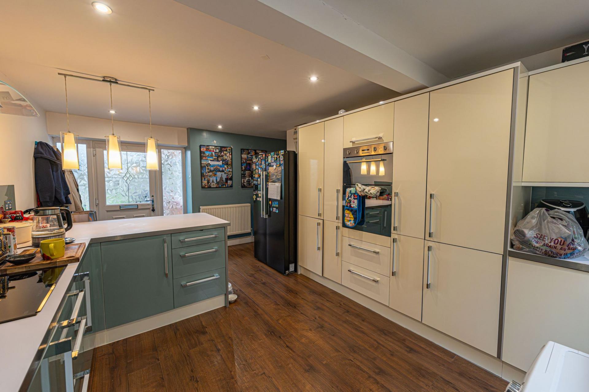 We enter this lovely family home to the stylish, modern kitchen, which offers ample storage fixtures, numerous integrated appliances and a charming breakfast bar for a causal dining experience. Neighbouring the kitchen is the spacious living room, which showcases a great space for relaxing and entertaining, while being lit up by sliding doors that effortlessly open to the garden.