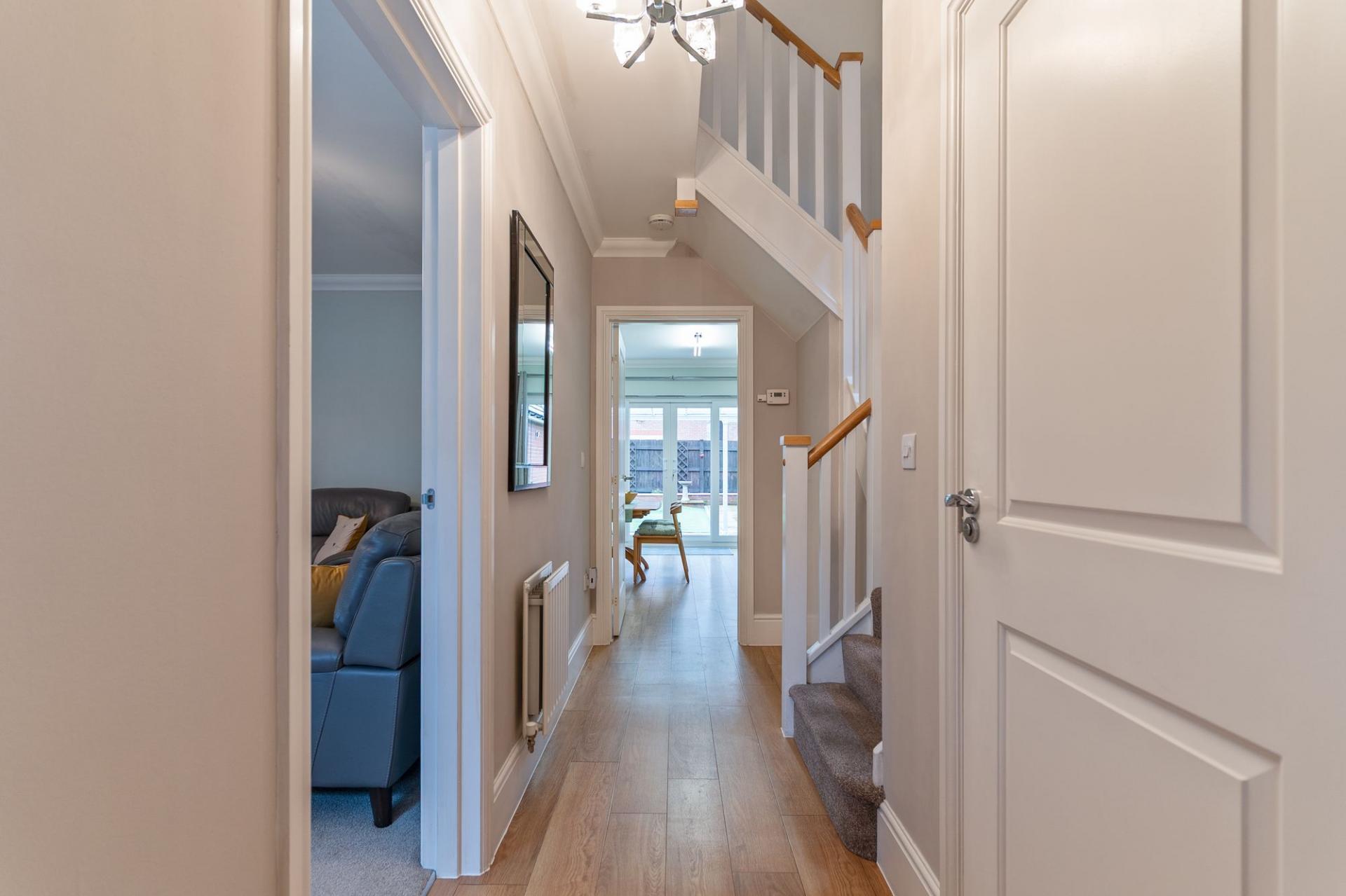 You enter the property through a spacious and welcoming hallway, with a convenient cloakroom located on the right, the main living areas ahead and the staircase leading to the first floor. To the left is a naturally bright living room, enhanced by stylish décor, offering ample space for a variety of seating arrangements. To the rear of the property is the impressive open-plan kitchen/family room, creating a sociable and versatile space ideal for modern family life. The large fitted kitchen provides an excellent range of wall and base units, generous worktop space and room for both seating and dining furniture. The room benefits from direct access to the rear garden and includes a useful utility cupboard for added practicality. The property also benefits from a CCTV system.