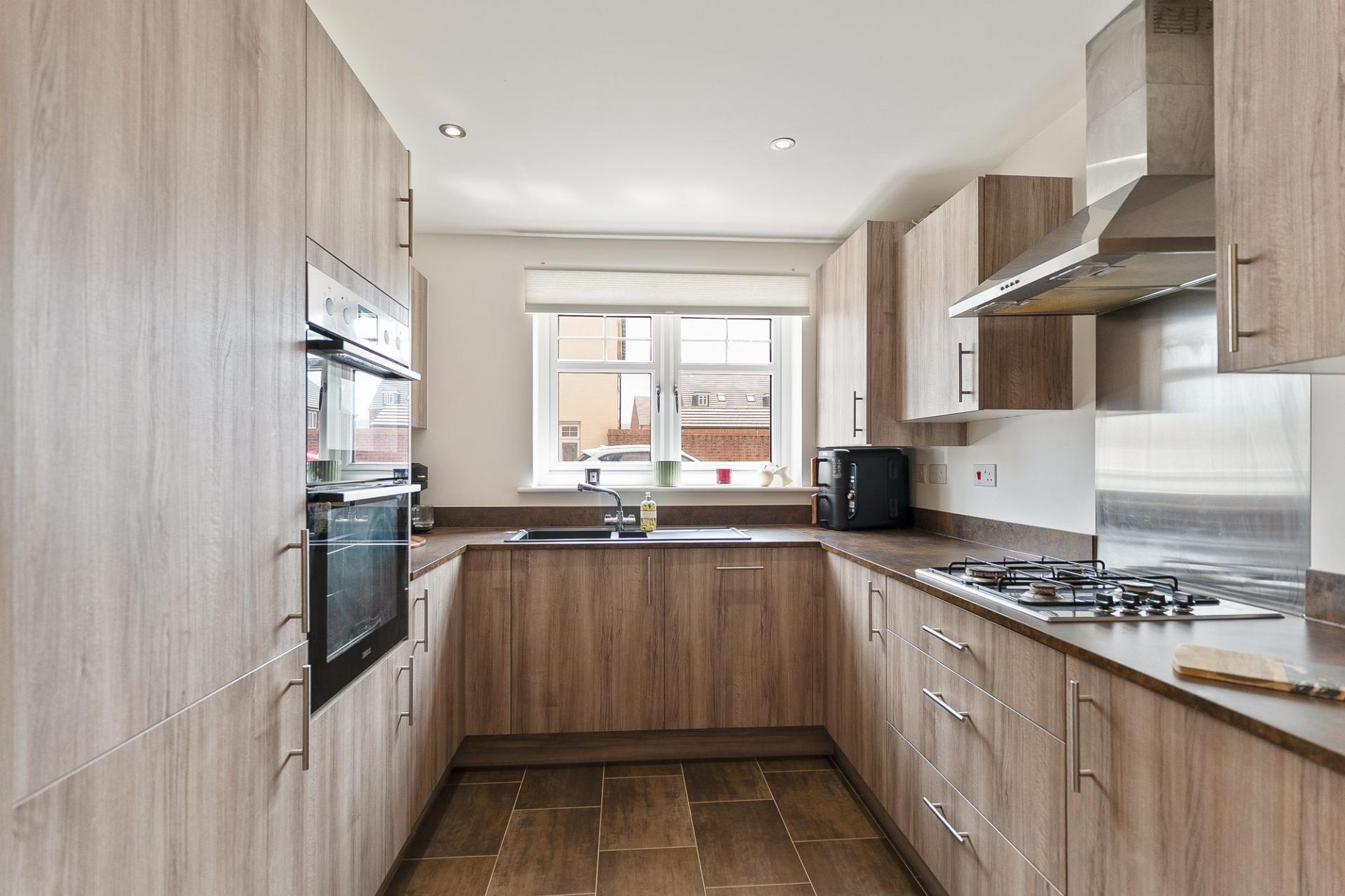 The ground floor of the property is well laid out and finished to a high standard throughout. A spacious entrance hallway gives access to the main living areas, a convenient cloakroom, and the staircase to the first floor. To the left, the stylish kitchen/diner features a well-fitted kitchen with integrated appliances, ample cupboard and worktop space, and room for a dining table and chairs—perfect for both everyday meals and entertaining guests. To the rear of the property is the bright and beautifully presented living room, a comfortable space with patio doors leading directly out to the rear garden, enhancing the sense of light and space.