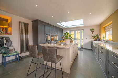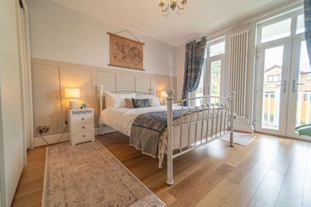 Descending to the ground floor we have the main living room, which is large in size, while neighbouring the bright dining room - with both rooms having access to the garden. Double doors from the dining room also open up to another reception room that is currently staged as a magnificent office, perfect for those looking for a dedicated space to work from the comfort of your own home. This room also offers the potential to be used as the fifth double bedroom. The impressive kitchen can also be found from the ground floor, and is designed to an impeccable standard, featuring a huge array of storage from the countless pull out drawers, and a kitchen island that features a charming breakfast bar for those casual breakfast mornings. Throughout the kitchen we can find a wealth of integrated appliances, including 2 full height fridge/freezers, 2 Neff Slide and Hide Ovens, a Neff Microwave combi oven, plate warmer, Bosch dishwasher, and a linear 4-ring gas hob. Also found from in the kitchen is an electric heater, a Belfast double sink, a pull out pantry, fitted bin storage and a boiling hot water tap. A helpful utility room can also be found just outside the kitchen, as is the family bathroom, featuring a wet room design with underfloor heating, as well as access to both a rainfall shower and a bathtub,