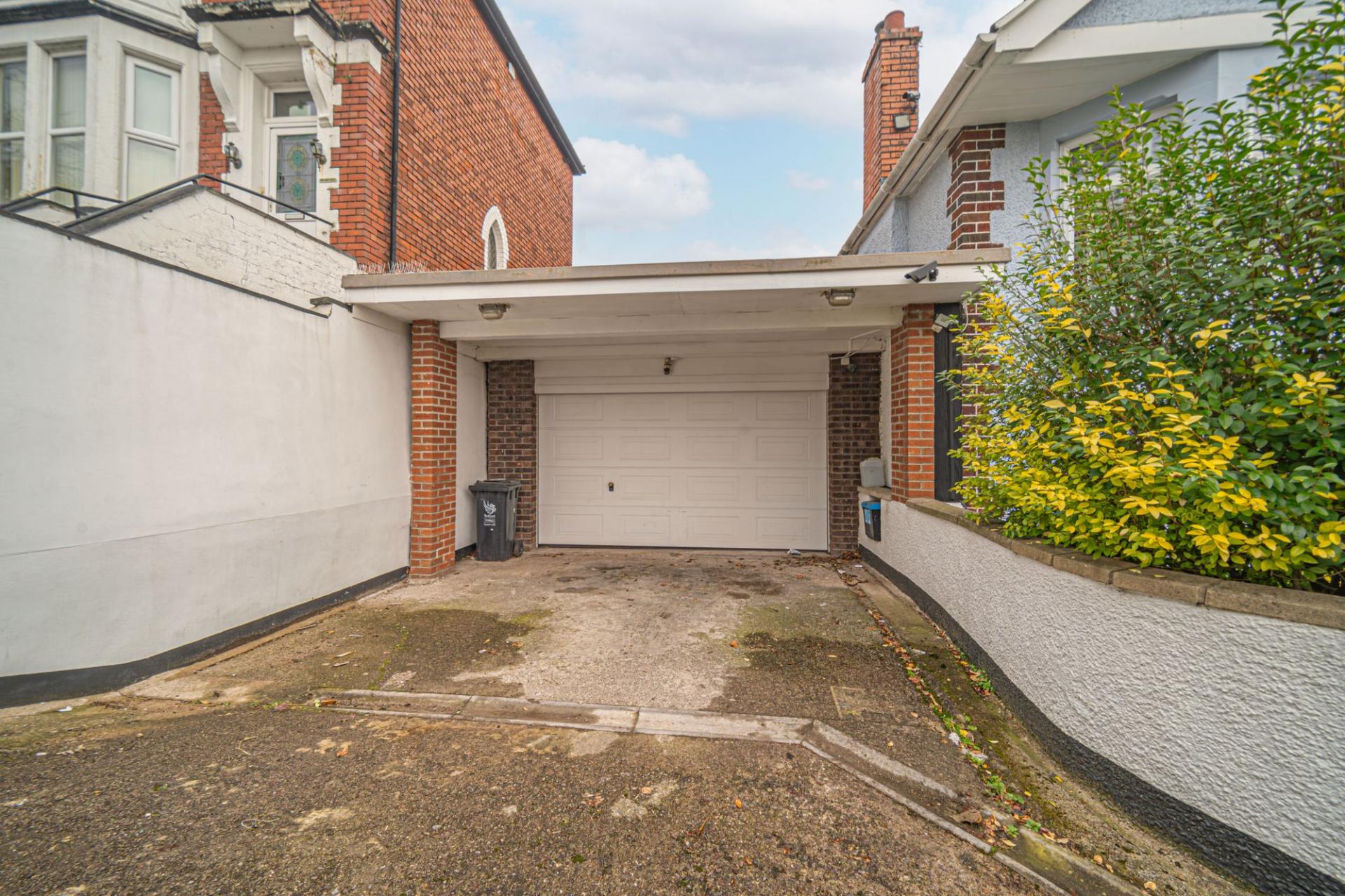 Stepping outside we have the expansive garden, which is fully enclosed and surrounds the property from the rear, down to the gated driveway to the side of the house, which can park at least 2-3 vehicles. The garden consists of a harmonious blend of tiled patio and grass lawn, with numerous spots to relax in the fresh air, as well as an abundance of space that is well suited to welcoming visitors and enjoying a wide range of activities, such as sunbathing, al-fresco dining and family games. From the garden we can find a beautiful water fountain, as well as a stairwell to the double garage, providing sheltered parking or overflow storage space. The garage can also be accessed from near the front of the house, where we can park a further two vehicles, ensuring plenty of convenient parking space for the whole family.