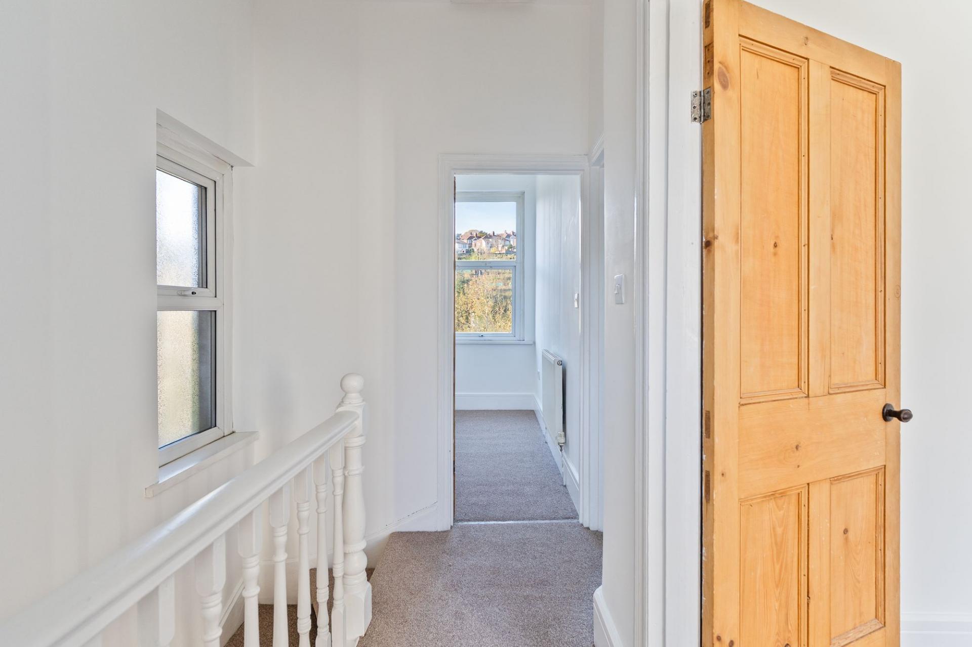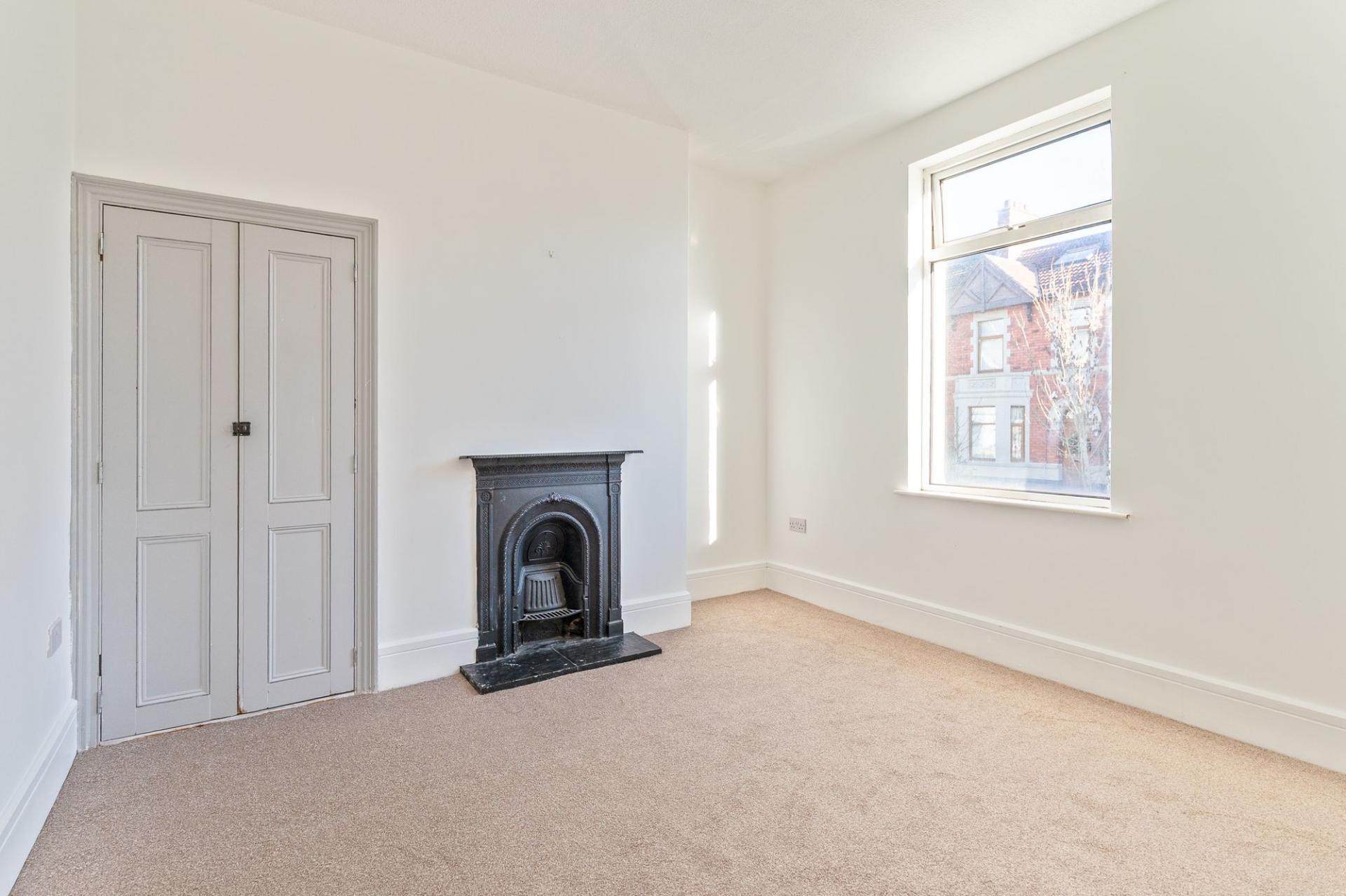 On the ground floor there is a bay-fronted living room and a spacious, open plan kitchen/diner to the rear. The contemporary kitchen is a fantastic entertaining space, with stylish base and wall units and integrated appliances to include an oven and fie-ring gas hob. Double doors from the kitchen open to a balcony, enjoying the lawned garden below. The property benefits from original features such as the ornate feature fireplace in the dining space and tiling to the hallway. There is a downstairs shower room with a walk-in shower and two storage cupboards beneath the stairs. On street parking is available to the front.