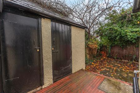 Stepping outside we arrive at the rear garden, which features a spacious patio area, which is wonderfully low maintenance and great for lounging and entertaining in the fresh air. The garden also features a deck connecting to the house, where further storage is accessible from the outbuilding. On road parking is also available directly outside the home.