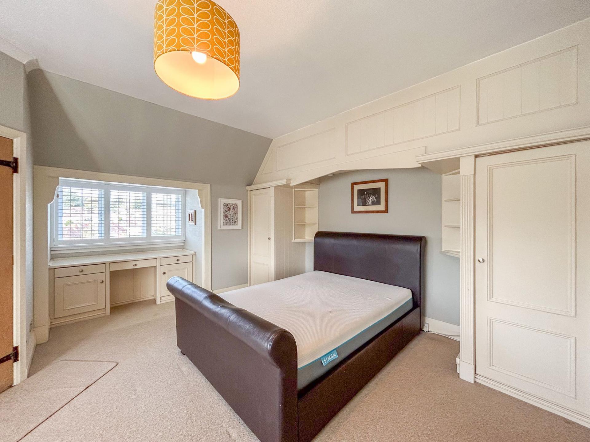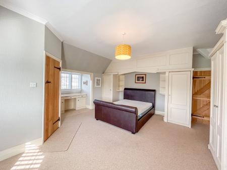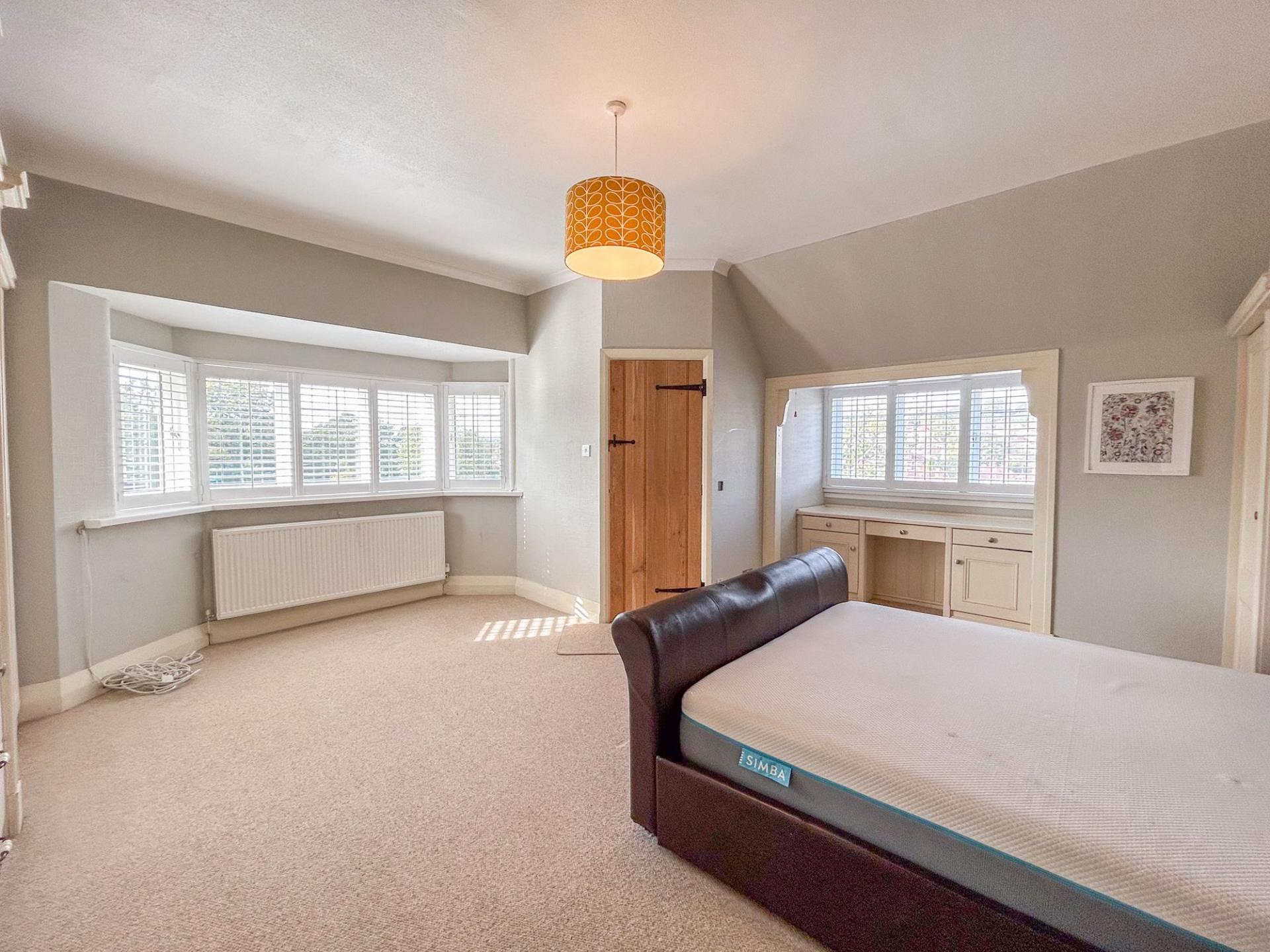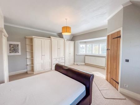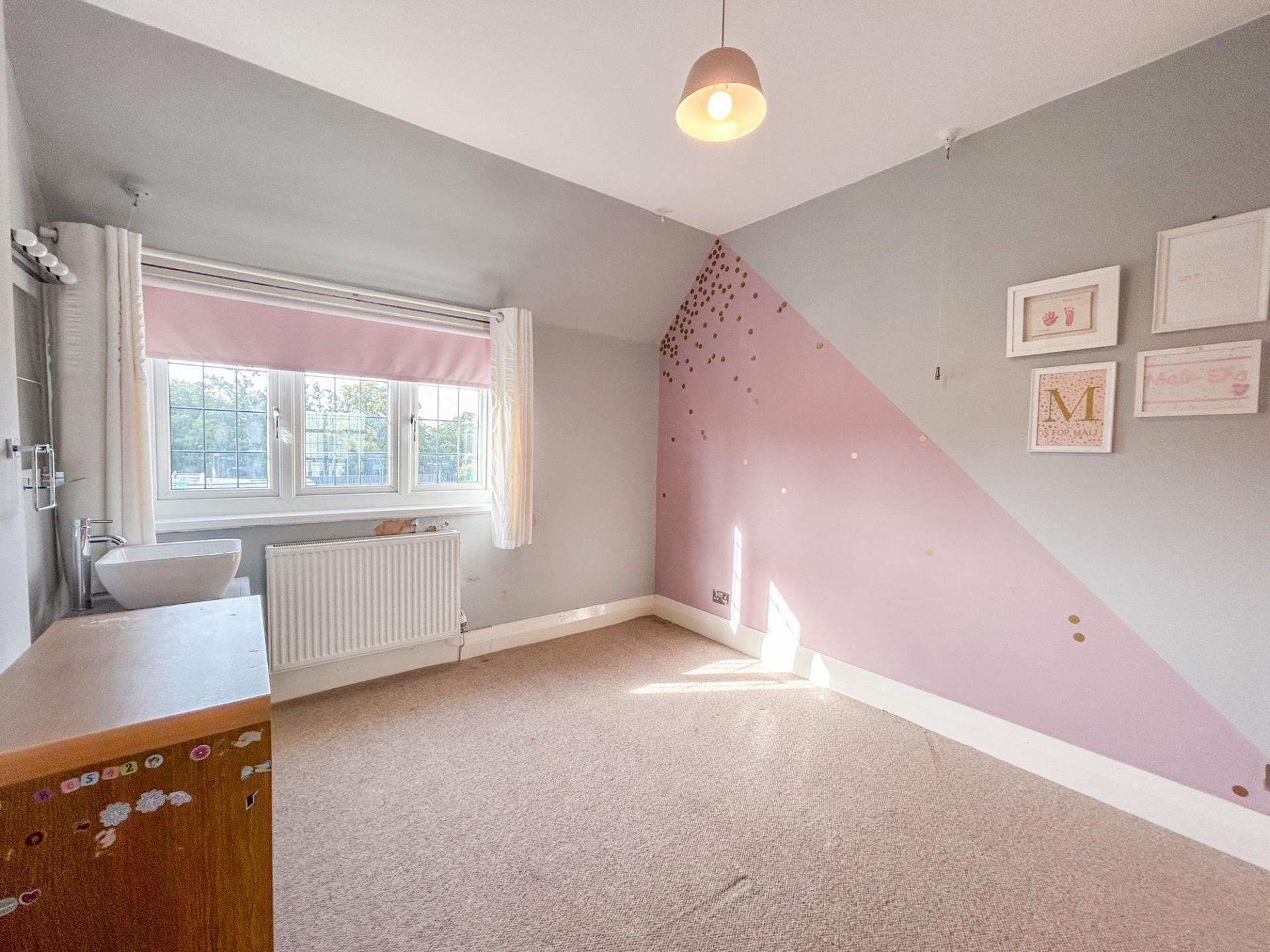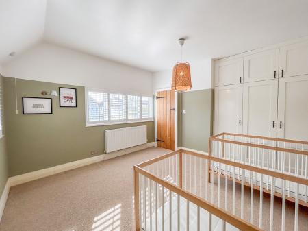 To the first floor there are five bedrooms, all of which are generous double rooms. Four of the bedrooms benefit from fitted storage, ideal for utilising space. The principal and second bedrooms both enjoy ensuite shower rooms, while the family bathroom has a large bath suite and ambient floor lighting. The principal bedroom has a bay-window, mirroring that of the living room below, with a quaint, secondary bay-window, where a dressing table fits perfectly.
